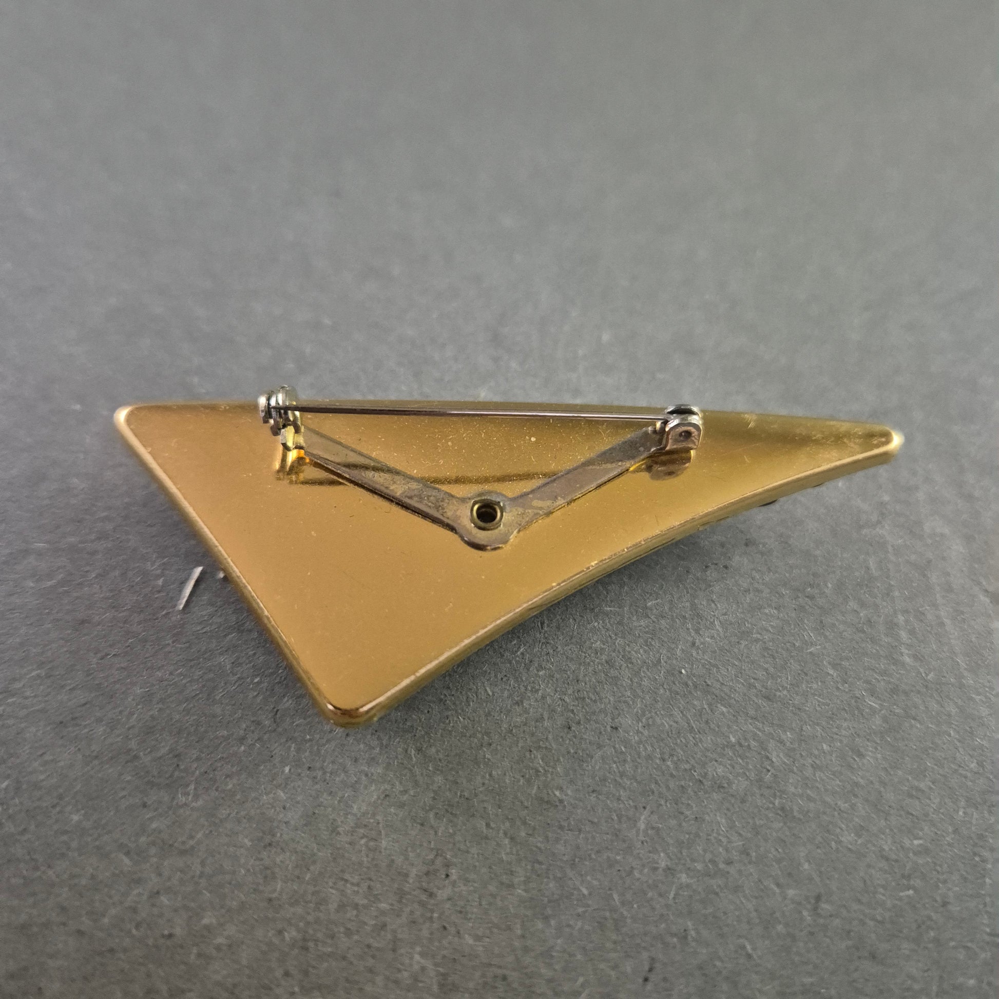 Diese einzigartige Vintage-Brosche (Artikel FES2441) besticht durch ihre ungewöhnliche, dreieckige Form und detailreiche Oberfläche. Auf einem goldfarbenen Metallgrund sind organisch geformte Elemente befestigt: ein Blatt, geschwungene Schnüre und kleine Perlen- und Kristall-Akzente in facettenreicher Anordnung. Der Kontrast von glattem Untergrund und reliefartiger Verzierung verleiht dem Stück einen künstlerischen, fast skulpturalen Charakter.