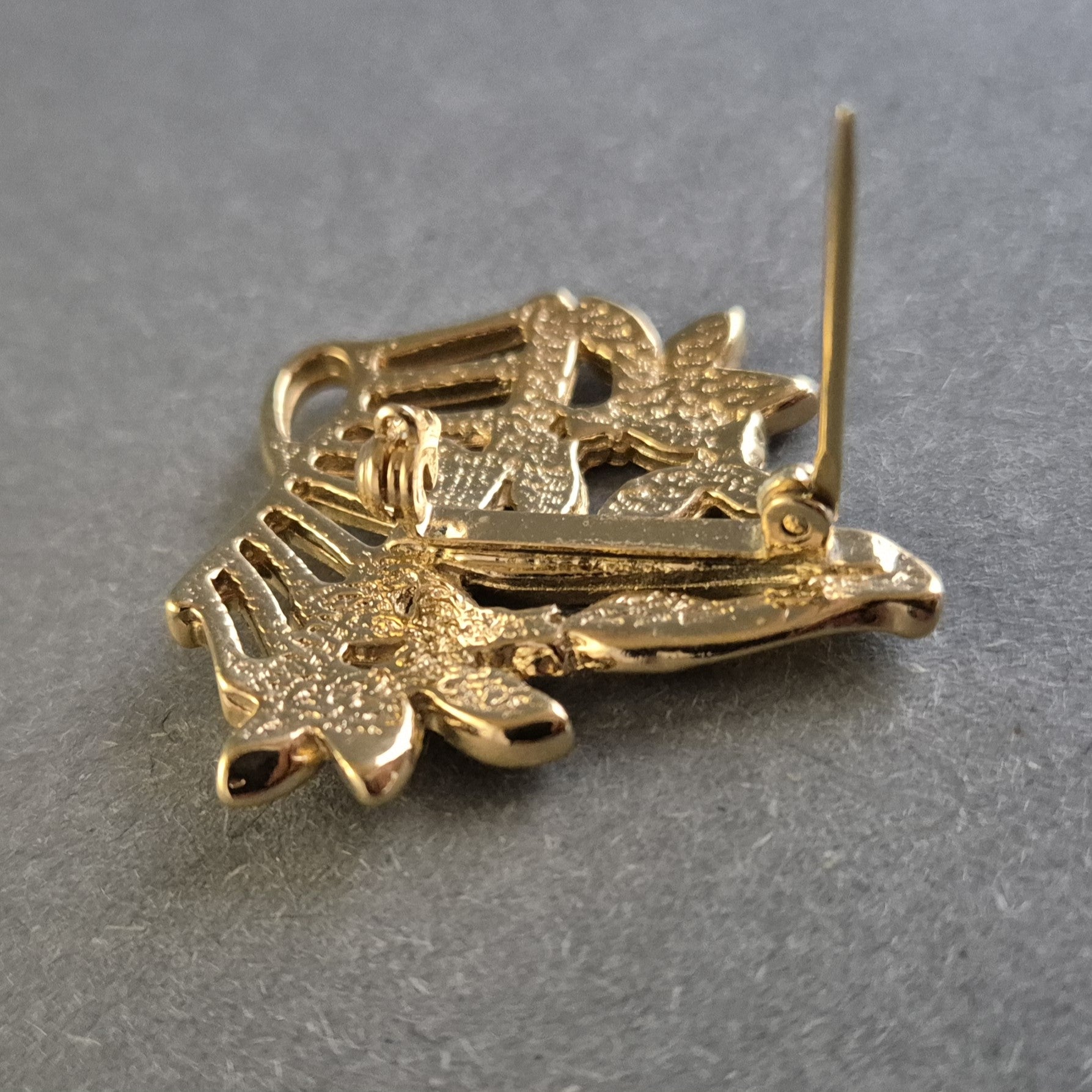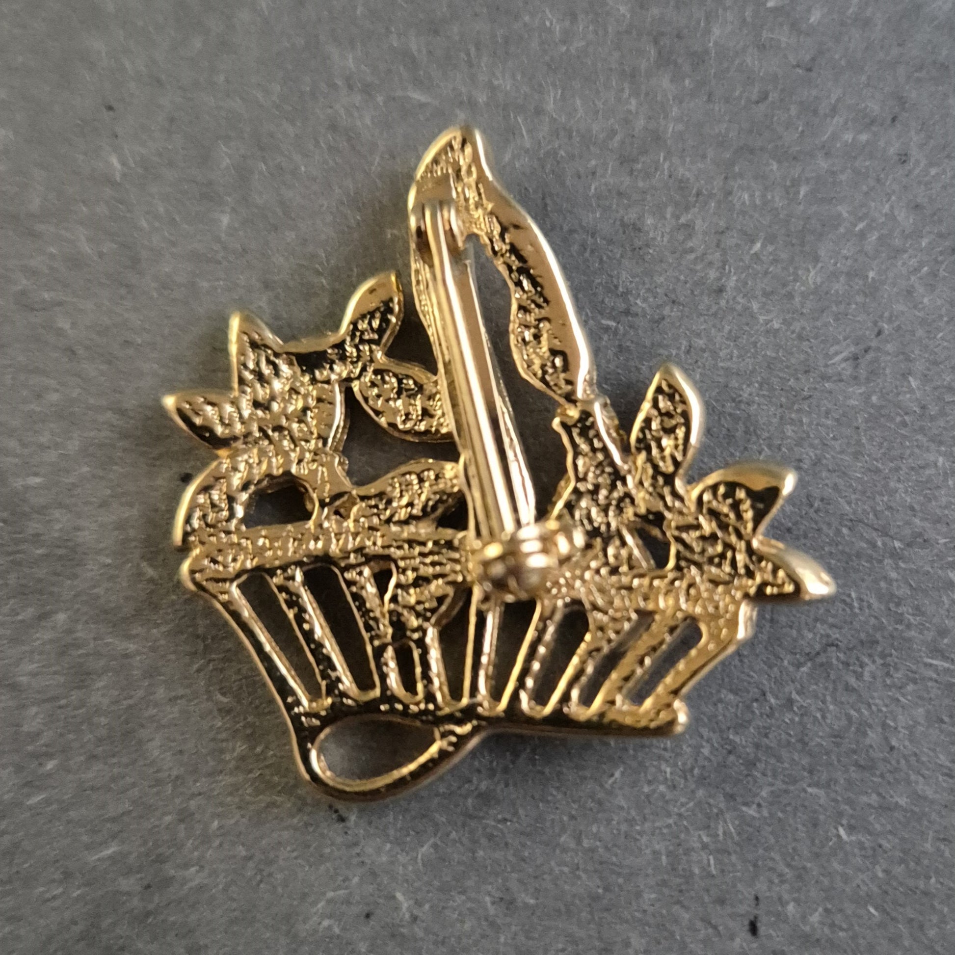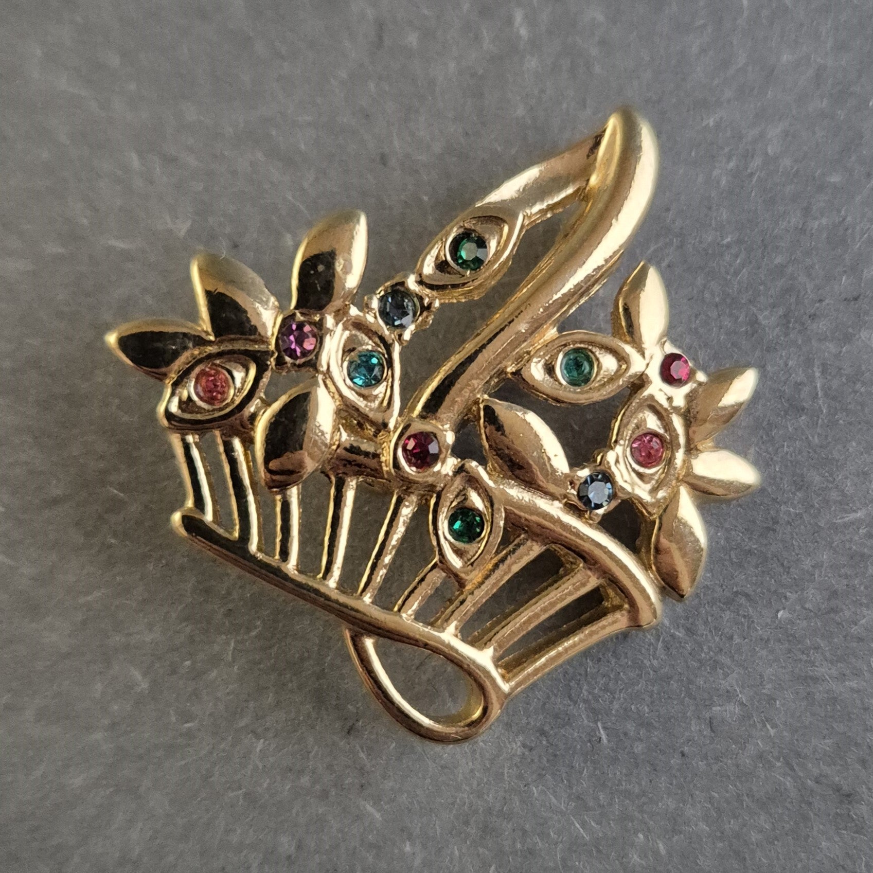 Diese zauberhafte vergoldete Brosche in Form eines Blumenstraußes ist ein wunderschönes Vintage-Schmuckstück. Die filigrane Gestaltung mit funkelnden, mehrfarbigen Steinen verleiht ihr eine elegante und feminine Ausstrahlung. Dank der stabilen Broschennadel kann sie sicher an Blusen, Jacken oder Schals befestigt werden. Ein stilvolles Accessoire für Schmuckliebhaber.