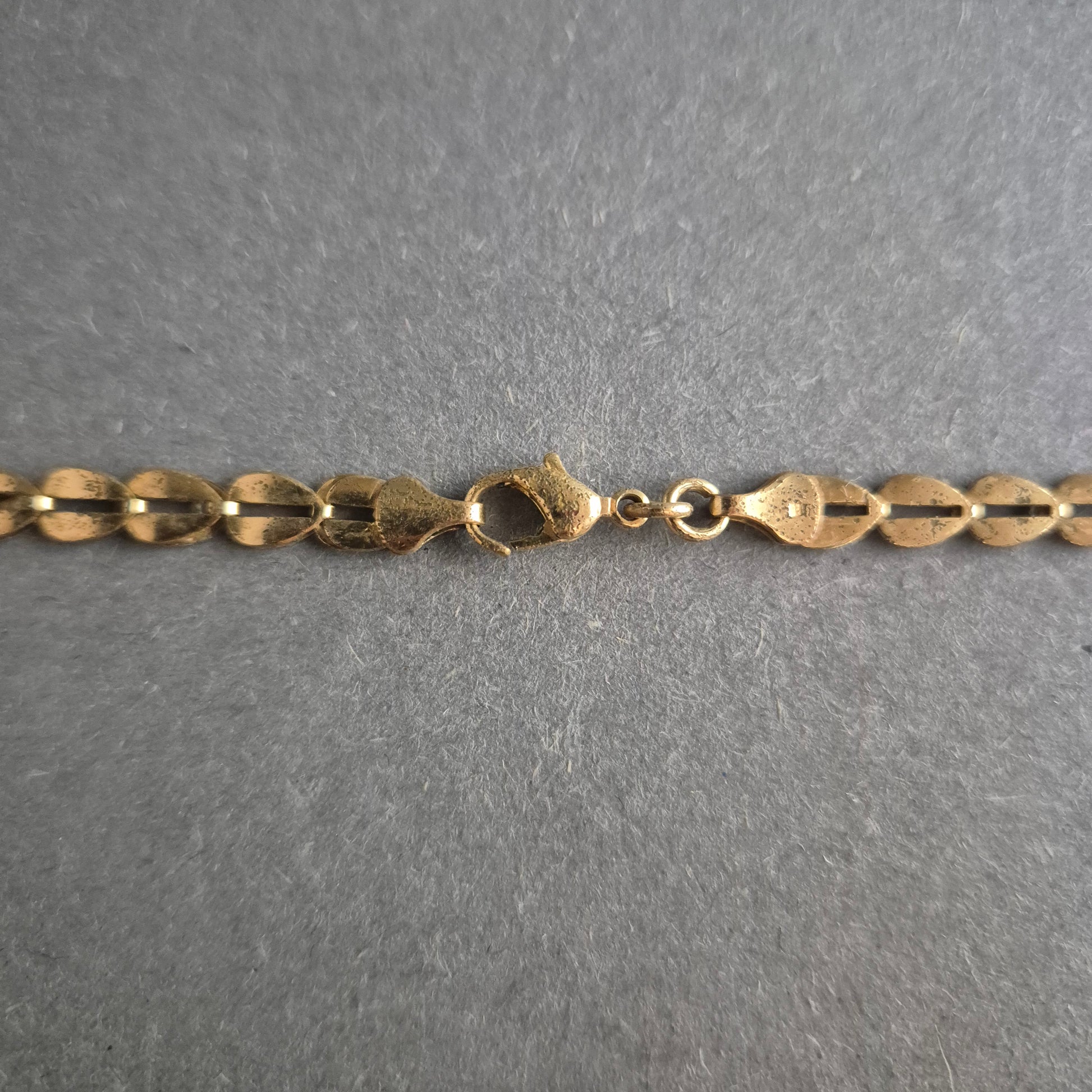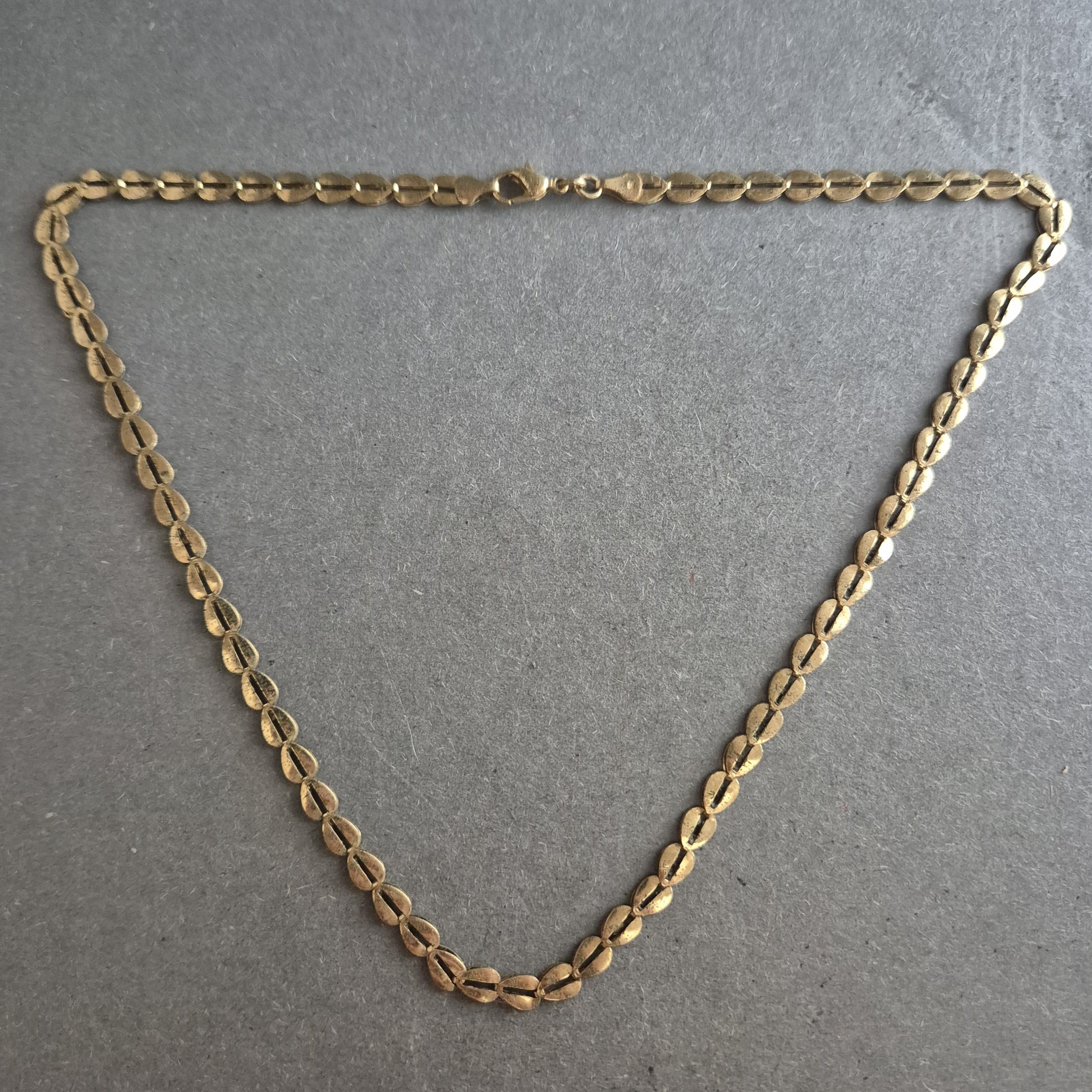 Diese stilvolle Halskette besticht durch ihre außergewöhnlichen Glieder in Blättchenform, die ihr eine besondere Struktur und Optik verleihen. Die mattierte Oberfläche sorgt für ein dezentes, edles Finish. Dank des klassischen Karabinerverschlusses lässt sich die Kette sicher tragen und einfach kombinieren – ideal für Liebhaber von Vintage-Schmuck mit Charakter.