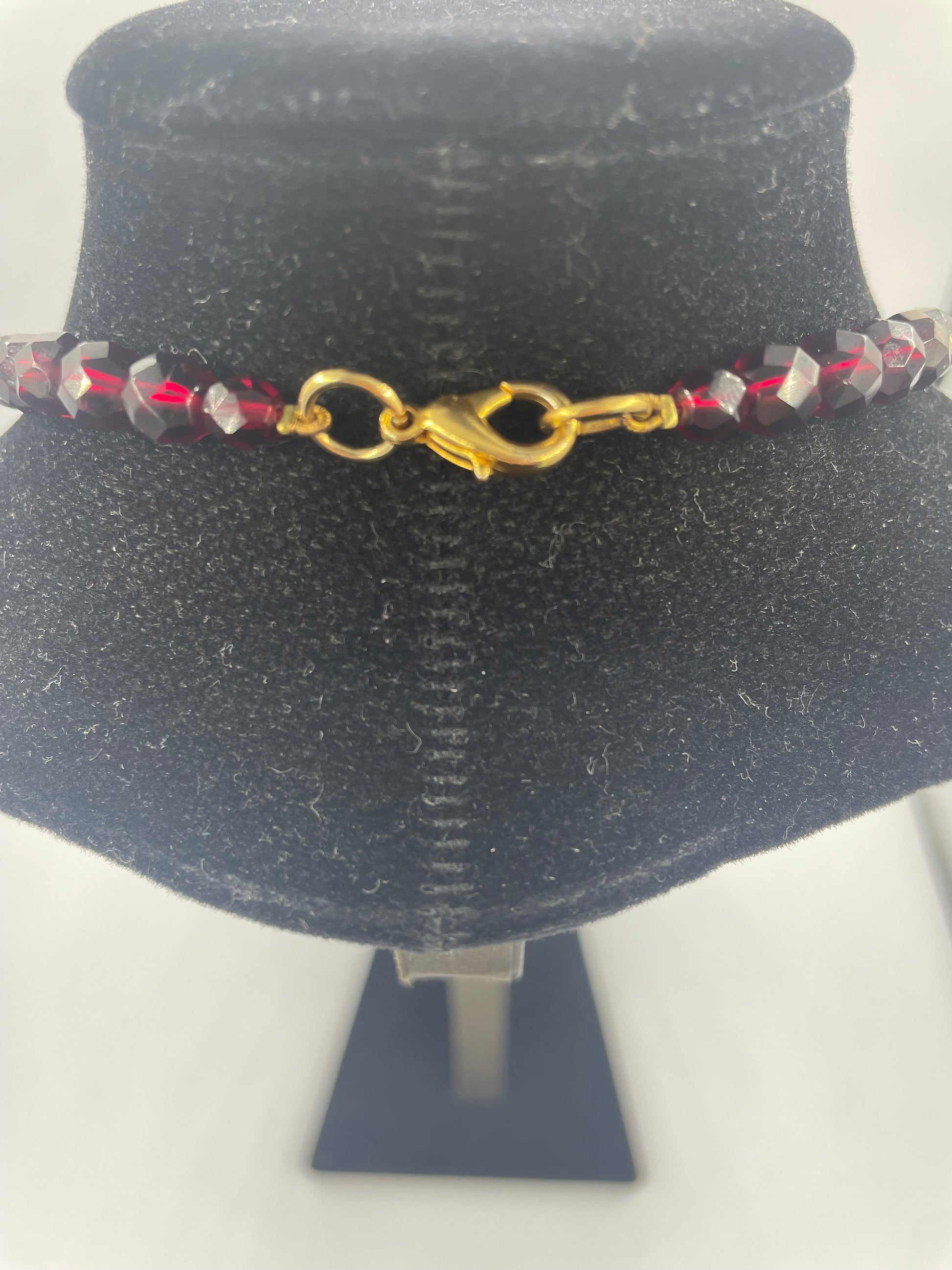 Diese elegante vergoldete Kette besticht durch ihre feine Verarbeitung und die leuchtenden Granat-Steine, die für einen edlen Farbakzent sorgen. Die goldfarbene Fassung verleiht der Kette einen klassischen, zeitlosen Charakter und macht sie zu einem stilvollen Accessoire für besondere Anlässe oder den Alltag. Ein ideales Schmuckstück für Liebhaber hochwertiger Vintage-Accessoires.