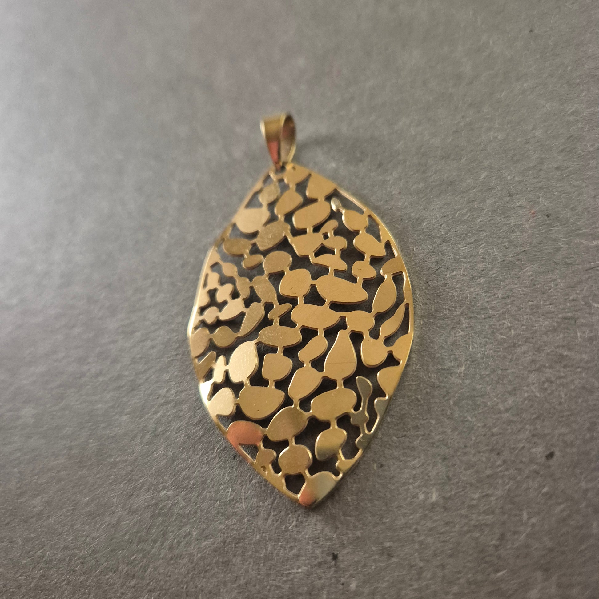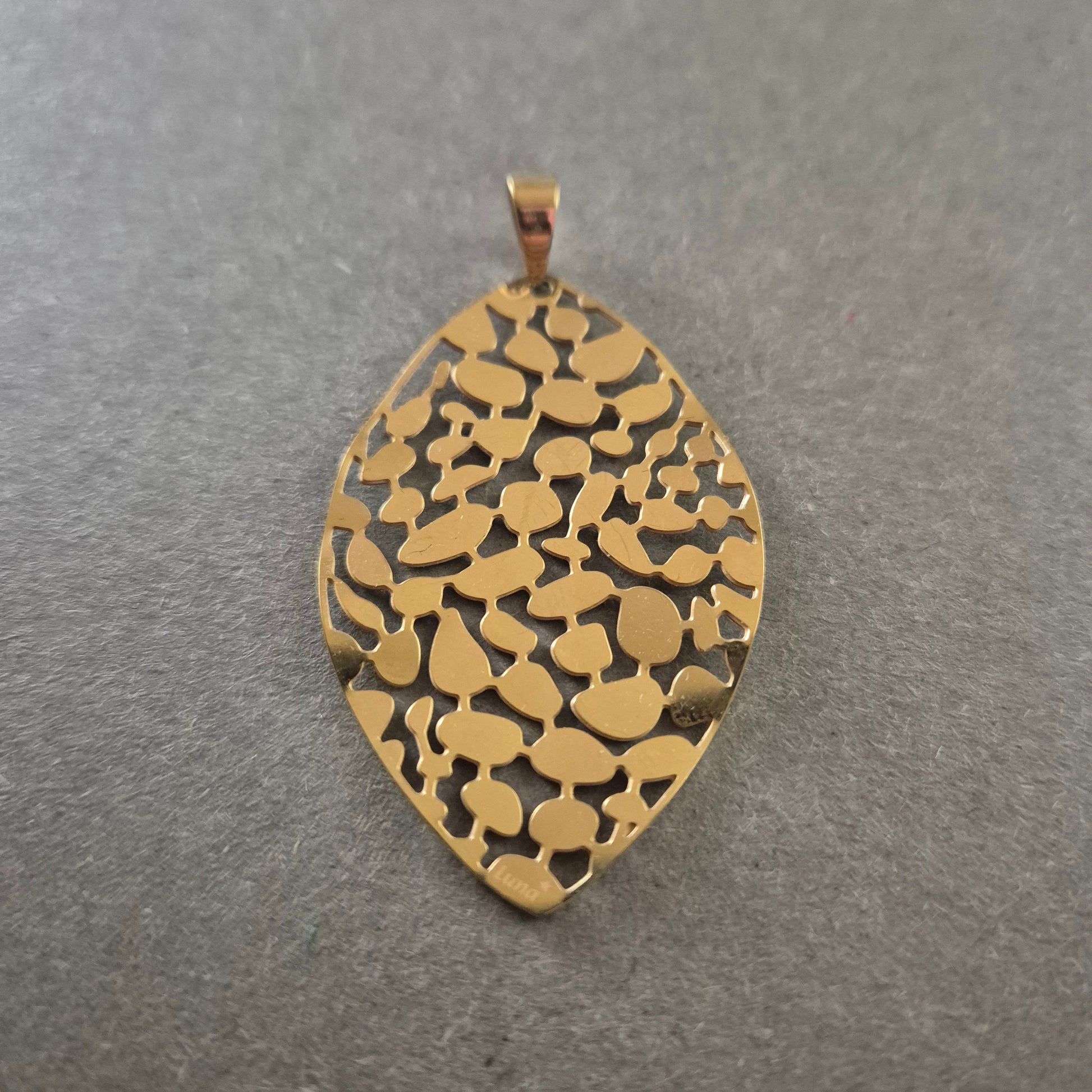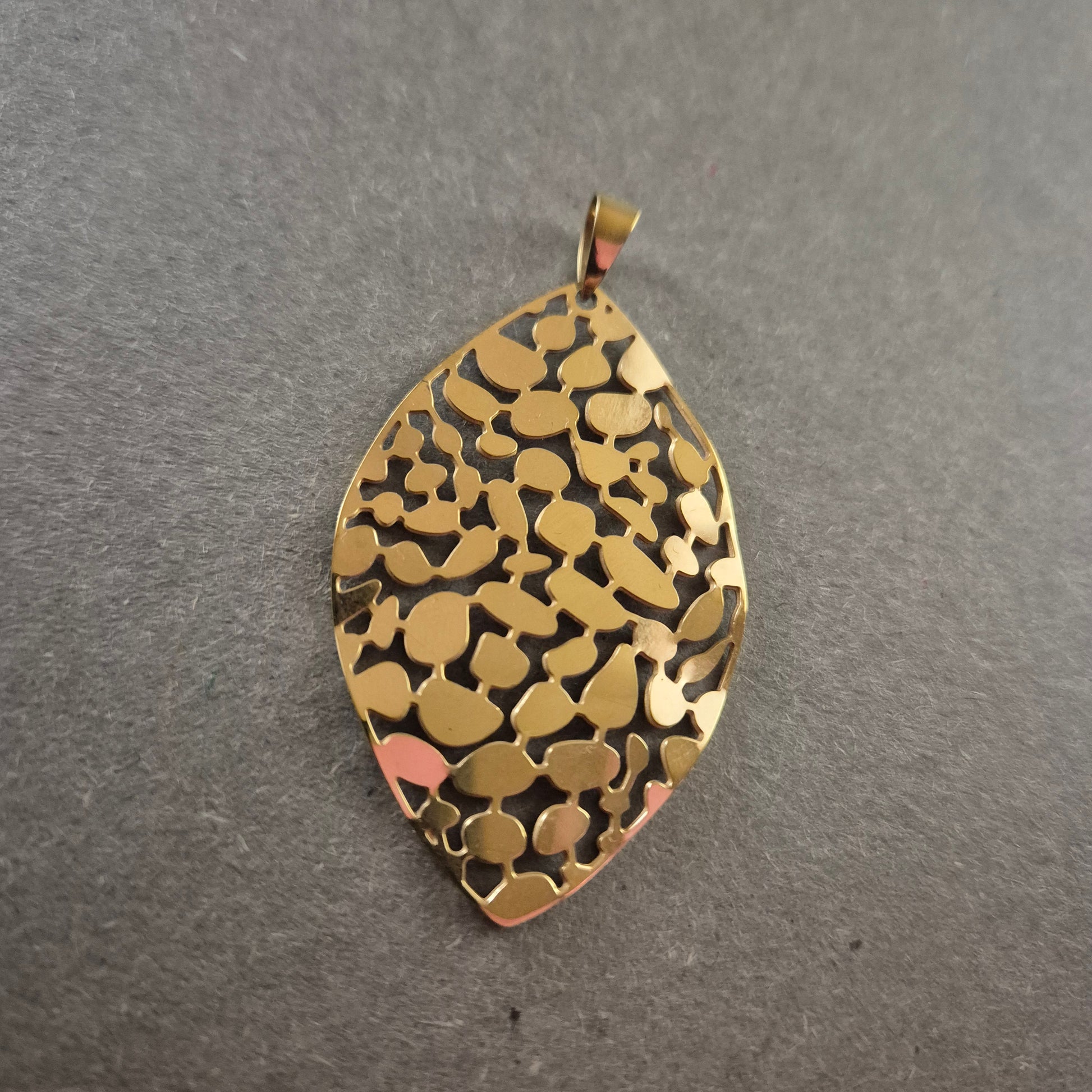 Dieser wunderschöne, vergoldete Anhänger besticht durch sein filigranes, durchbrochenes Muster in Tropfenform. Die aufwendige Gestaltung erinnert an abstrakte Naturmotive und verleiht dem Schmuckstück eine moderne, aber dennoch zeitlose Eleganz.