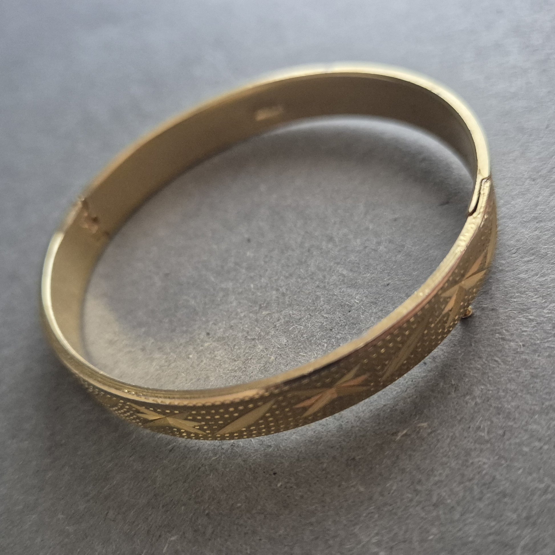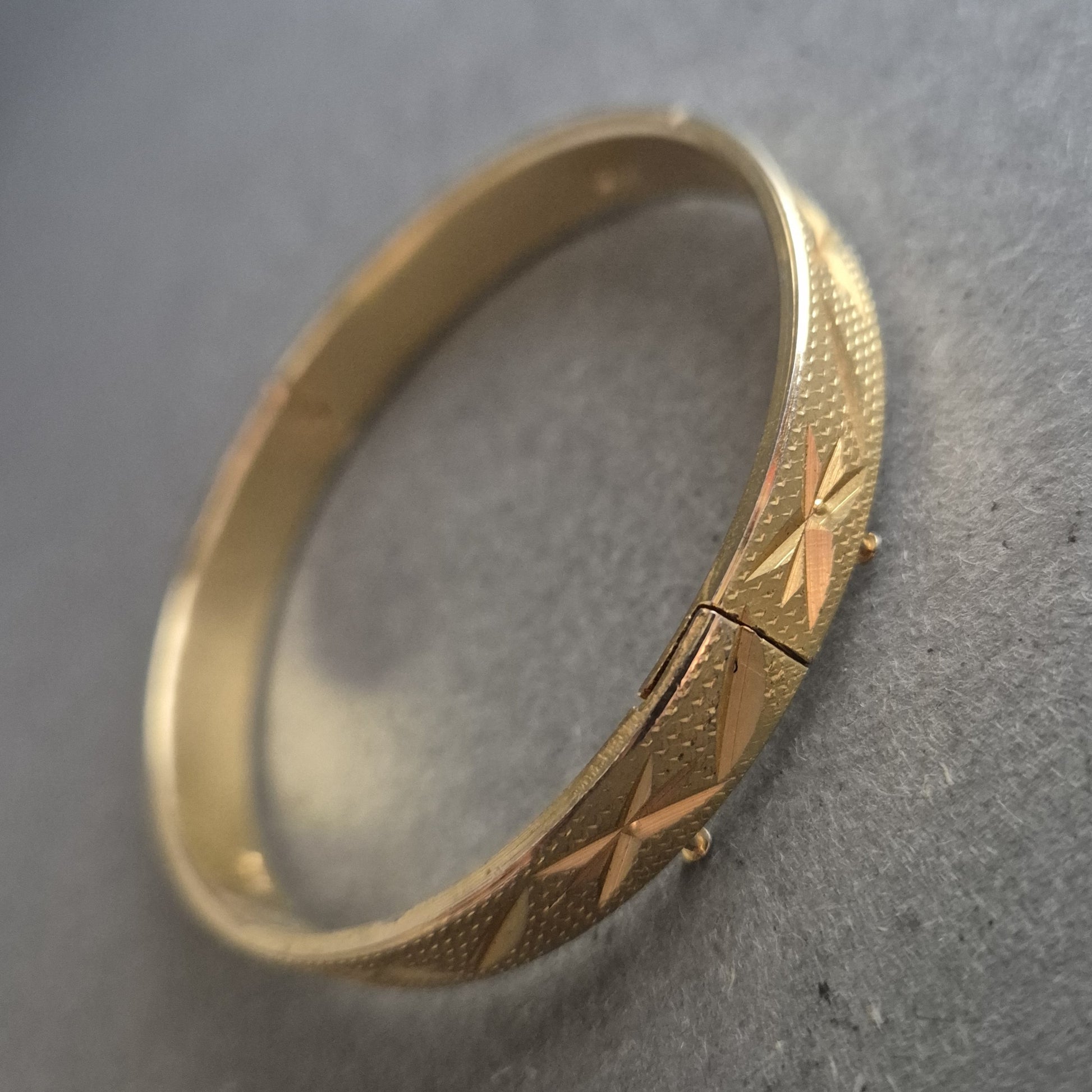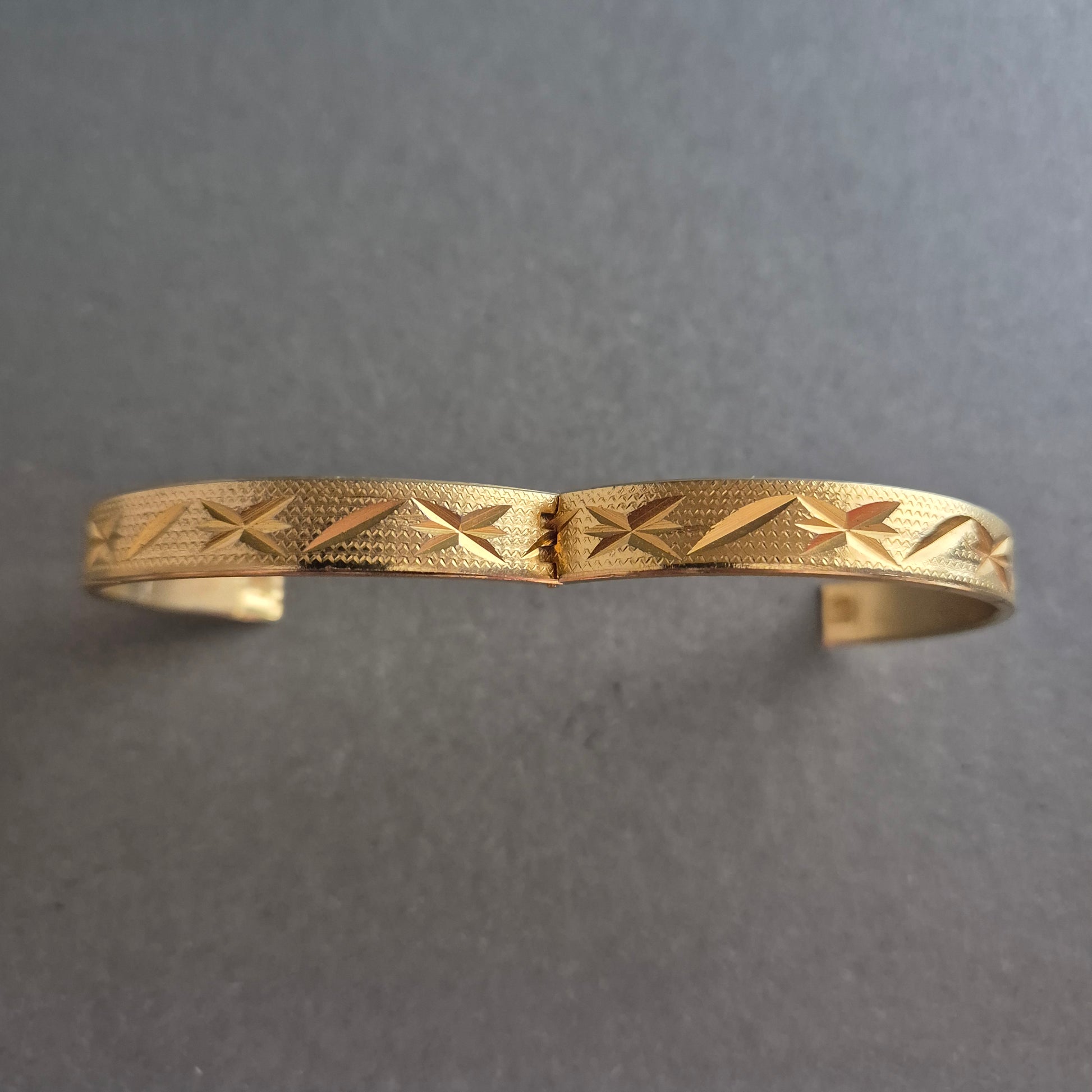Dieser massiv wirkende, vergoldete Armreif überzeugt mit einem markanten Gravurmuster aus diagonalen Sternformen, das Tiefe und Struktur verleiht. Die Innenseite trägt die Prägung "18K RGGP", was auf eine hochwertige Vergoldung hinweist. Der Scharniermechanismus erlaubt ein einfaches Anlegen und sorgt für sicheren Halt. Ein stilvoller Vintage-Klassiker mit nostalgischem Flair.