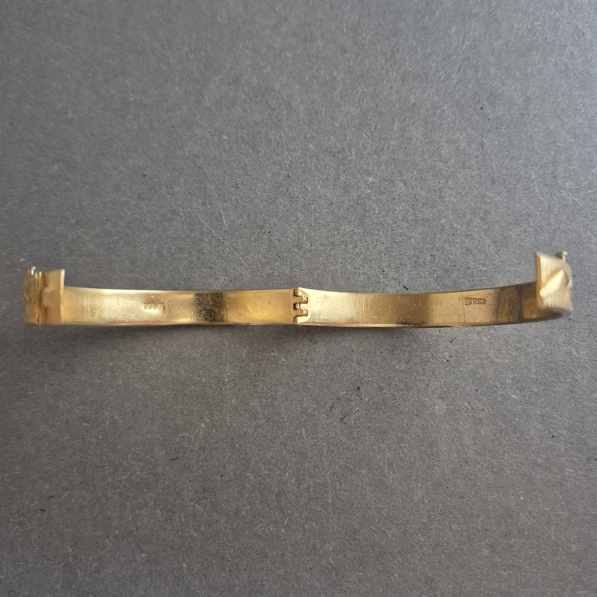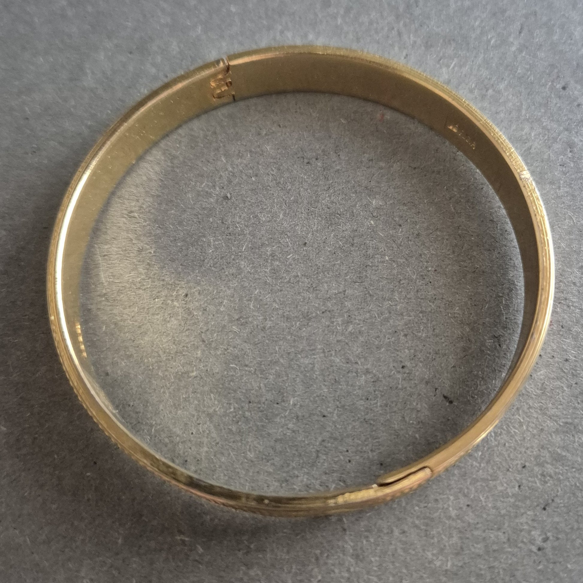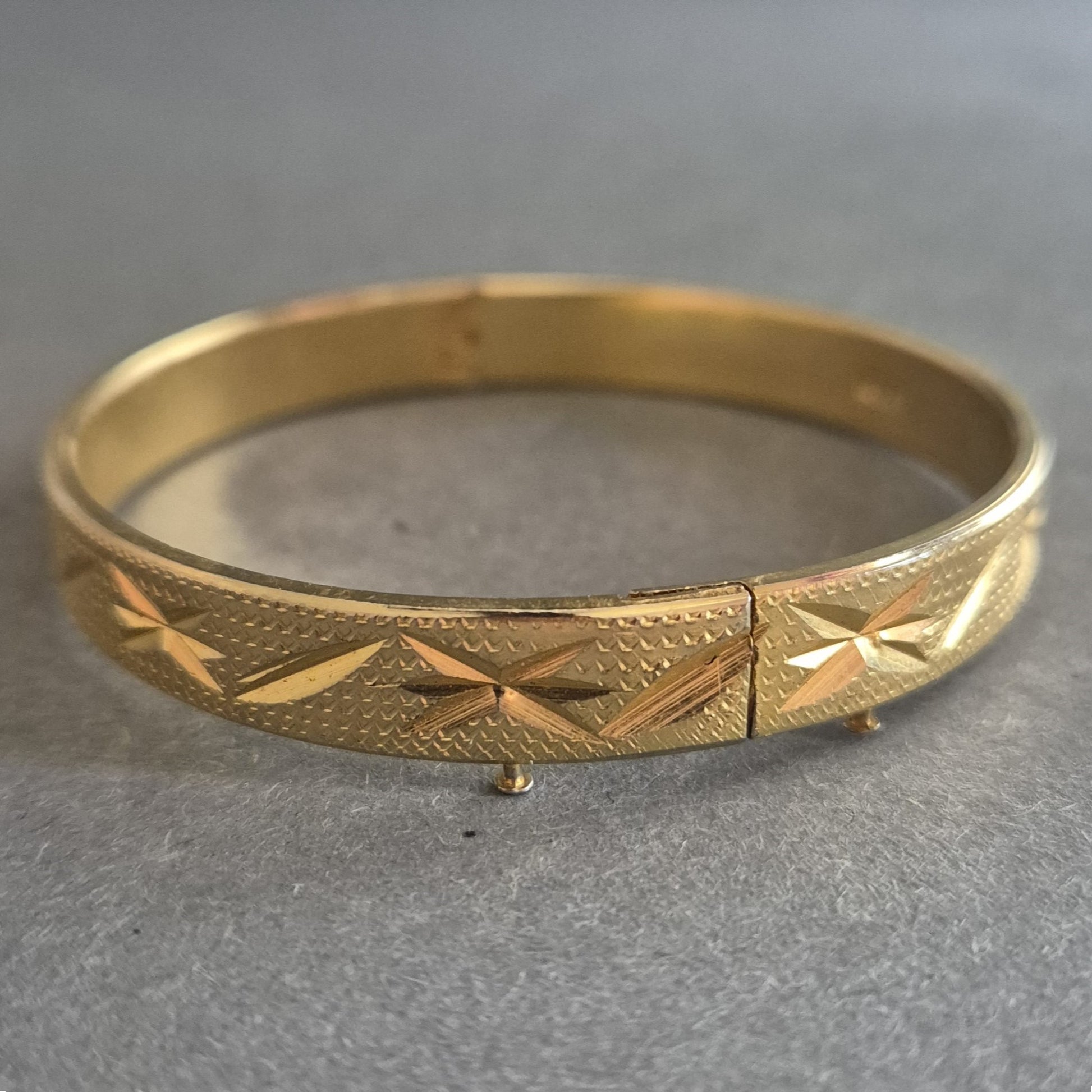 Dieser massiv wirkende, vergoldete Armreif überzeugt mit einem markanten Gravurmuster aus diagonalen Sternformen, das Tiefe und Struktur verleiht. Die Innenseite trägt die Prägung "18K RGGP", was auf eine hochwertige Vergoldung hinweist. Der Scharniermechanismus erlaubt ein einfaches Anlegen und sorgt für sicheren Halt. Ein stilvoller Vintage-Klassiker mit nostalgischem Flair.