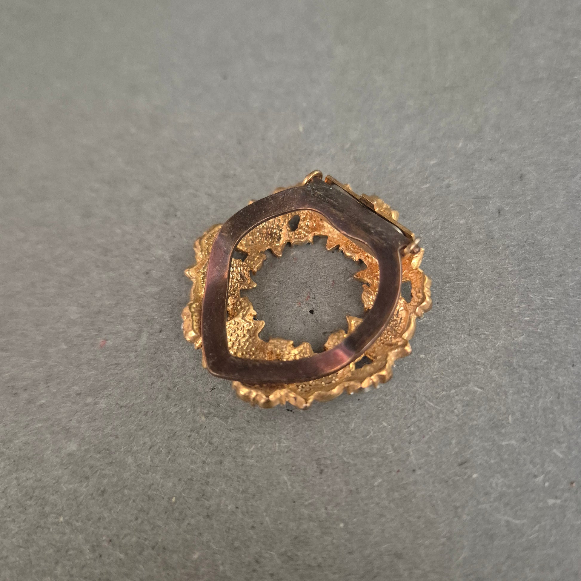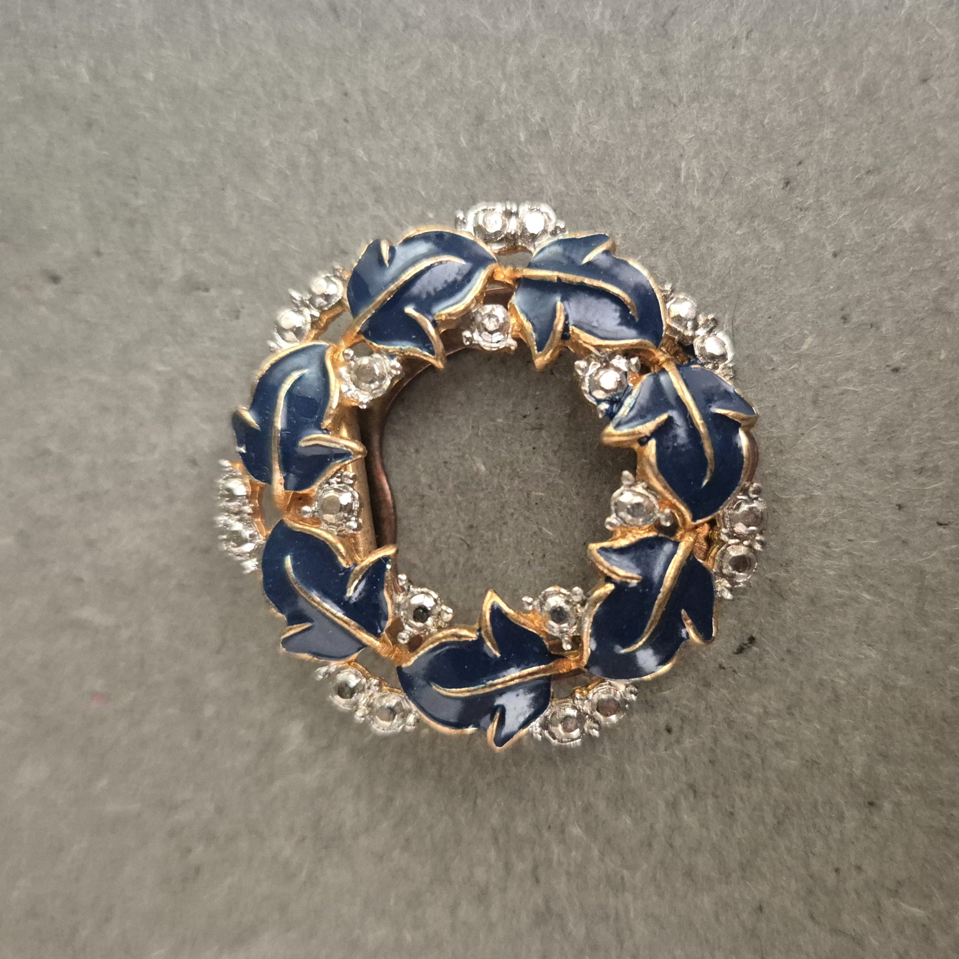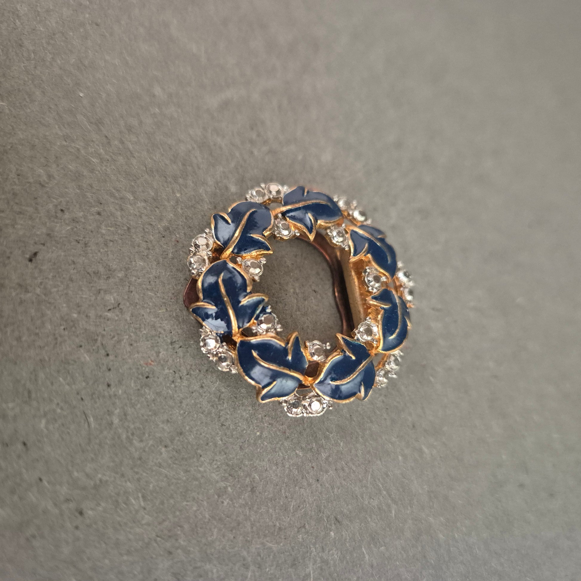 Dieser kunstvolle Vintage-Anhänger besticht durch sein elegantes Design in Kranzform, verziert mit blauen Emailleblättern und funkelnden Strasssteinen. Die goldfarbene Rückseite ist fein strukturiert, während der stabile Clipverschluss vielseitige Tragemöglichkeiten bietet – ideal als modischer Anhänger oder zur Verzierung von Tüchern, Taschen oder Kleidung.