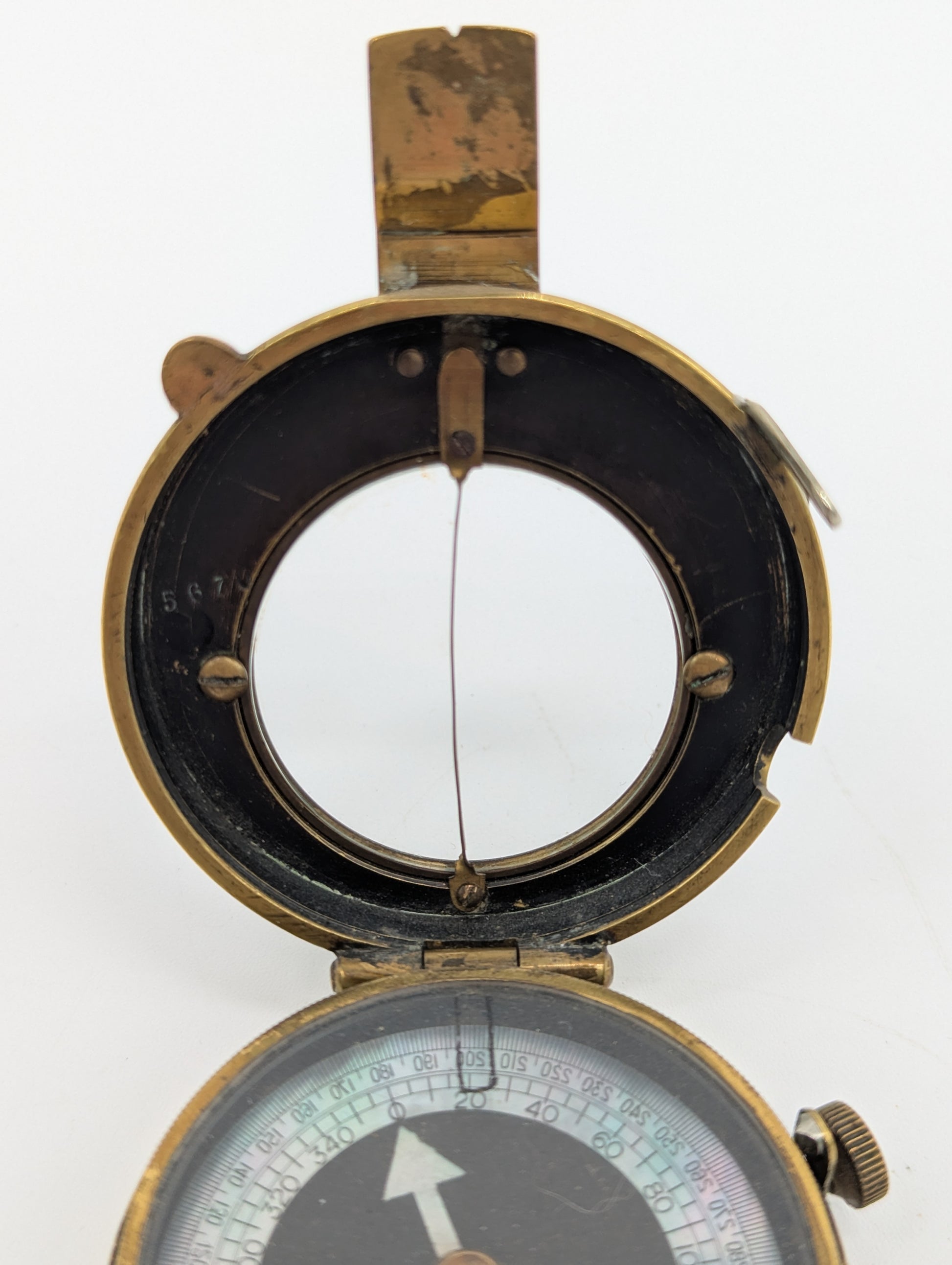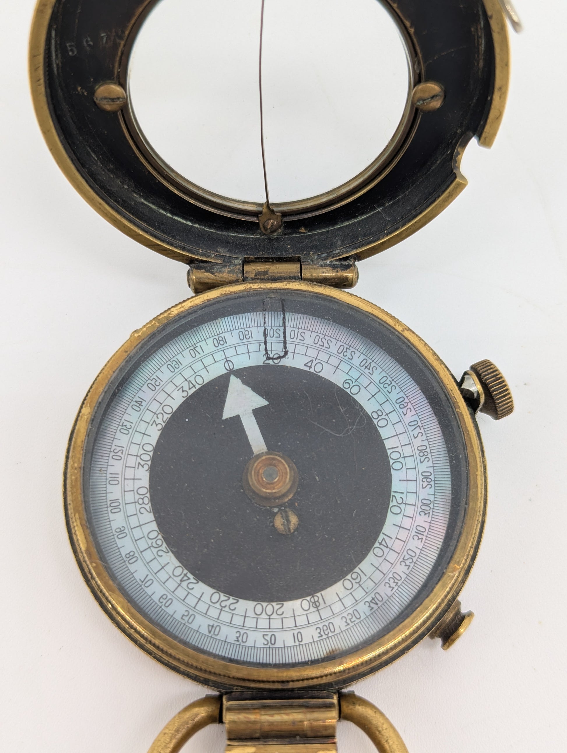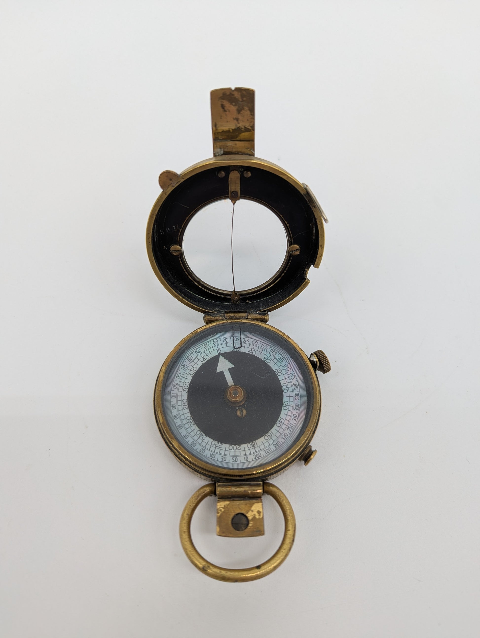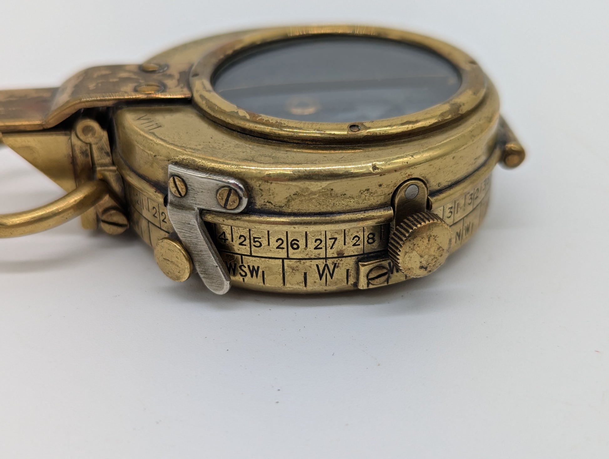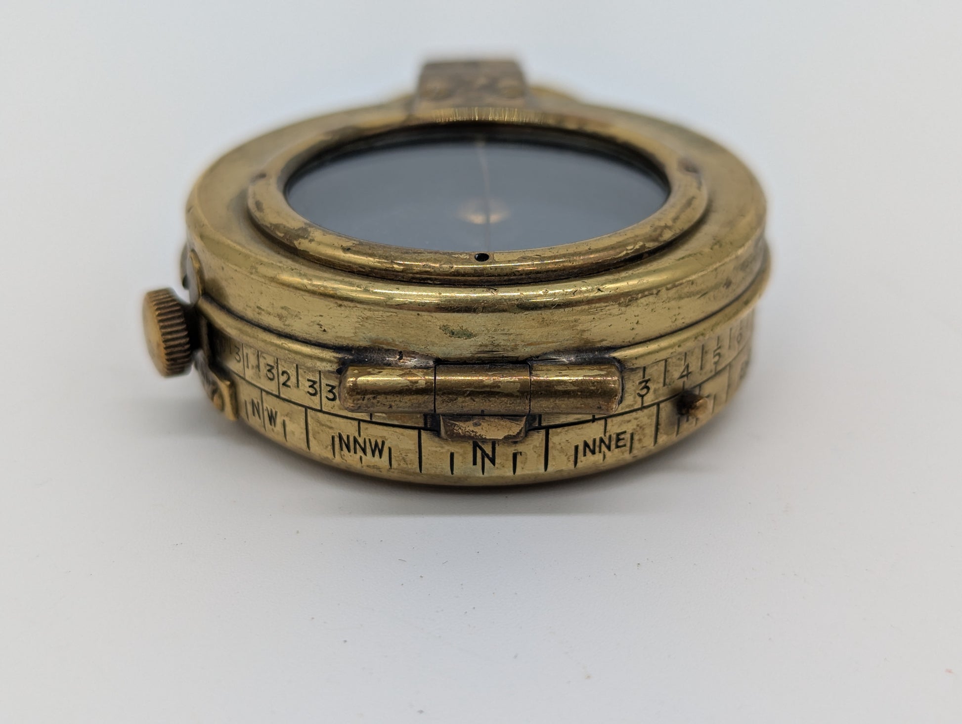 Dieser originale Verners Pattern Kompass, Modell MK VIII, stammt aus dem Jahr 1918 und ist ein authentisches Navigationsinstrument aus der Zeit des Ersten Weltkriegs. Der Kompass ist aus massivem Messing gefertigt und hat einen Durchmesser von ca. 5,5 cm.