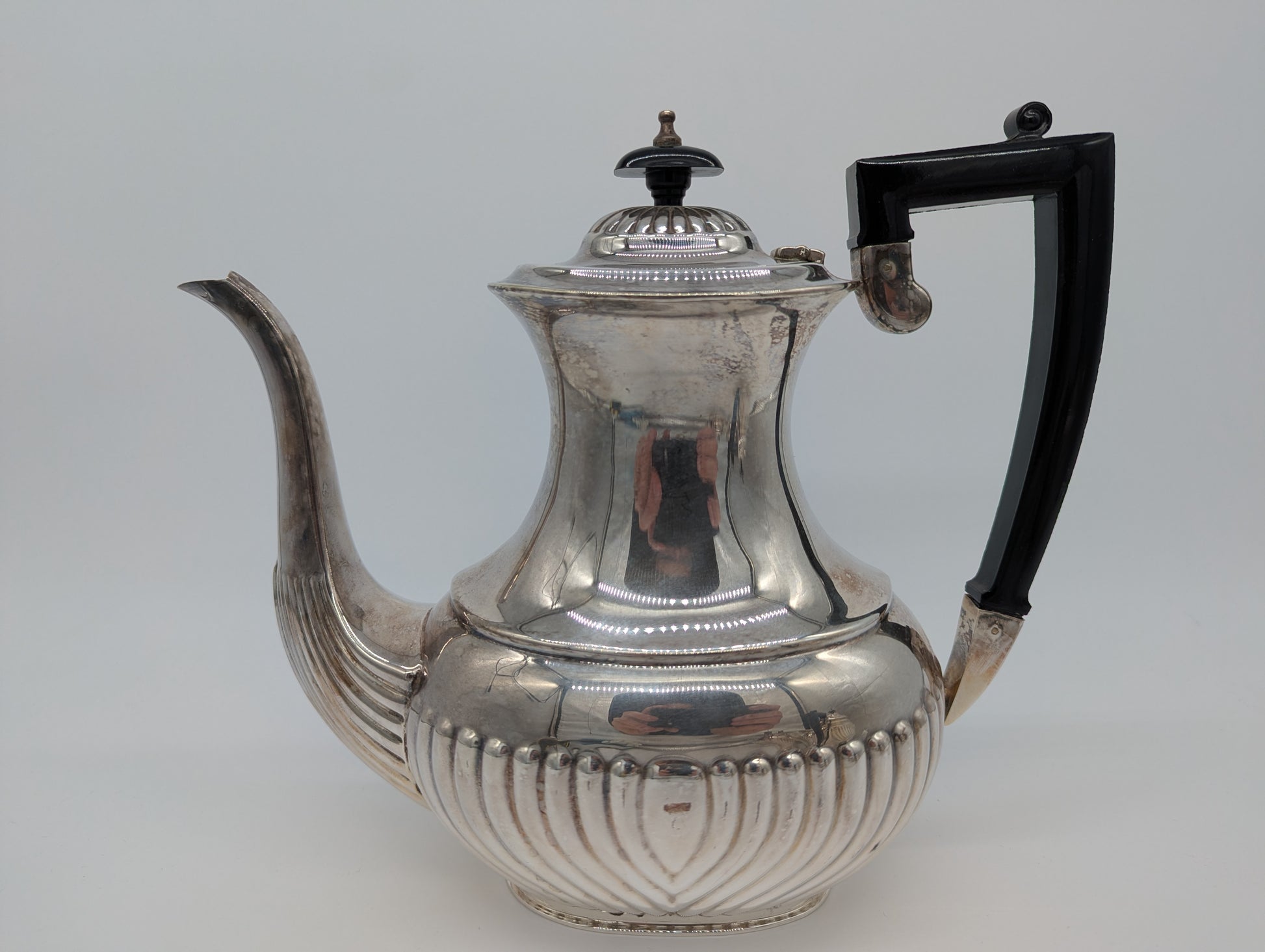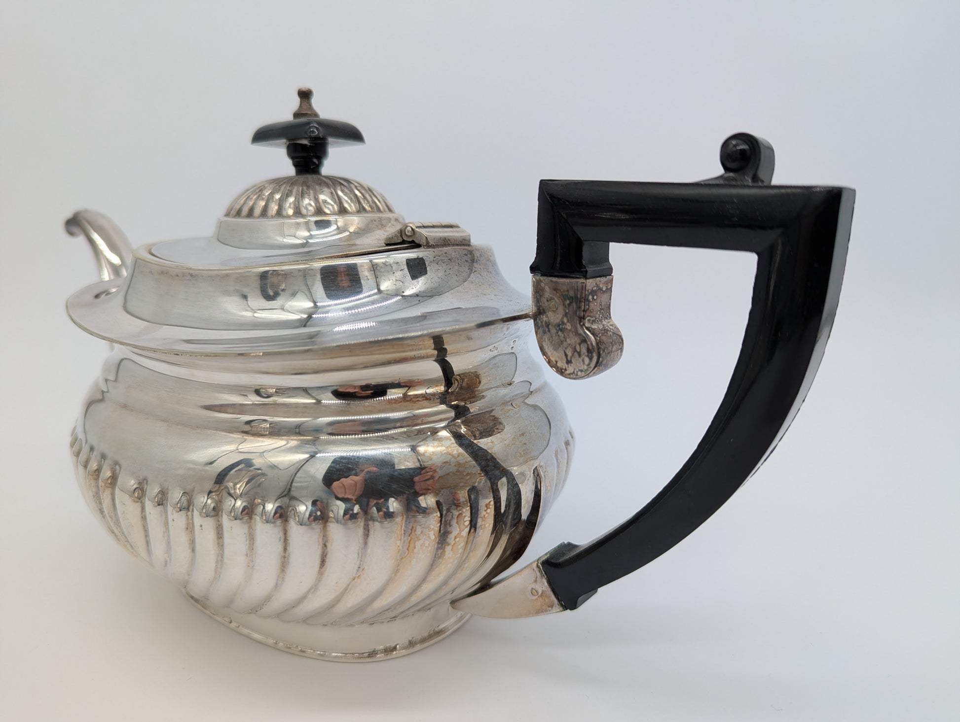 Dieses wunderschöne Teeservice der Marke Ashberrys besticht durch sein zeitloses und elegantes Design. Es besteht aus zwei Kannen, einem Milchkännchen und einer Gewürzschale. Jedes Stück ist mit der Prägung "EPNS A1 Hard Soldered" versehen, was auf eine hochwertige und langlebige Versilberung hinweist. Das Set zeichnet sich durch seine gerippte Struktur und die stilvollen, dunklen Griffe aus, die einen schönen Kontrast zum glänzenden Silber bilden. Ein klassisches Set, das jede Tafel bereichert.
