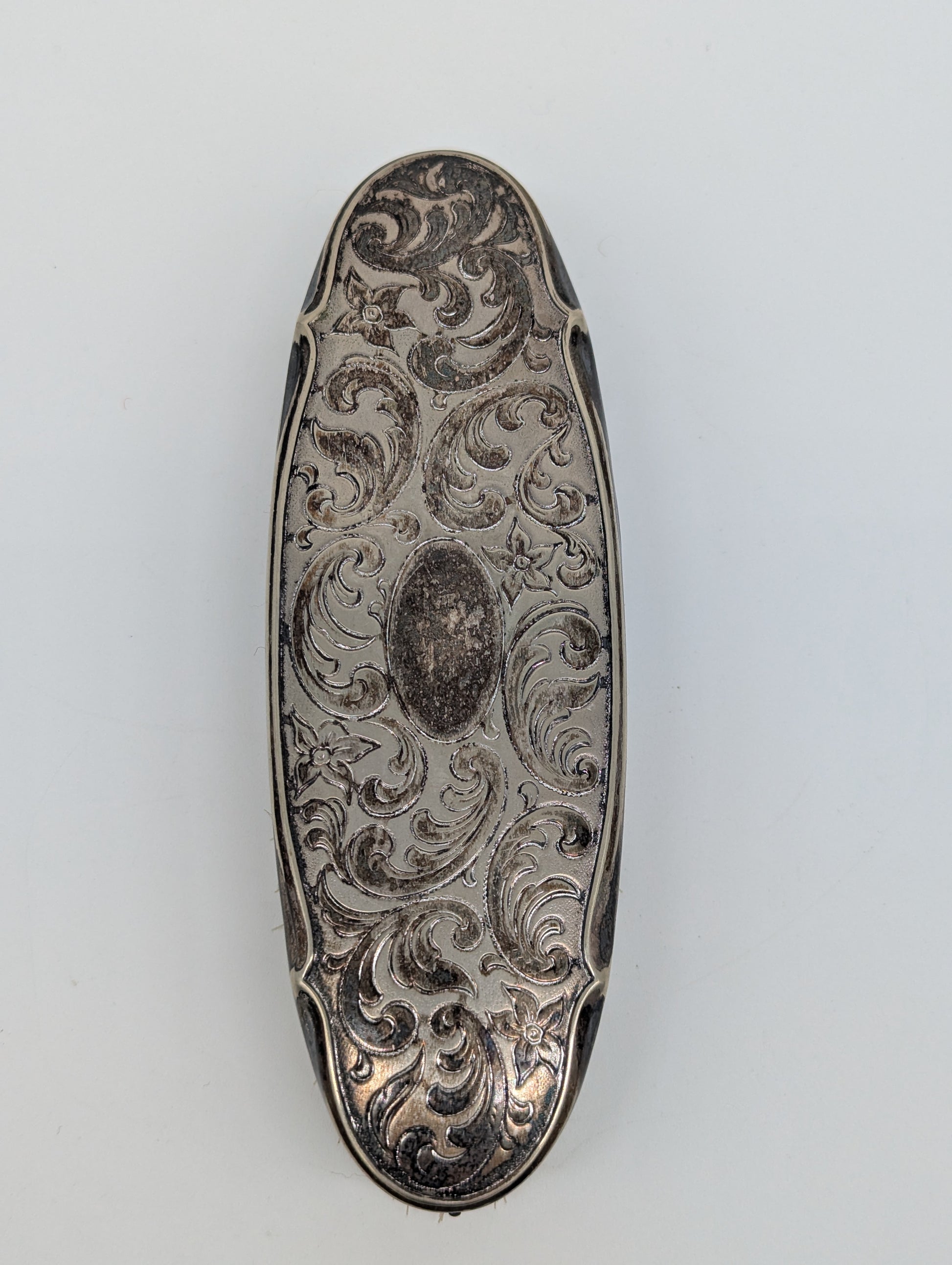 Dieses elegante Frisierset besteht aus drei Teilen und ist reich verziert im klassischen Ornamentstil. Alle Teile sind versilbert und zeigen feine florale Gravuren auf den Oberflächen.