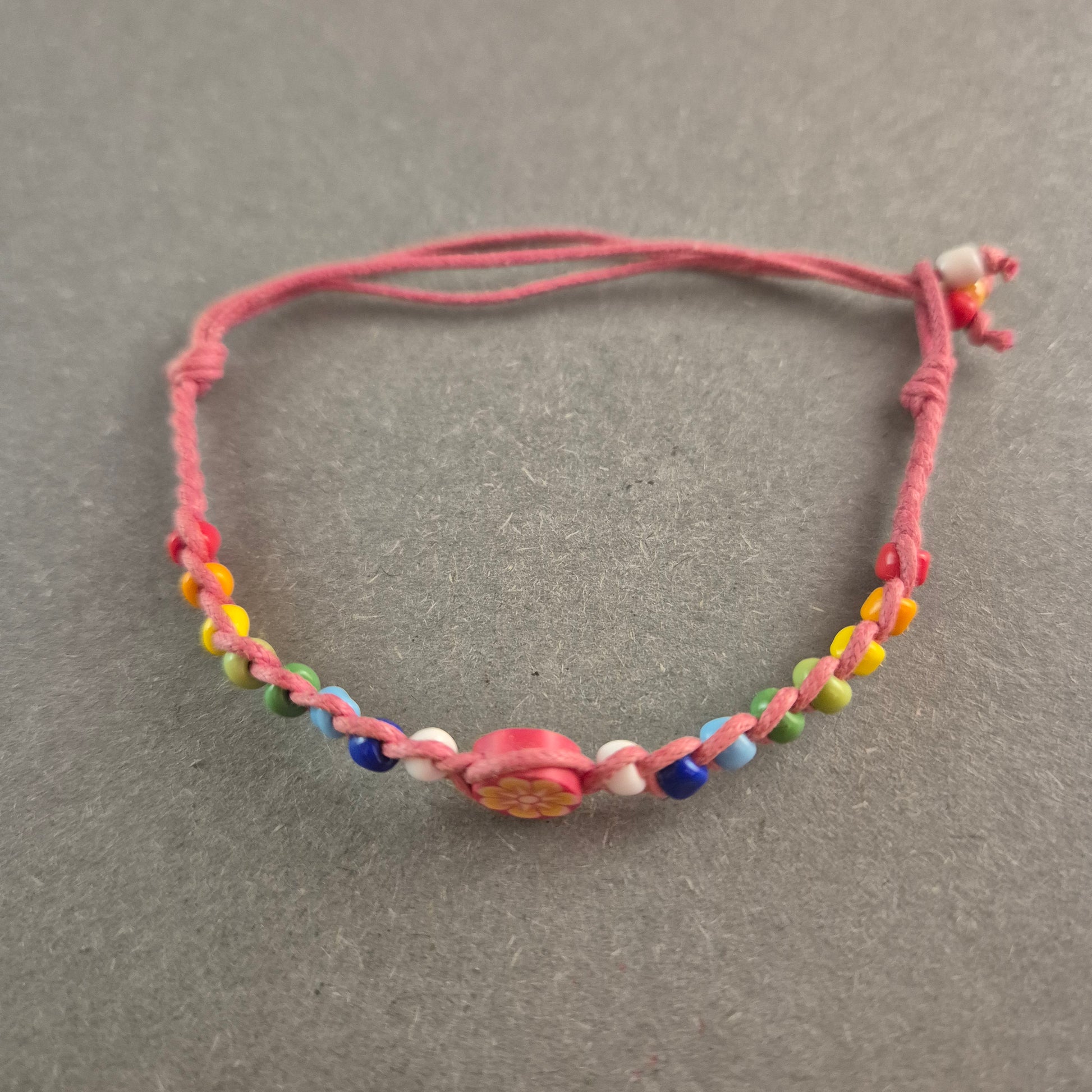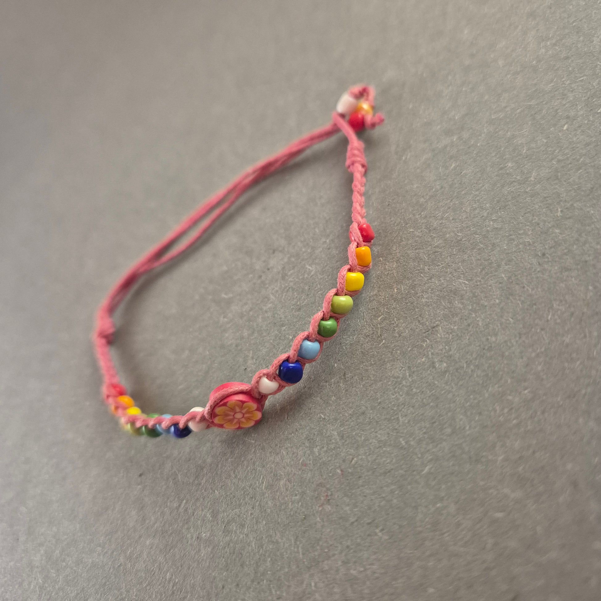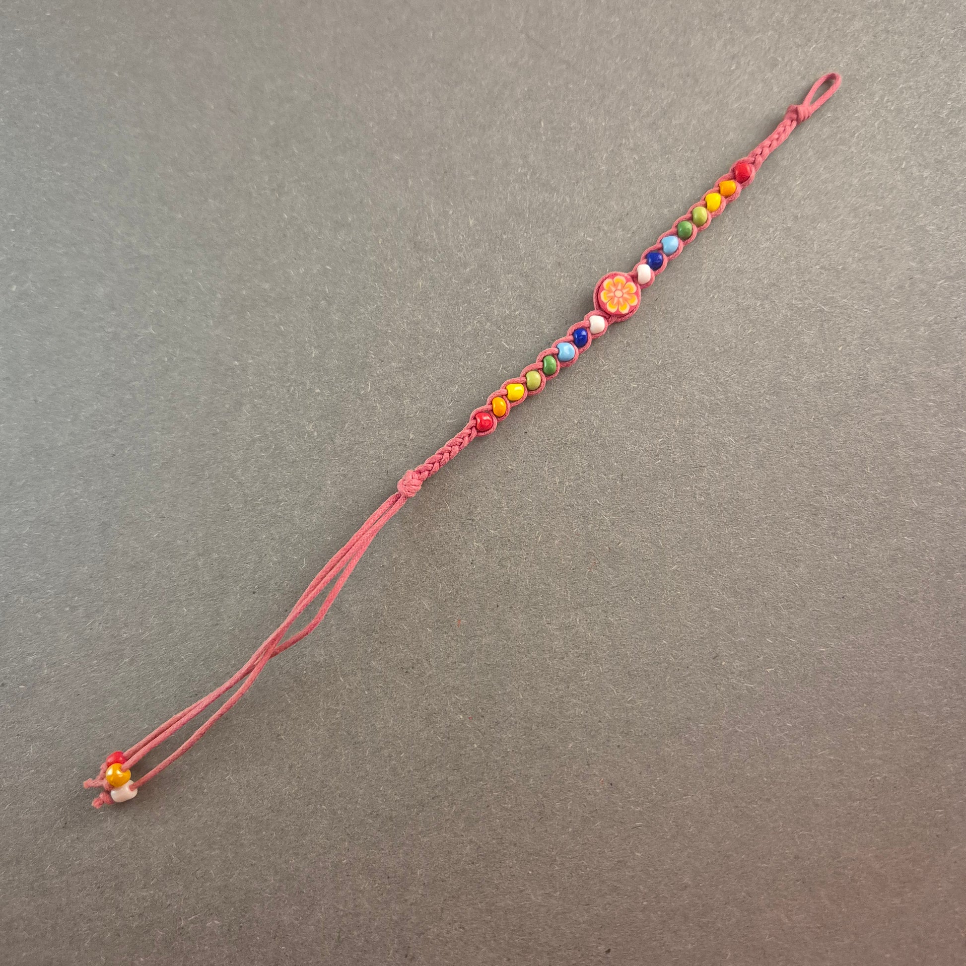 Dieses handgefertigte Makramee-Armband bringt Farbe und Freude in jedes Outfit. Der zarte pinke Faden ist kunstvoll geflochten und mit kleinen, bunten Perlen verziert. In der Mitte des Armbands sitzt eine rosafarbene Perle mit Blütenmotiv, die den verspielten Charakter unterstreicht. Dank des verstellbaren Verschlusses passt sich das Armband ideal an jedes Handgelenk an – perfekt für den Sommer, das Festival oder als süßes Freundschaftsarmband.