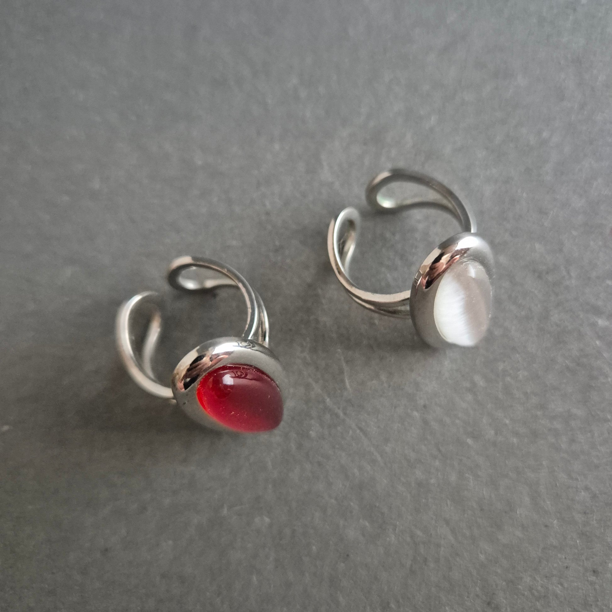 Dieses stilvolle Set besteht aus zwei offenen Ringen mit faszinierendem Katzenaugeneffekt – einer in intensivem Rot, der andere in schimmerndem Weiß. Die tropfenförmigen Steine sind in einer silberfarbenen Fassung eingefasst und sitzen auf einer elegant geschwungenen Ringschiene. Dank der offenen Form lassen sich die Ringe flexibel an verschiedene Größen anpassen.