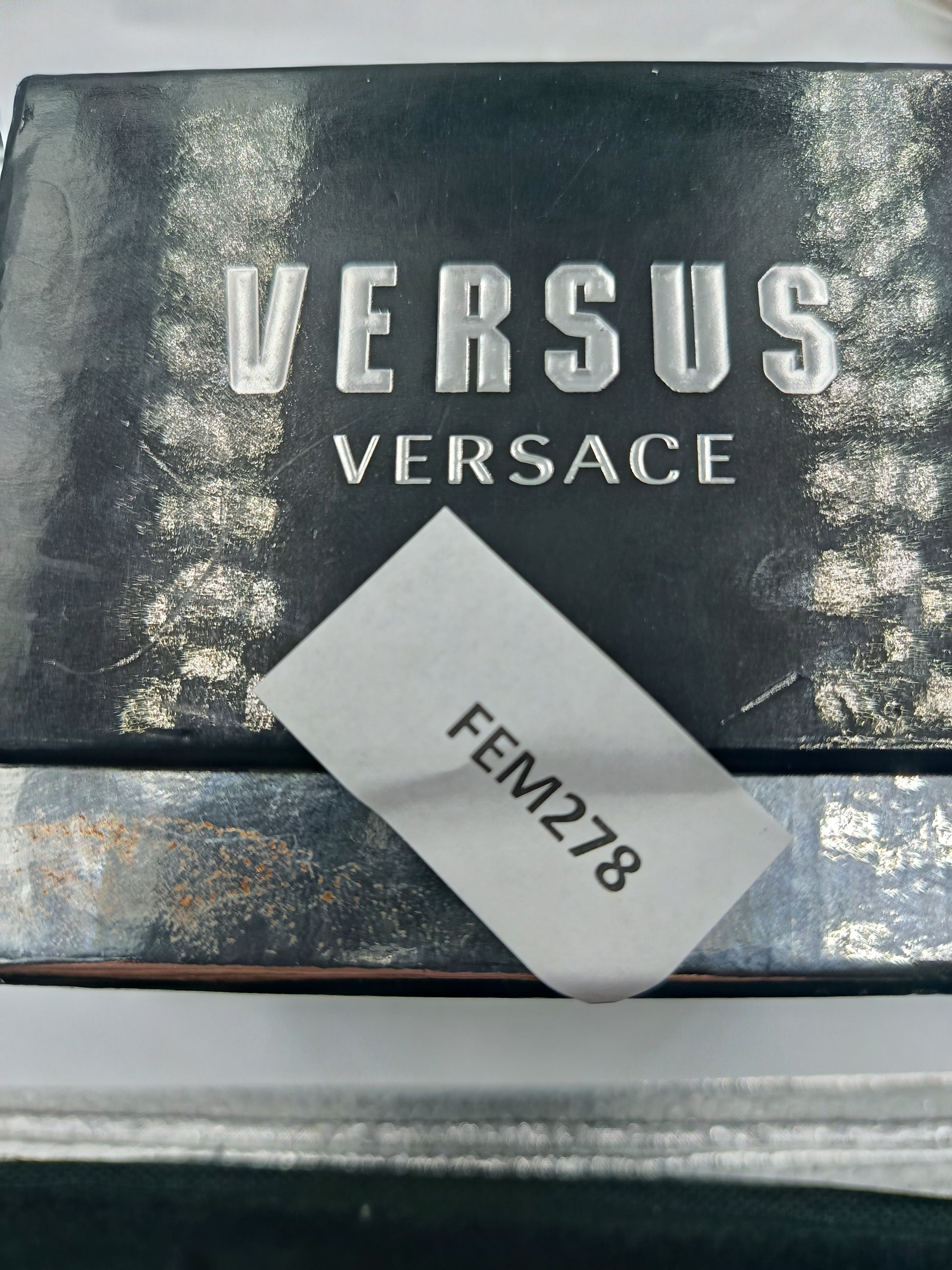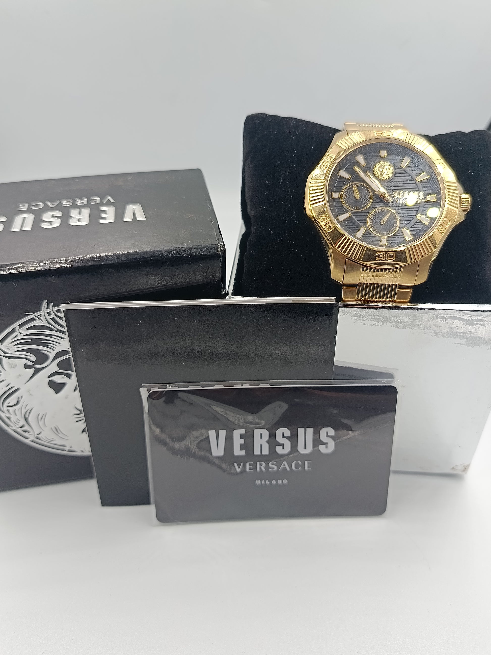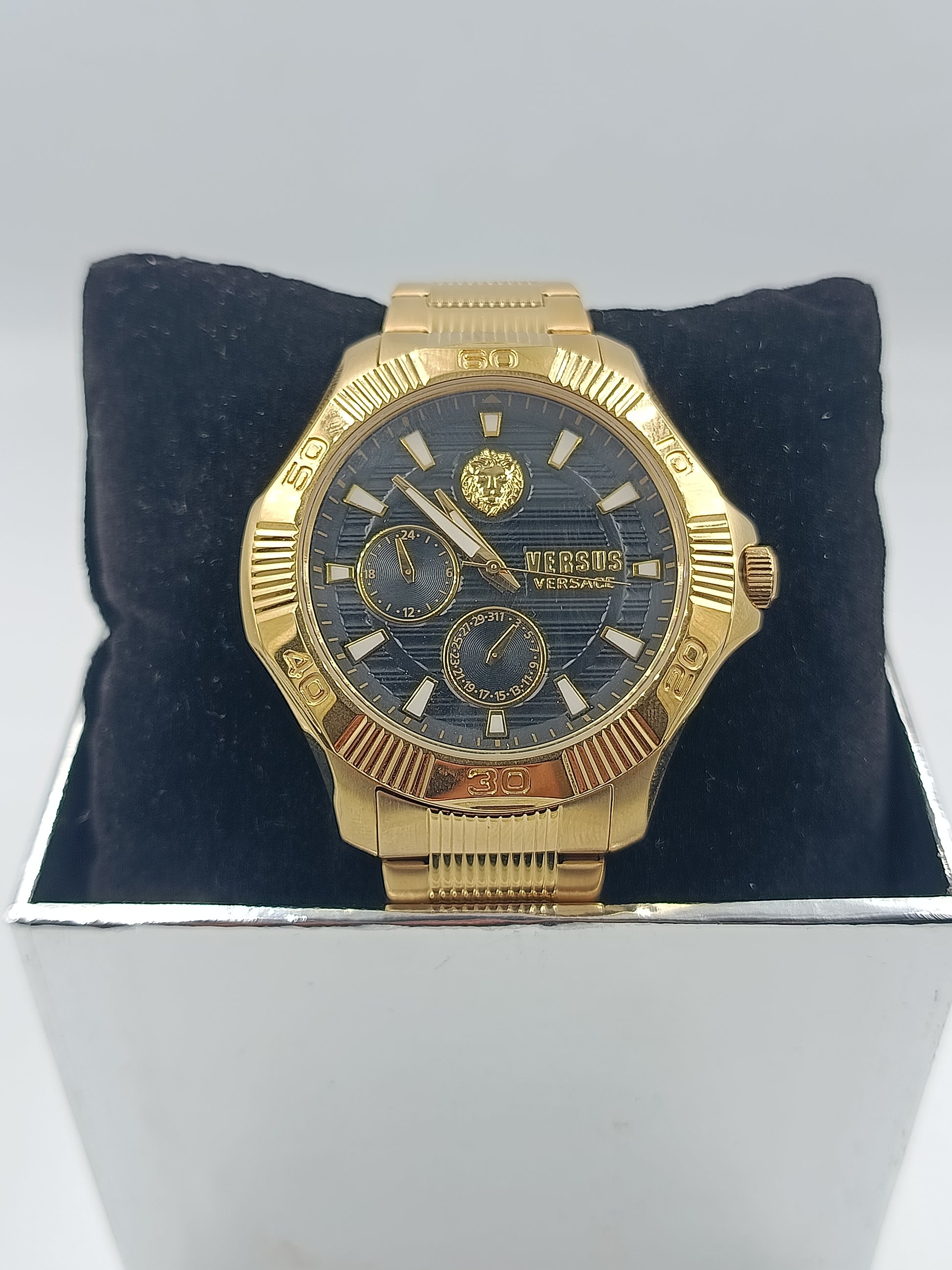 Luxuriöse Versus Versace Herrenuhr in glänzendem Goldton. Das massive Gehäuse und das Gliederarmband strahlen pure Eleganz aus. Das schwarze Zifferblatt mit goldfarbenen Indizes und dem ikonischen Versus-Löwenkopf macht diese Uhr zu einem echten Statement-Piece. Wird in der Originalbox mit Unterlagen geliefert – perfekt für Sammler oder als hochwertiges Geschenk.