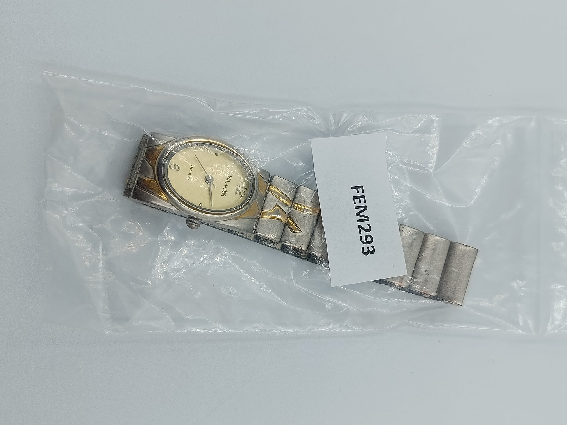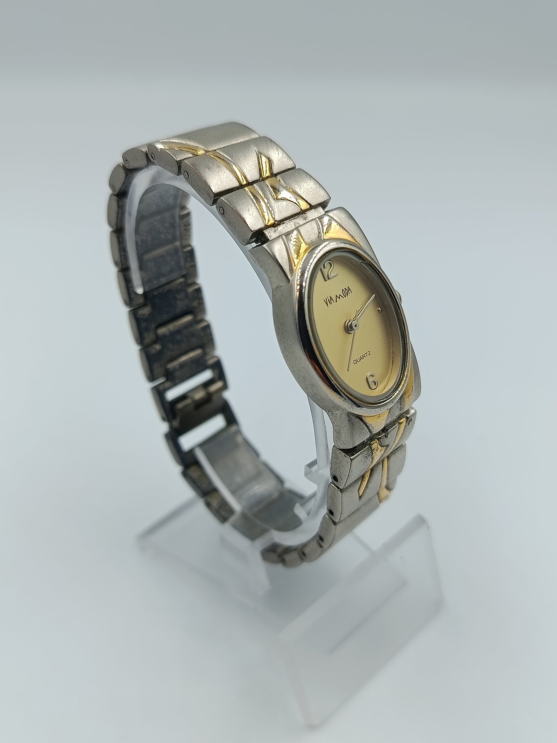 Stilvolle Damenarmbanduhr der Marke Via Moda mit goldfarbenem, ovalem Zifferblatt. Das Armband besticht durch sein auffälliges Bicolor-Design (Silber & Gold) mit geschwungenen Mustern und sorgt für einen eleganten Look. Ideal für den Alltag oder besondere Anlässe.