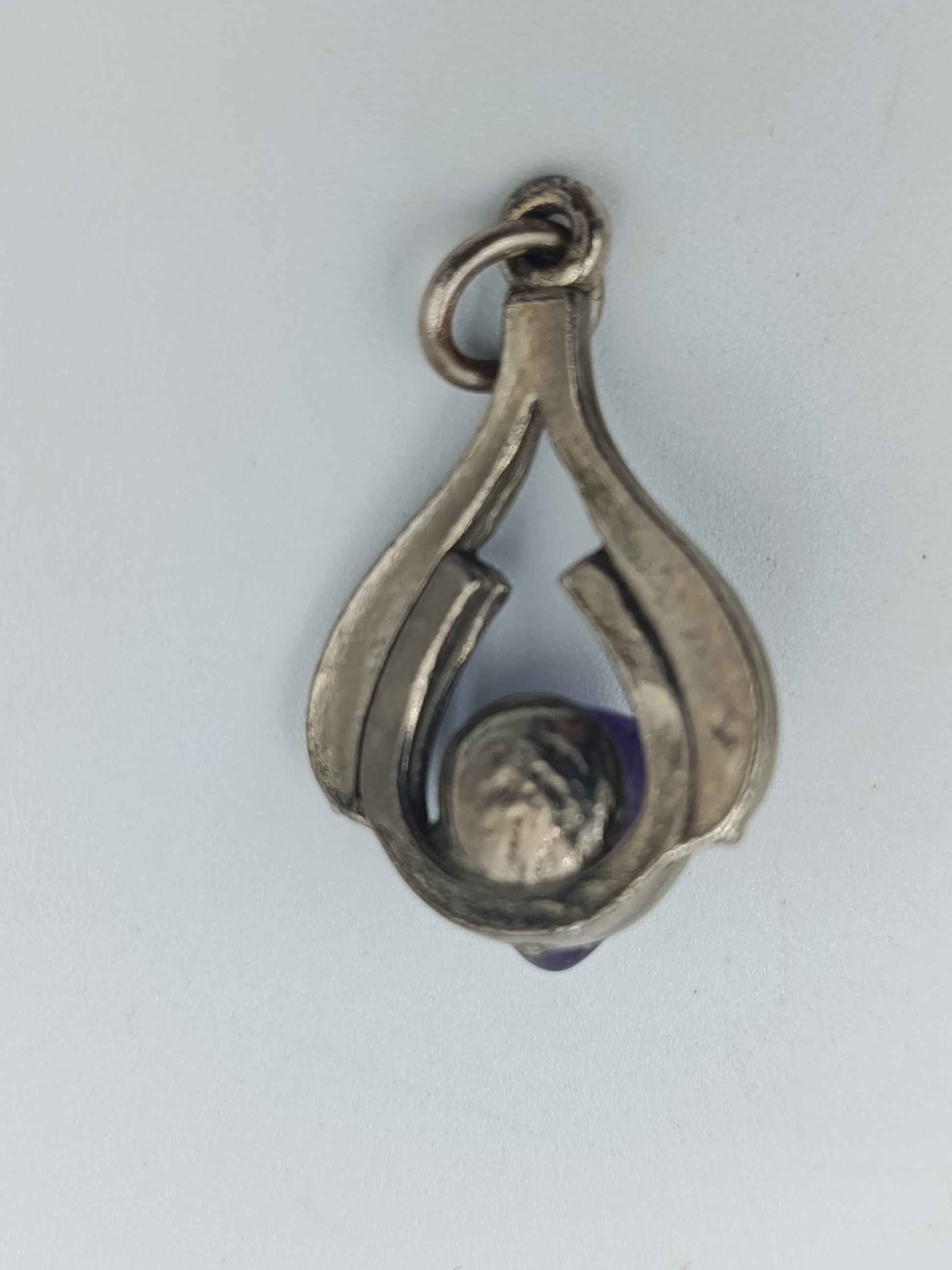 Eleganter, silberfarbener Vintage-Anhänger mit einem tiefvioletten Amethyst in Tropfenform. Das Design ist organisch geschwungen und rahmt den Stein harmonisch ein – ein zeitloses Schmuckstück, das sich sowohl zu modernen als auch zu klassischen Outfits kombinieren lässt.
