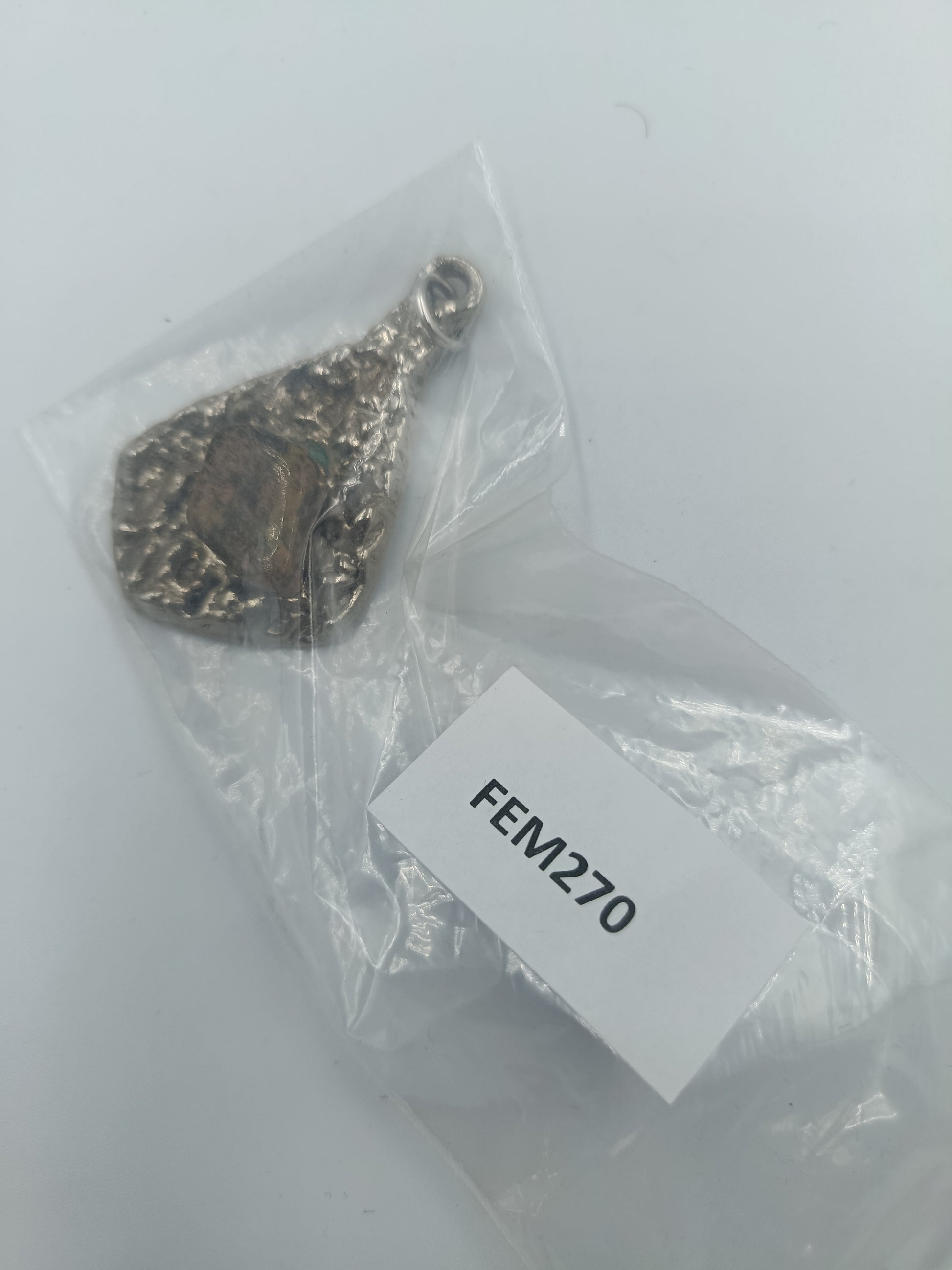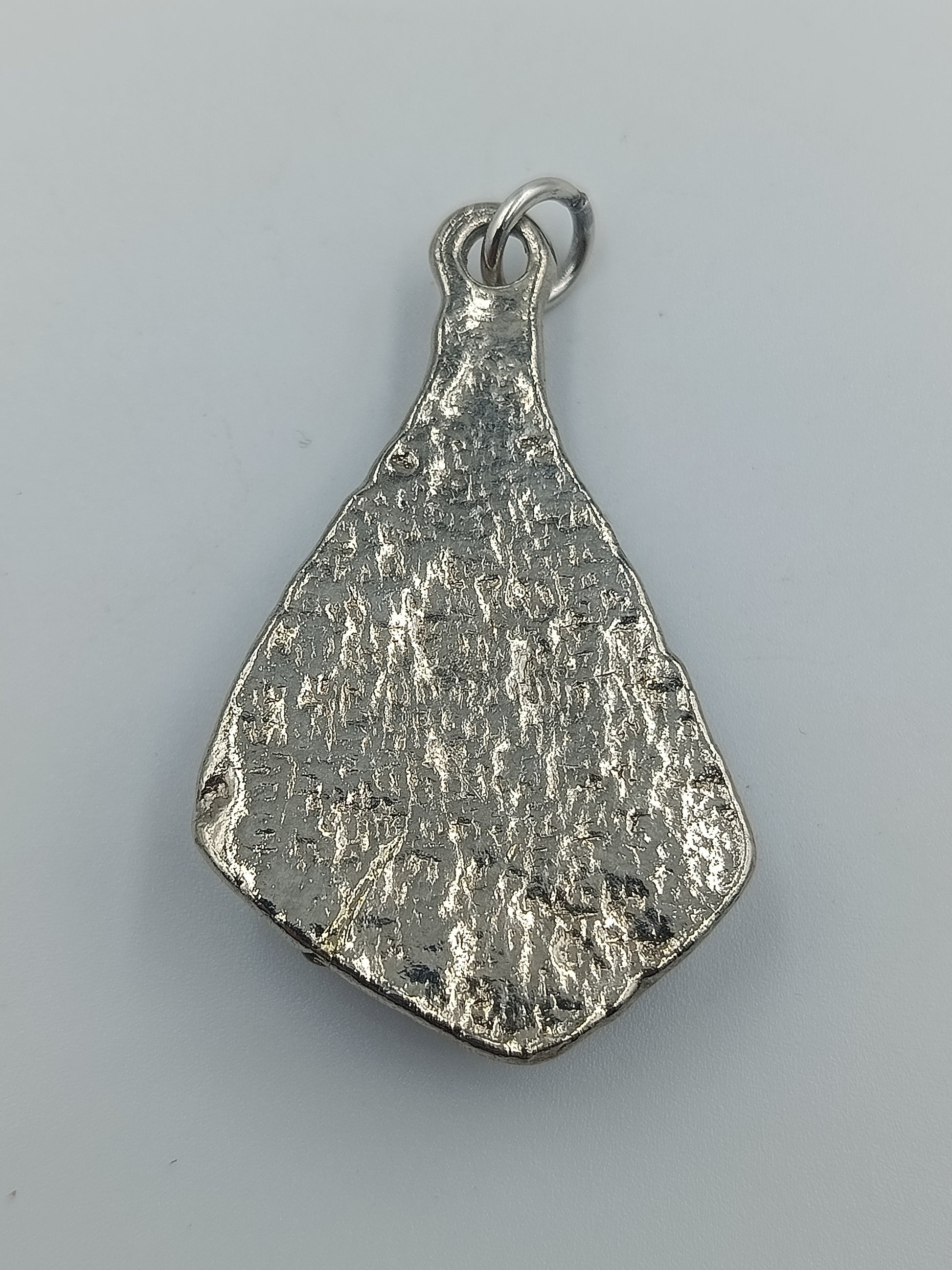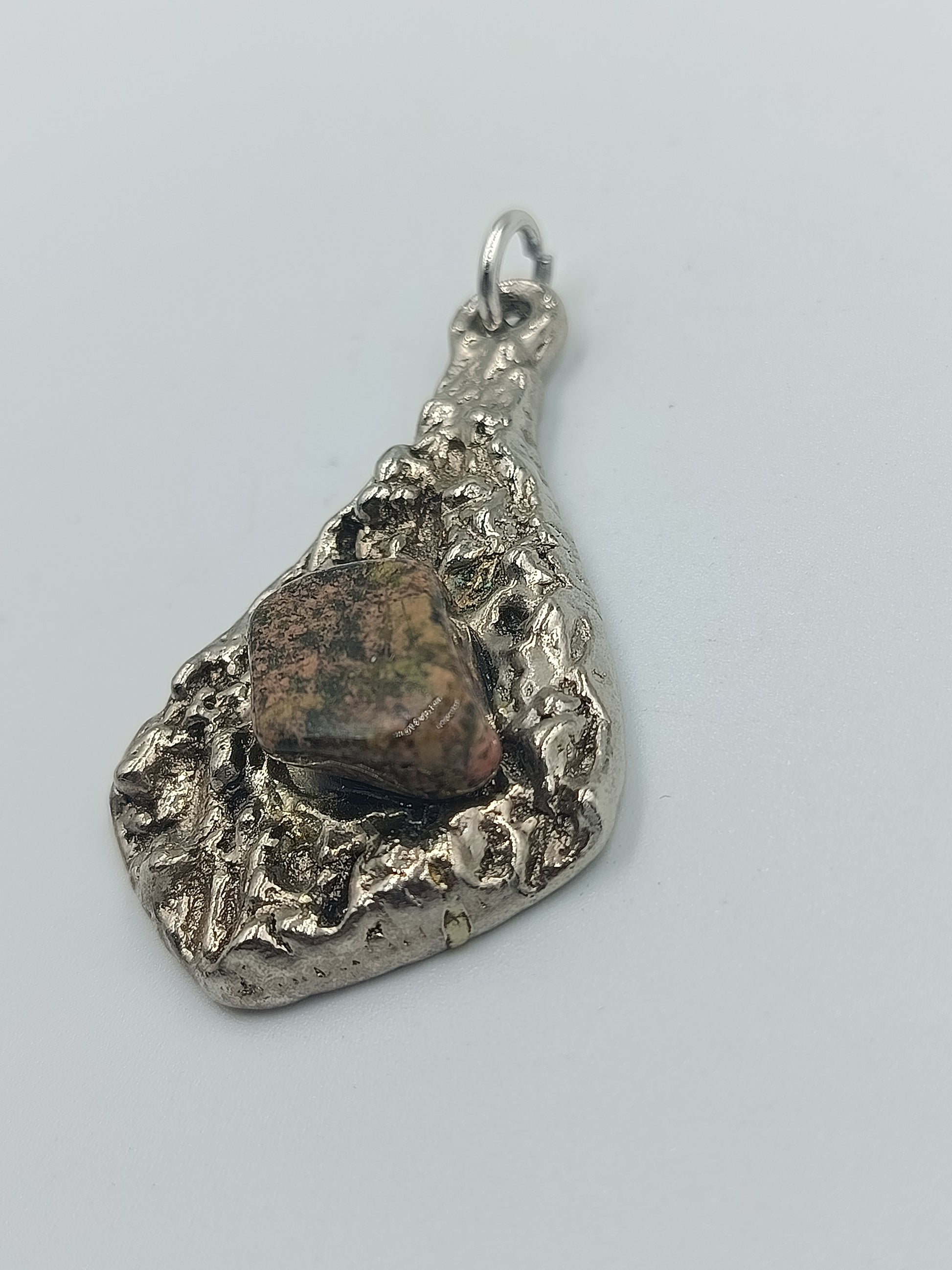 Massiver, handgefertigt wirkender Anhänger aus silberfarbenem Metall mit unregelmäßig gehämmerter, organischer Struktur. In der Mitte ist ein naturbelassener, mehrfarbiger Stein eingefasst, der dem Schmuckstück einen rustikalen und individuellen Charakter verleiht.