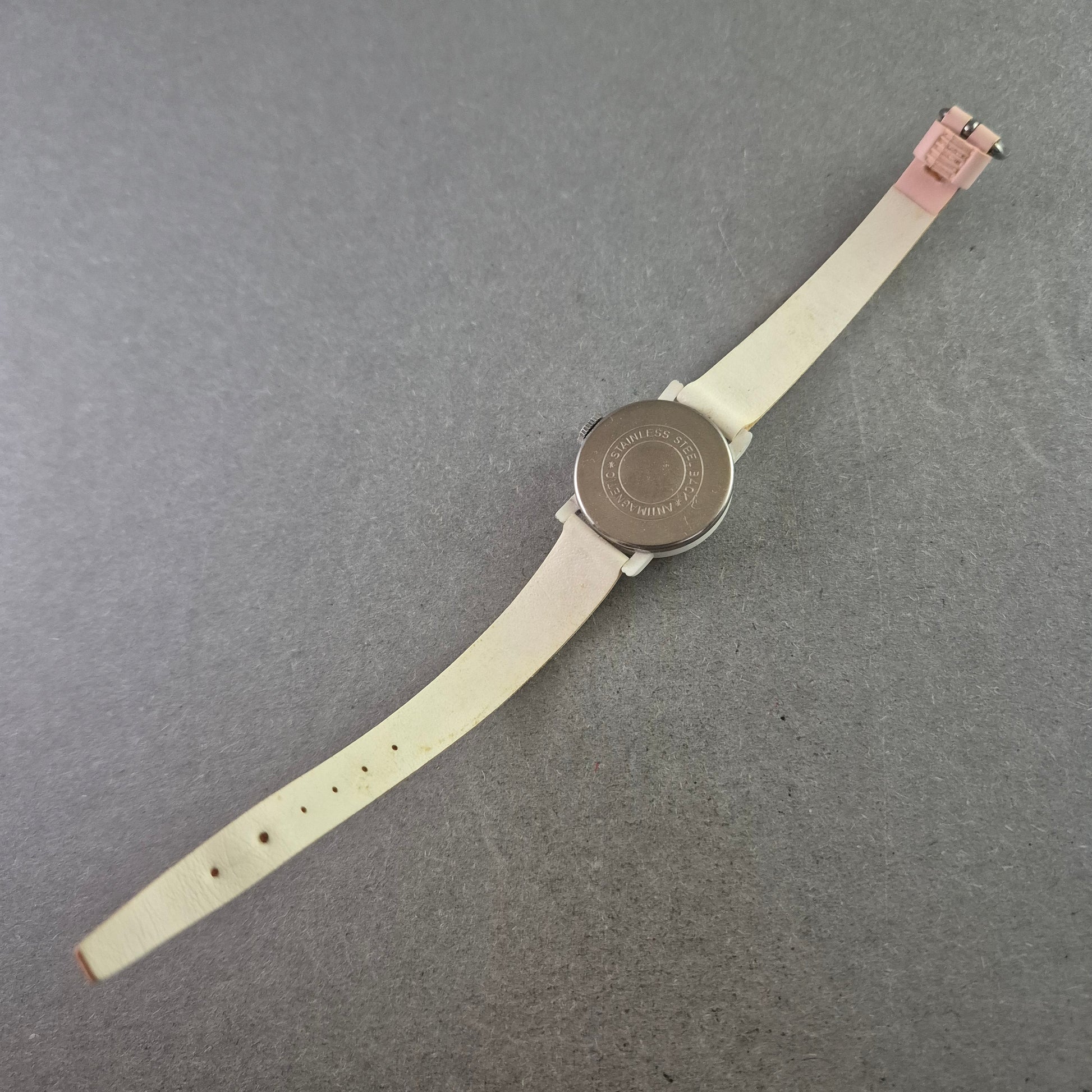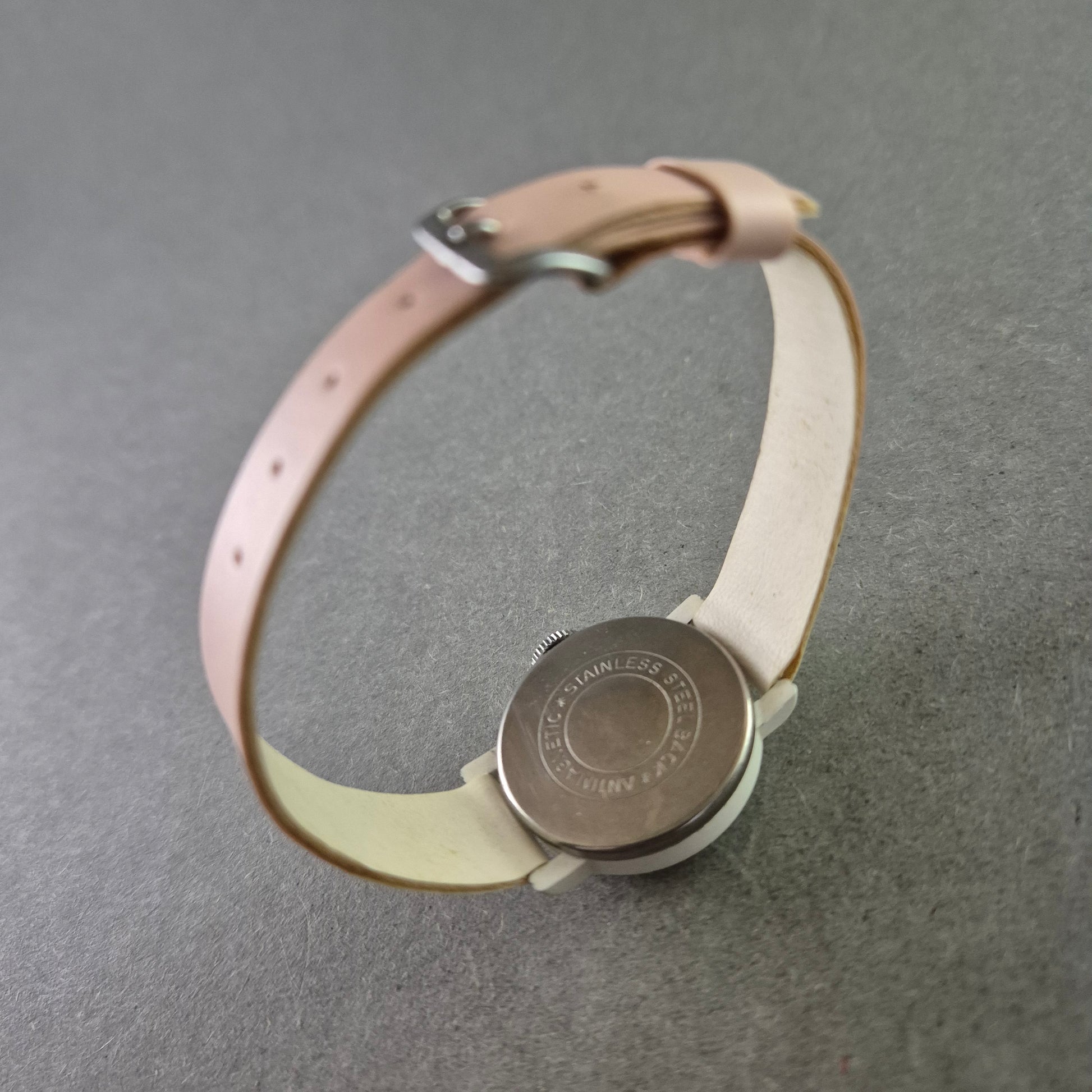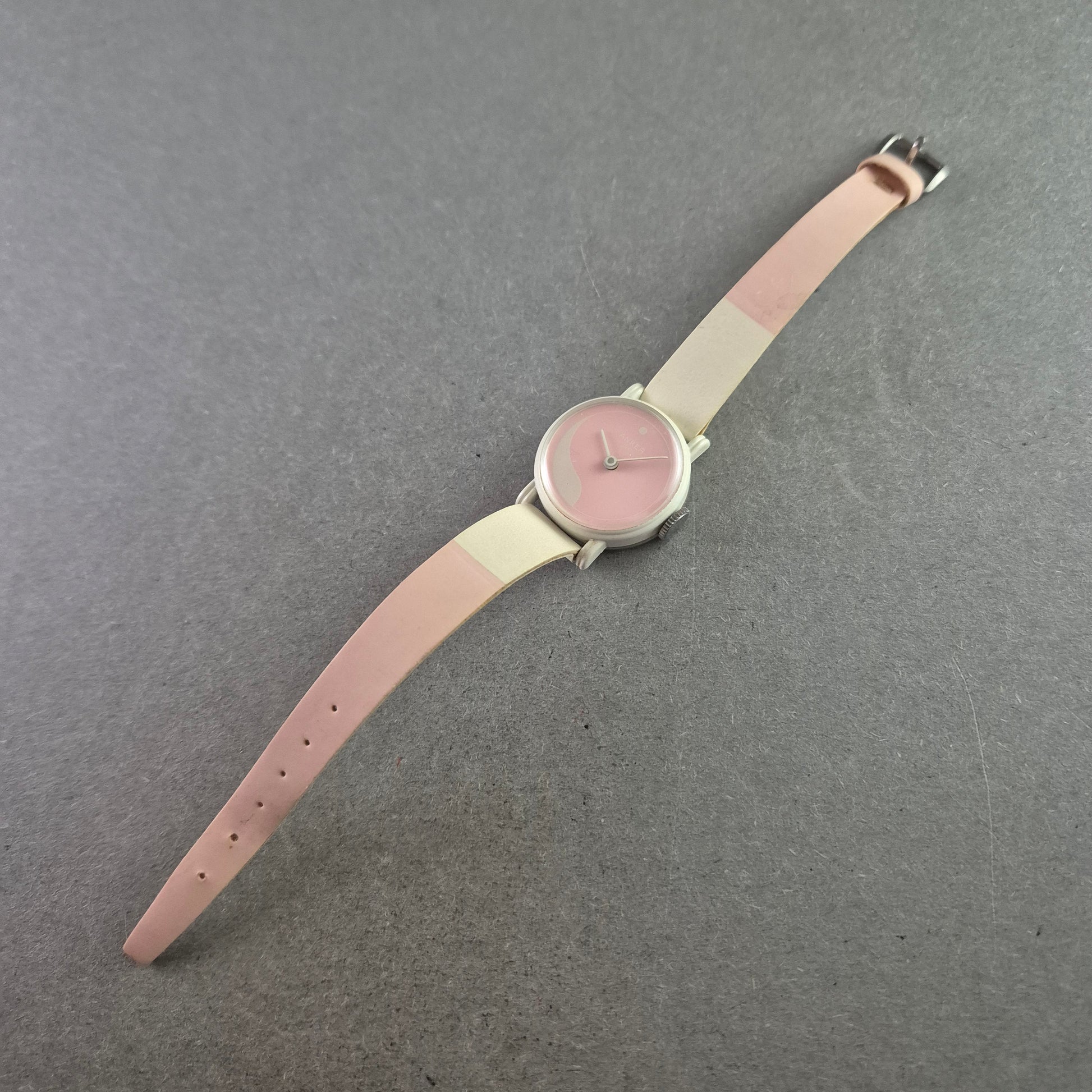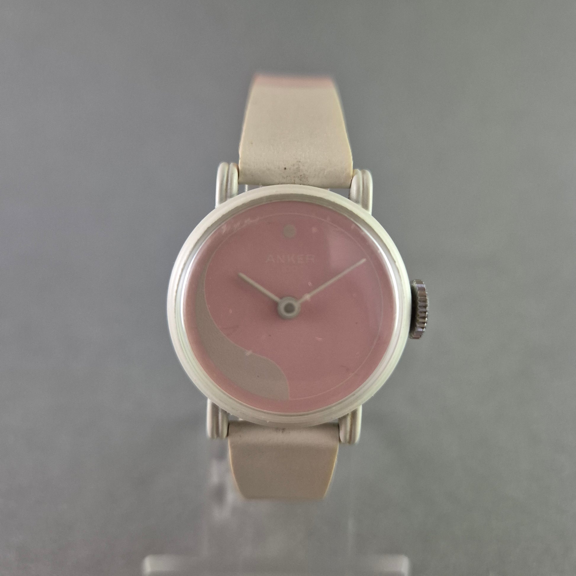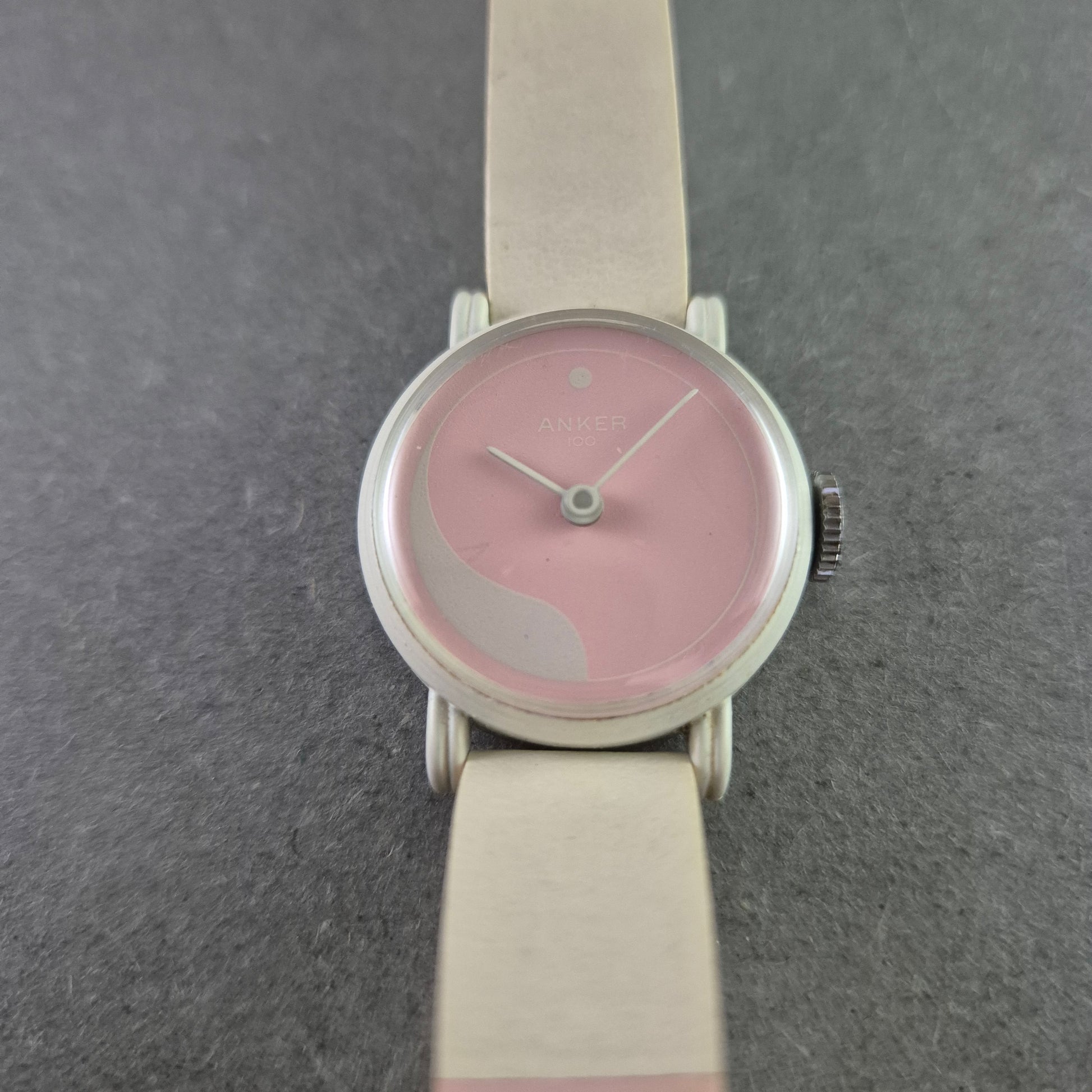 Diese charmante Damenarmbanduhr der Marke Anker besticht durch ihr feminines Design und einen verspielten Retro-Look. Das rosafarbene Zifferblatt mit minimalistischen Zeigern wirkt dezent und elegant, während das helle Kunstlederarmband den stilvollen Eindruck abrundet. Ein einzigartiges Accessoire für Liebhaberinnen nostalgischer Zeitmesser.