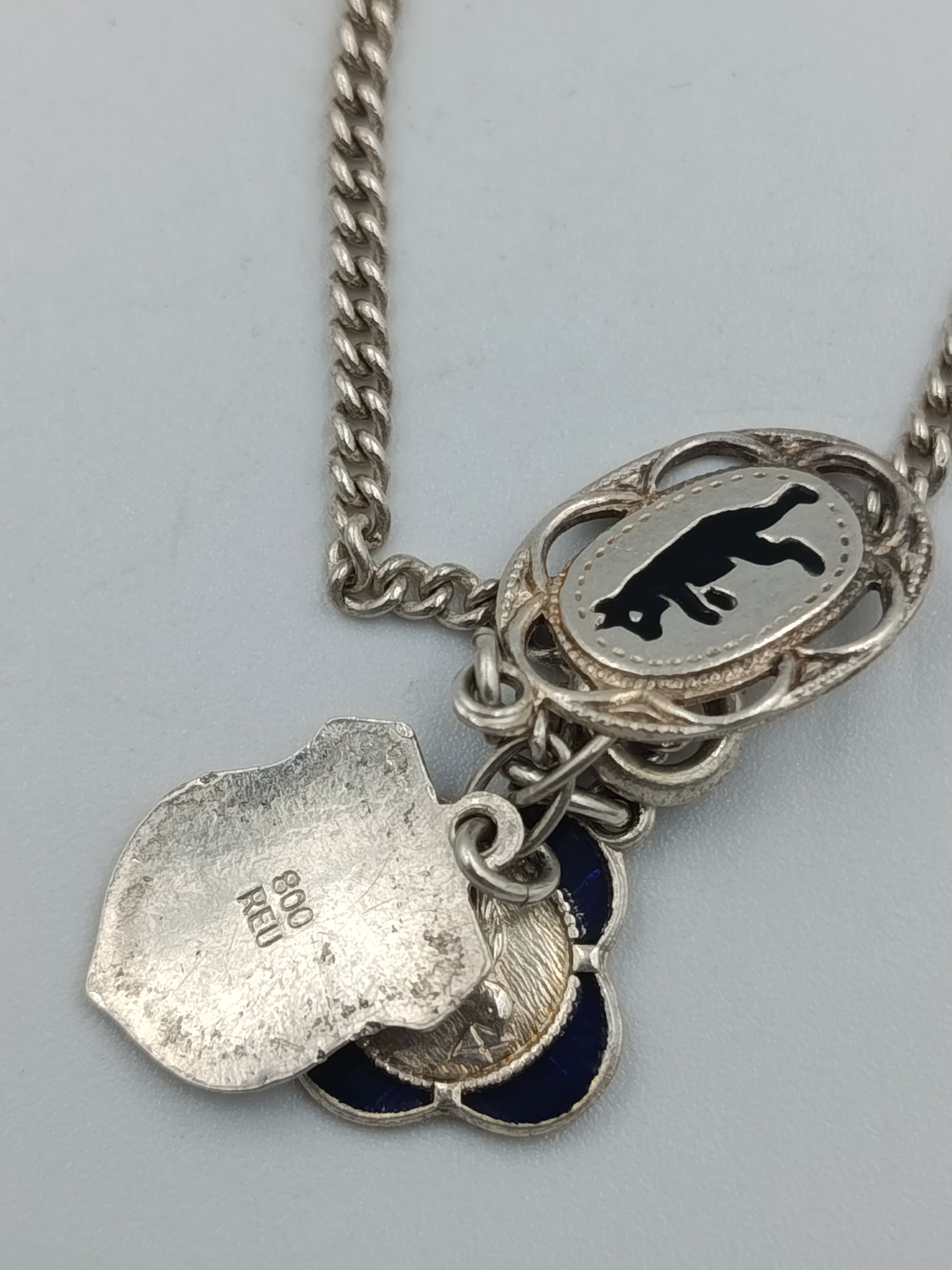 Charmantes Vintage-Armband aus 800er Silber mit drei detailreich gearbeiteten Anhängern. Besonders hervorzuheben ist der Emaille-Anhänger mit dem Berliner Bären, der dieses Schmuckstück zu einem Sammlerobjekt mit historischem Flair macht. Ergänzt wird es durch zwei weitere emaillierte Anhänger mit Tier- und Symbolmotiven. Das Armband ist filigran, leicht und zugleich nostalgisch – perfekt für Liebhaber von Souvenir- und Emaille-Schmuck.