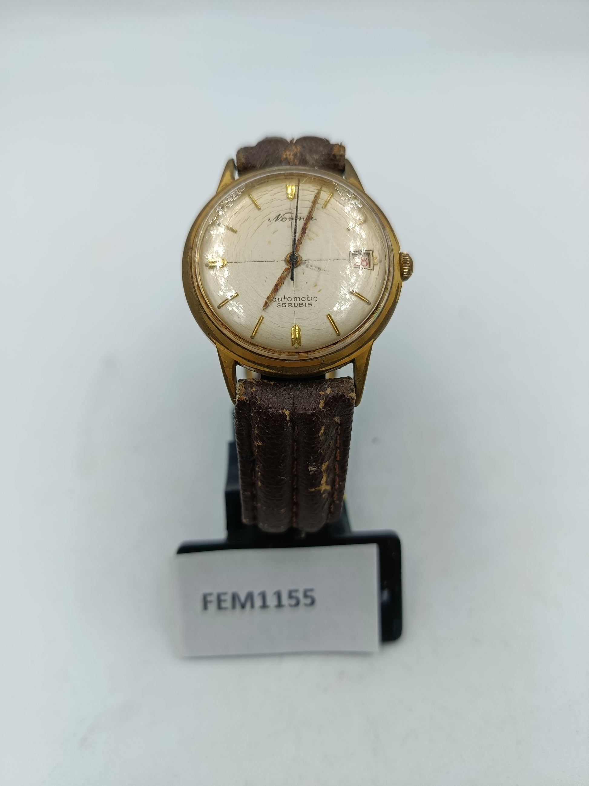 Klassische Vintage Herrenarmbanduhr der Marke Norm, ausgestattet mit einem zuverlässigen Automatikwerk (25 Rubis). Die Uhr besitzt ein vergoldetes Gehäuse und ein originales, gut getragenes Lederarmband, das den authentischen Vintage-Look unterstreicht. Ein Sammlerstück mit Charme, deutlicher Patina und einem zeitlosen Design.