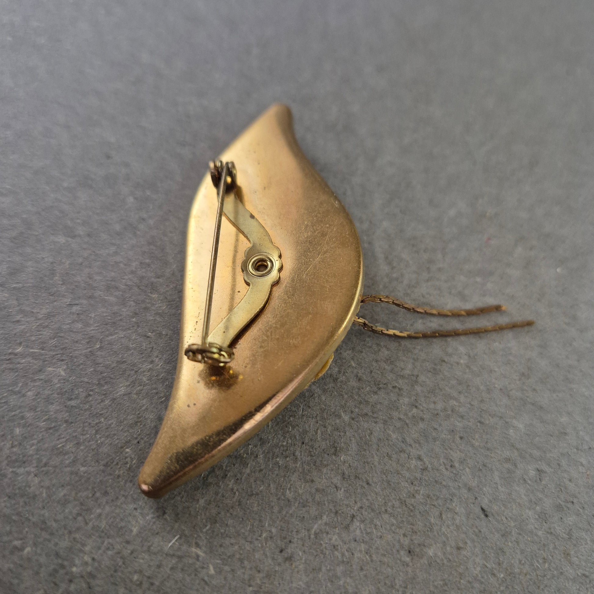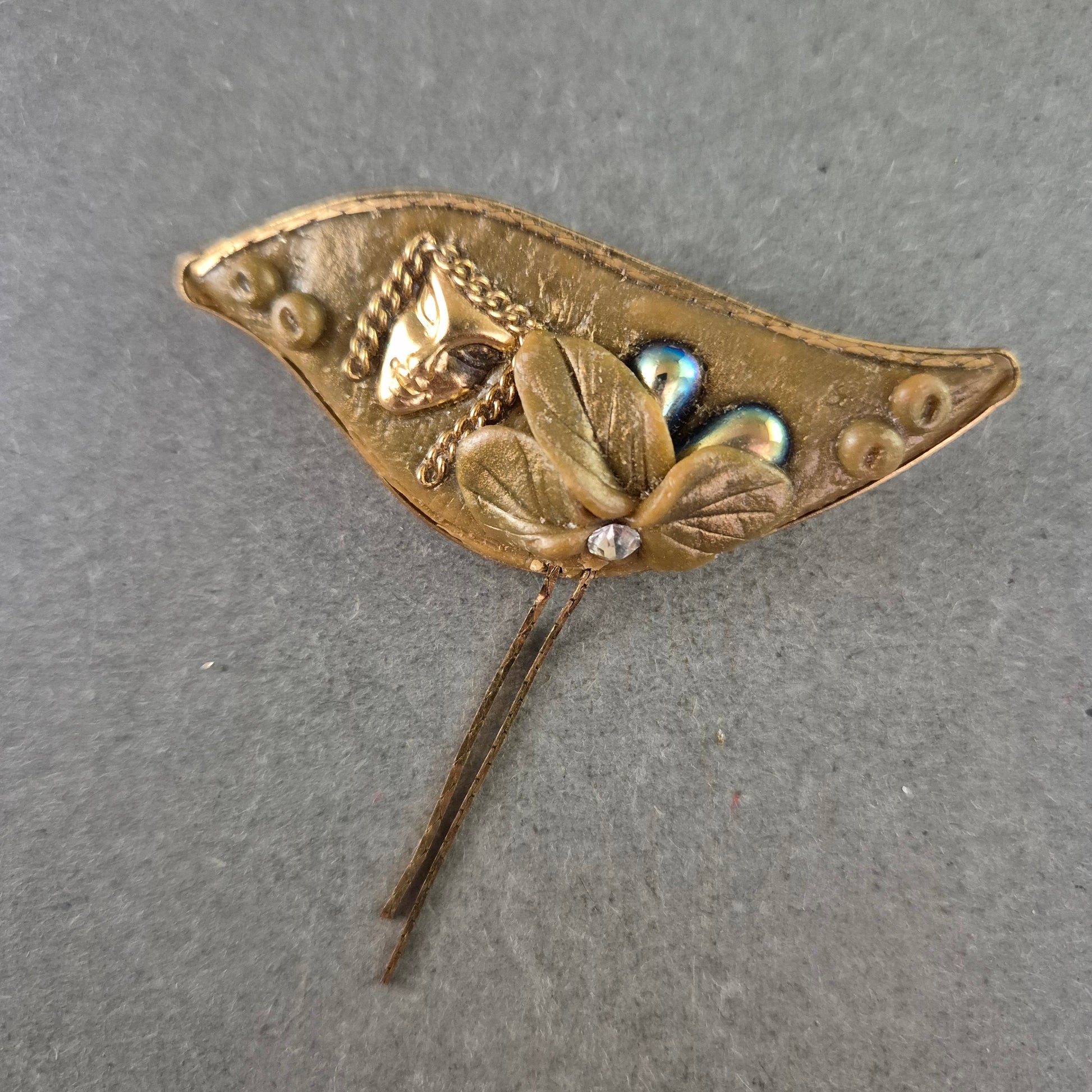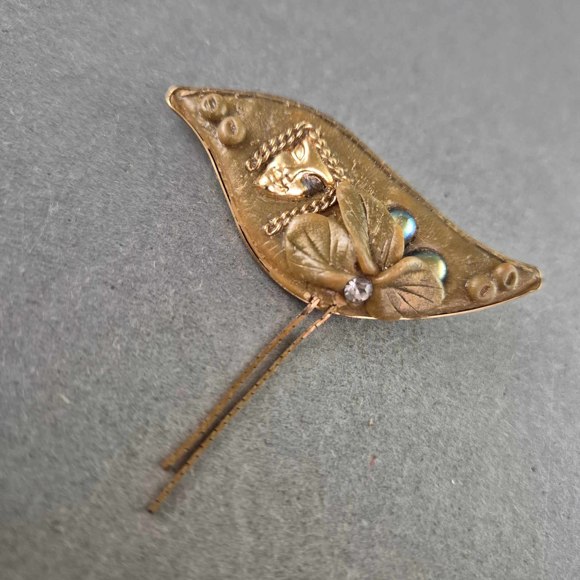 Diese antike Brosche im Jugendstil besticht durch ihr außergewöhnliches Design: Ein zart modelliertes Gesicht mit floralen Elementen und schimmernden Details in Perlmutt-Optik ziert das goldfarbene Blattmotiv. Die fein gravierten Blätter mit einem kleinen Strassstein und die herabhängenden Kettchen verleihen dem Stück eine elegante Bewegung und Tiefe. Ein echtes Sammlerstück für Liebhaber von nostalgischem Schmuck und künstlerischer Handwerkskunst.