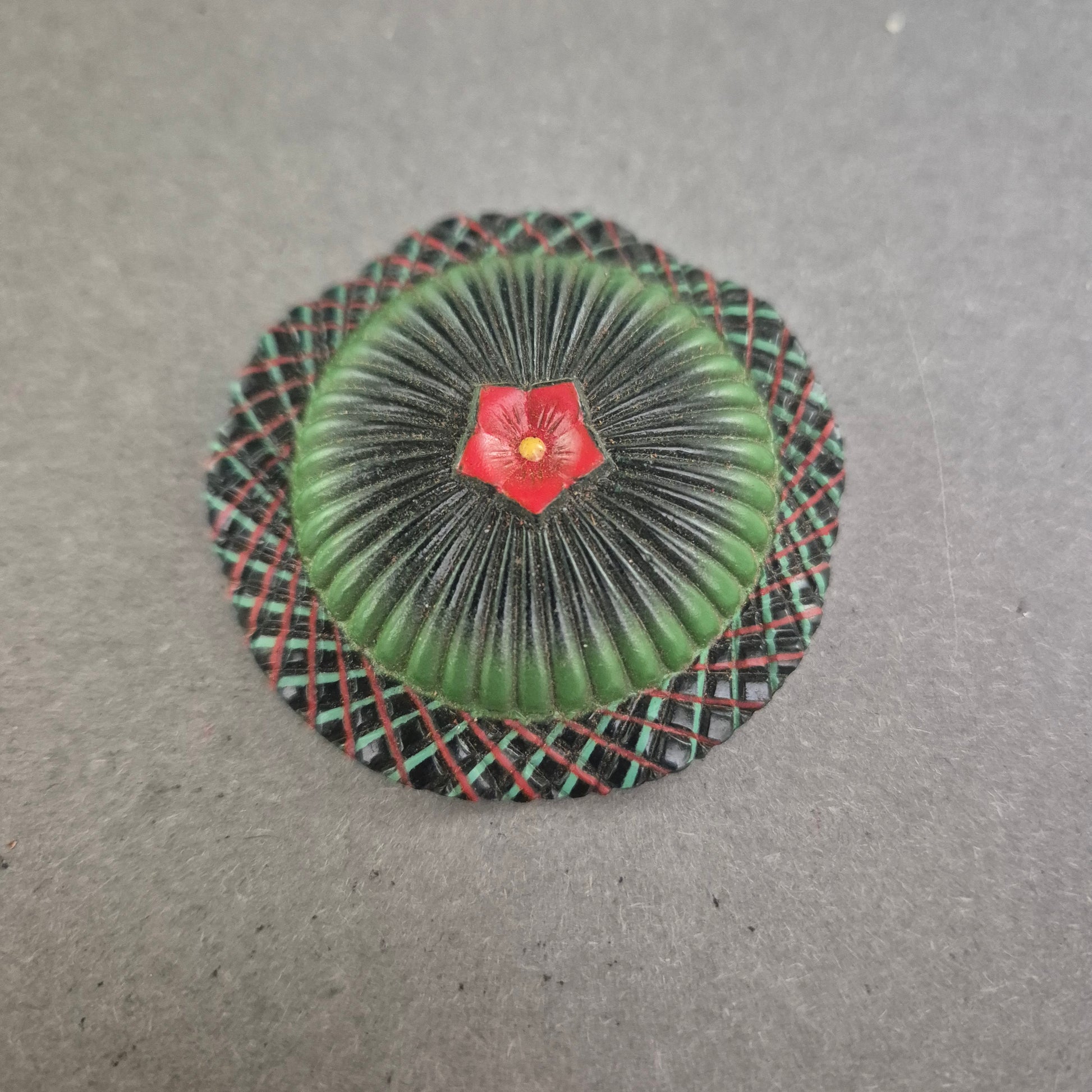 Diese auffällige Vintage-Brosche aus Bakelit vereint traditionelle Elemente mit künstlerischem Flair. Im Zentrum steht eine rote Blume, die sich kontrastreich vom gerippten, dunkelgrünen Mittelteil abhebt. Der äußere Rand ist im detailverliebten Schottenmuster gestaltet, was der Brosche eine klassische britische Note verleiht. Ideal als Hingucker auf Mantel, Bluse oder Hut.
