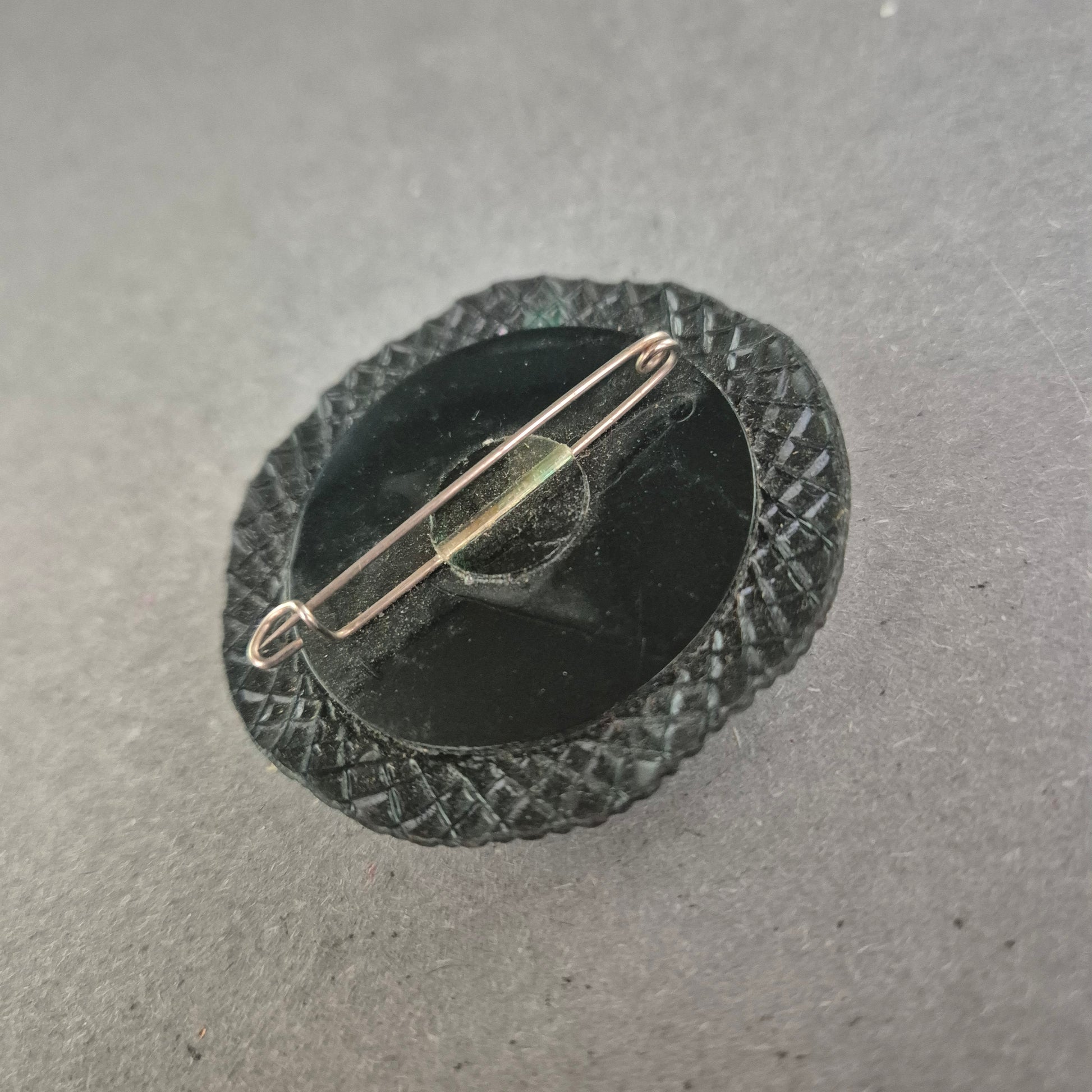 Vintage Brosche im Schottenmuster mit floraler Gravur – Unikat aus Bakelit