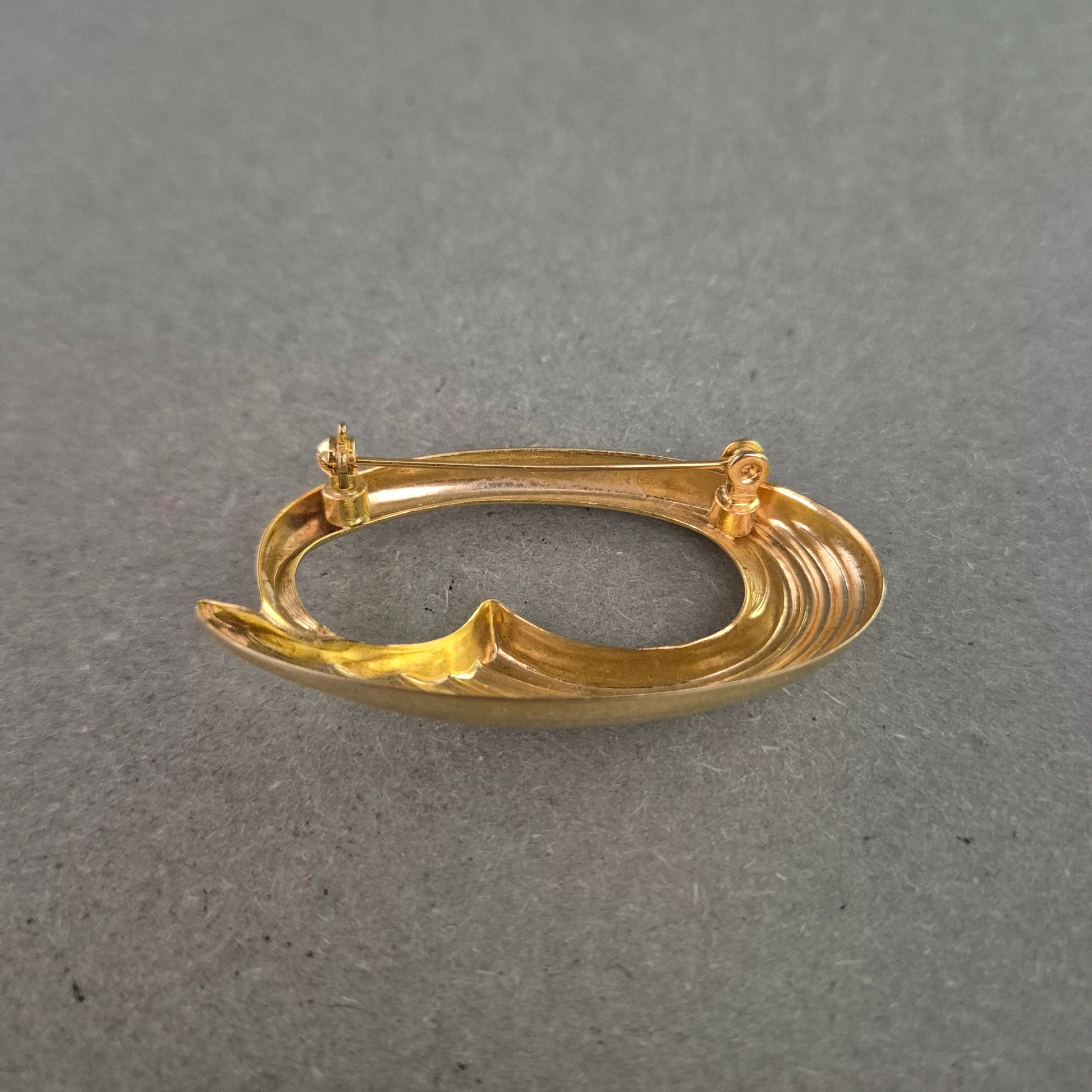 Diese elegante Brosche im Retro-Stil der 1980er-Jahre beeindruckt durch ihr geschwungenes Design in hochwertiger Goldoptik. Die Mischung aus glänzenden und gebürsteten Flächen verleiht ihr eine edle Ausstrahlung und macht sie zum idealen Accessoire für Blusen, Jacken oder Mäntel. Mit stabilem Steckverschluss ausgestattet, ist sie nicht nur stilvoll, sondern auch praktisch im Alltag.