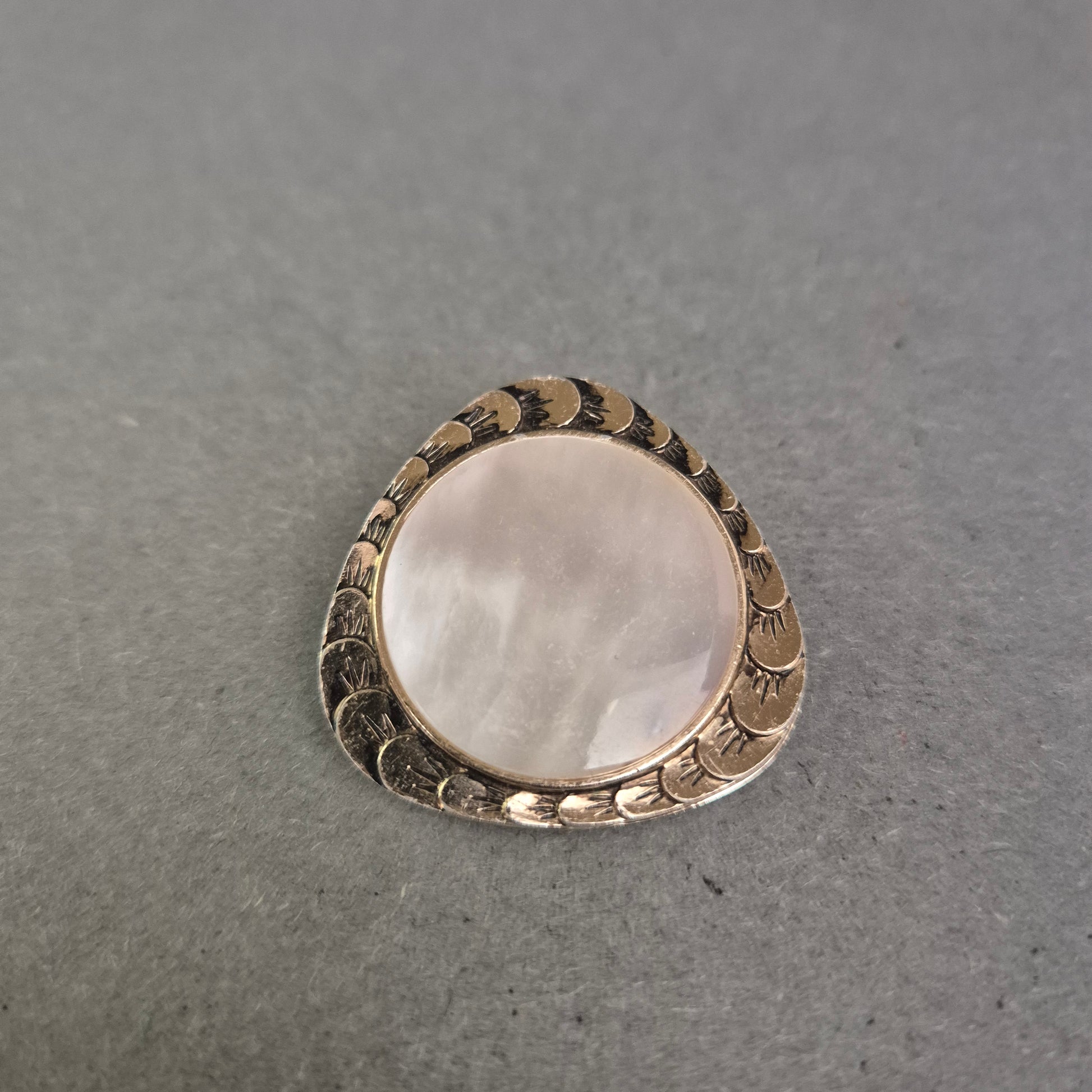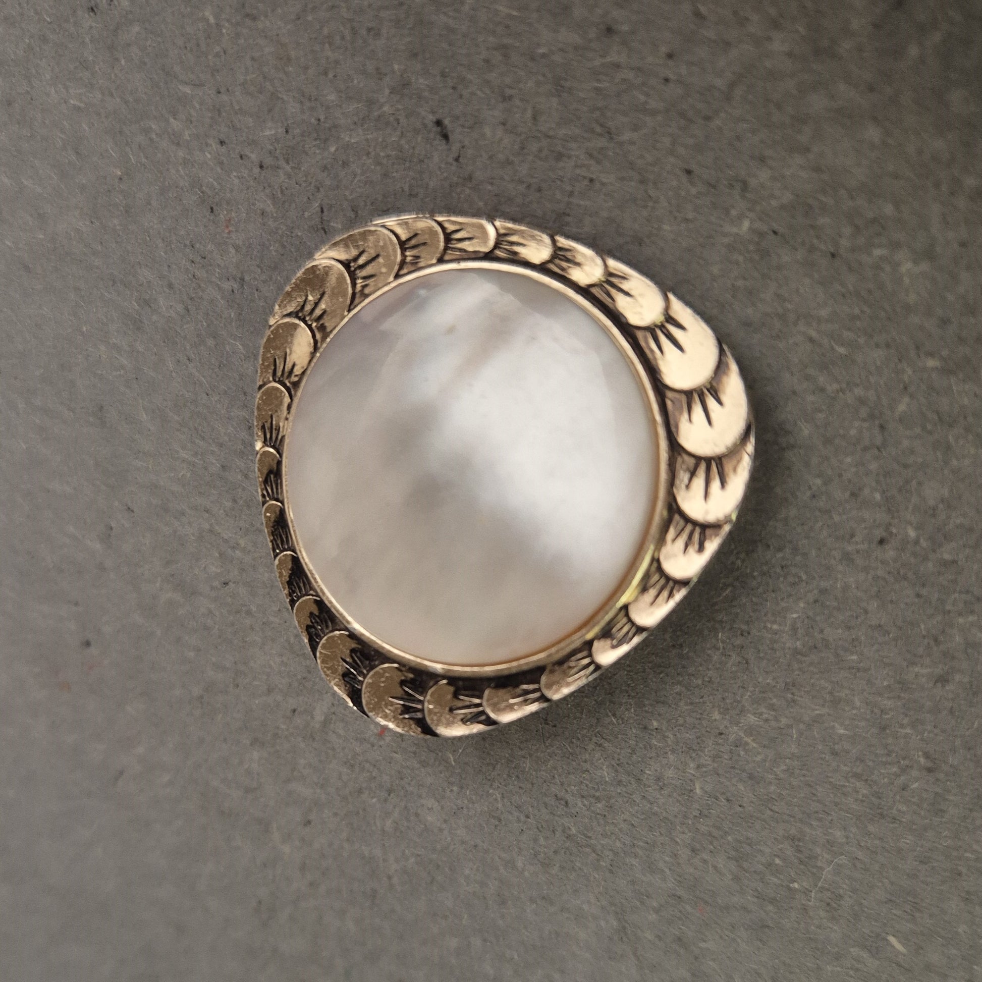 Diese dekorative Vintage-Brosche besticht durch ihr tropfenförmiges Design mit einer schimmernden Perlmutt-Intarsie im Zentrum. Der goldfarbene Rahmen ist mit einem floralen Muster versehen, das dem Schmuckstück einen eleganten und zugleich natürlichen Charakter verleiht. Ideal als klassisches Accessoire oder Sammlerstück.