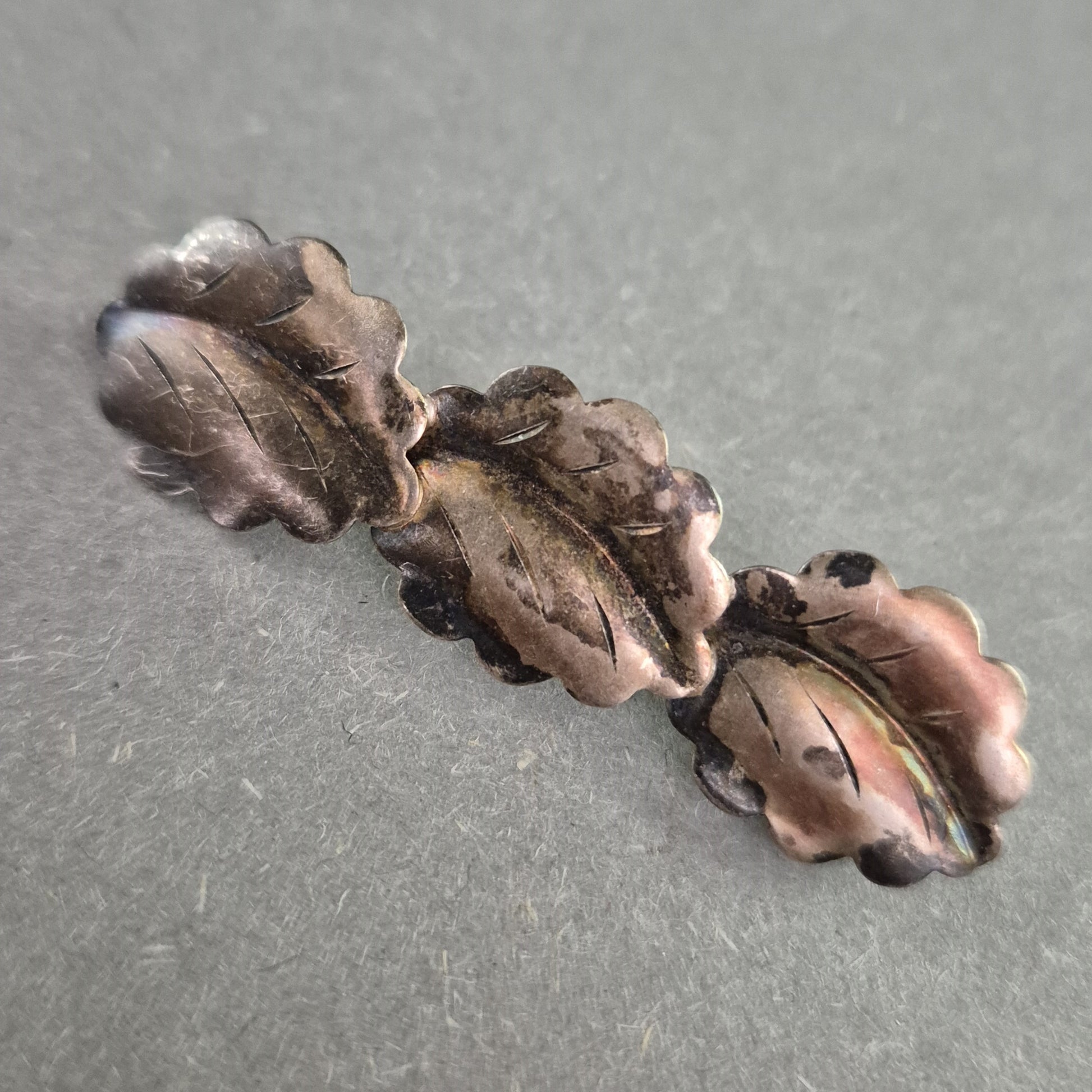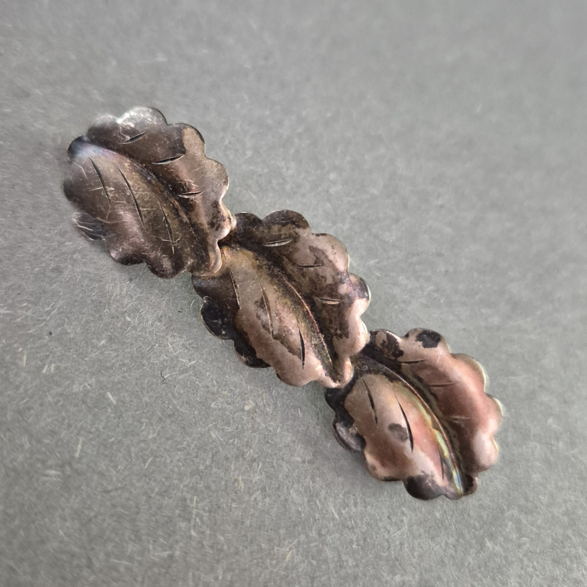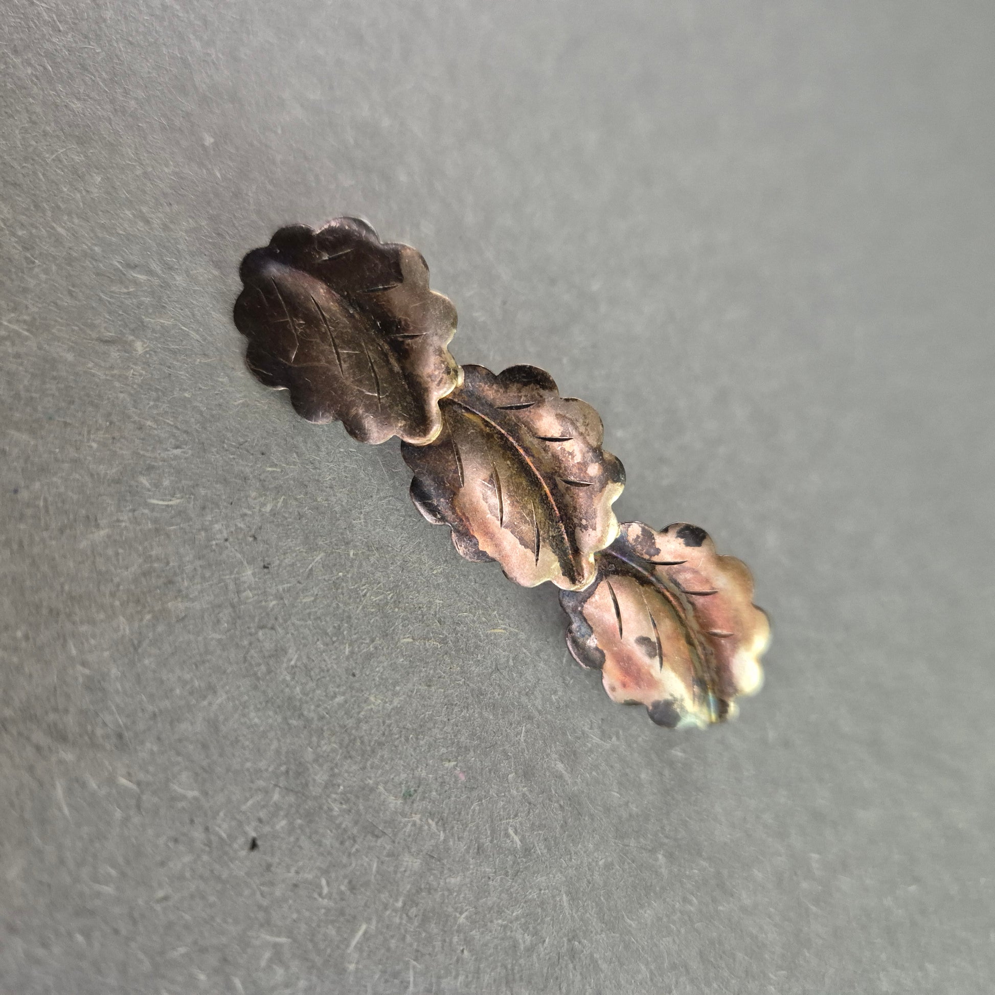 Diese charmante Vintage-Brosche zeigt drei detailliert gearbeitete Blätter mit natürlicher Form und zarter Linienführung. Die dunkle Patina verleiht dem Schmuckstück einen authentischen, antiken Charakter und macht es zu einem markanten Accessoire für naturverbundene Schmuckliebhaber.