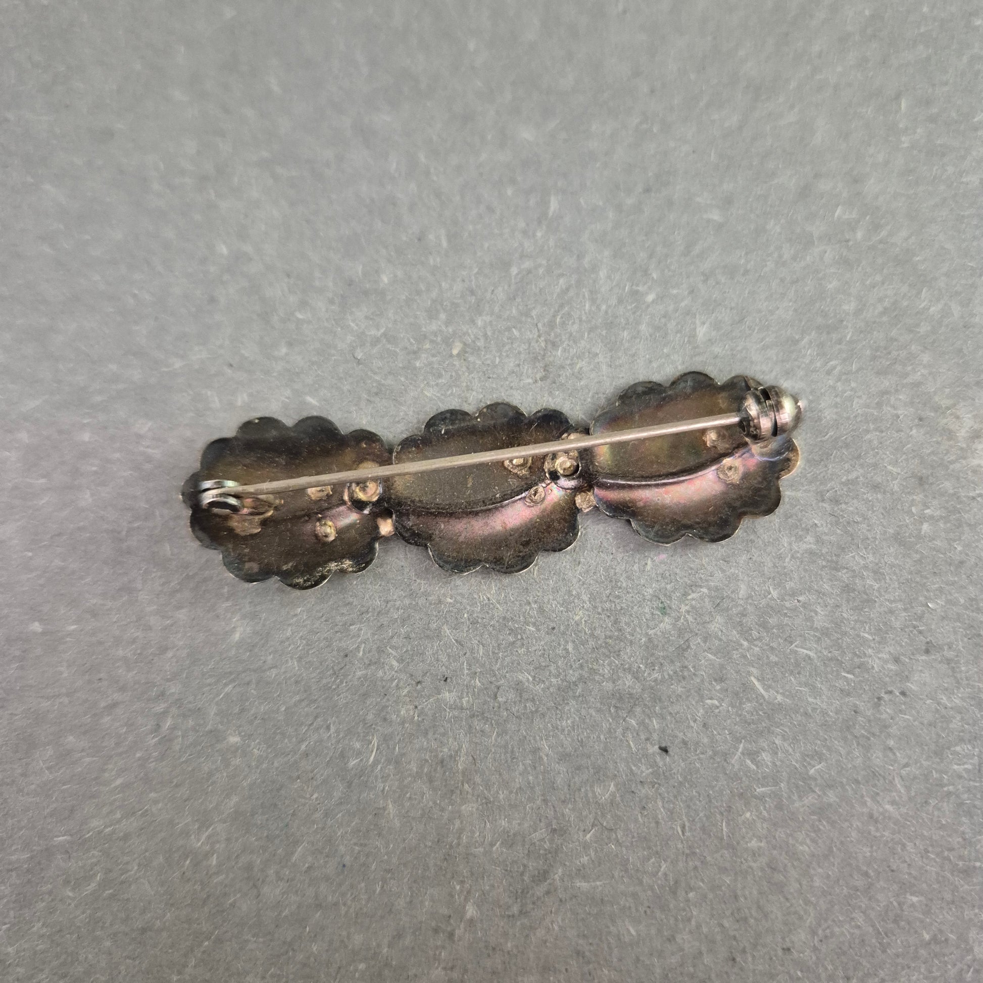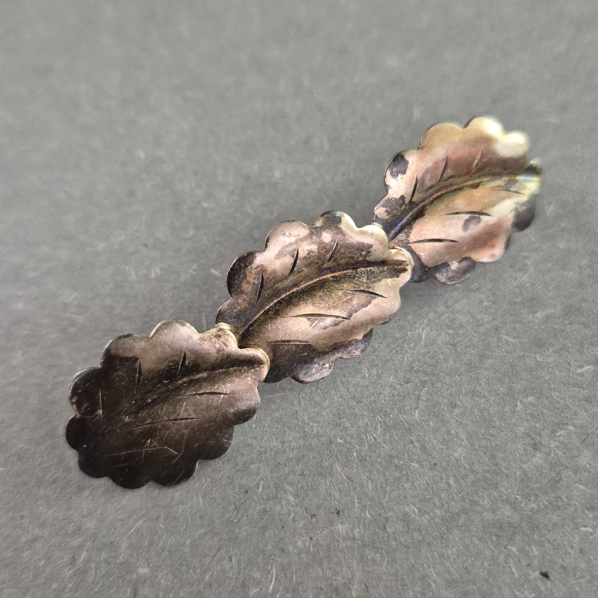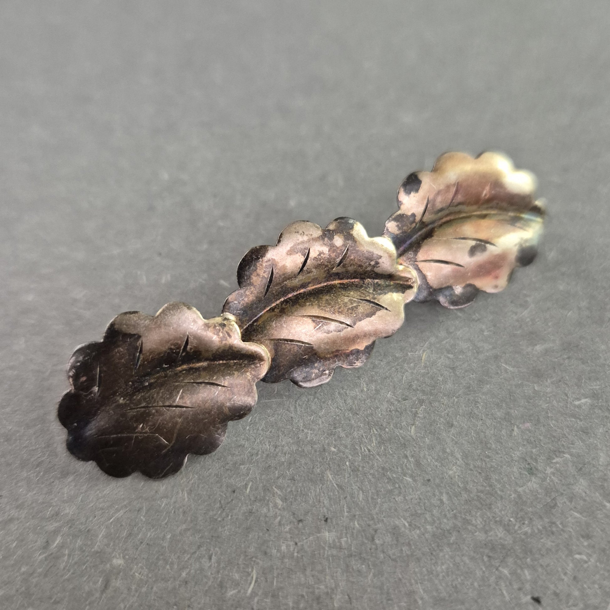Diese charmante Vintage-Brosche zeigt drei detailliert gearbeitete Blätter mit natürlicher Form und zarter Linienführung. Die dunkle Patina verleiht dem Schmuckstück einen authentischen, antiken Charakter und macht es zu einem markanten Accessoire für naturverbundene Schmuckliebhaber.