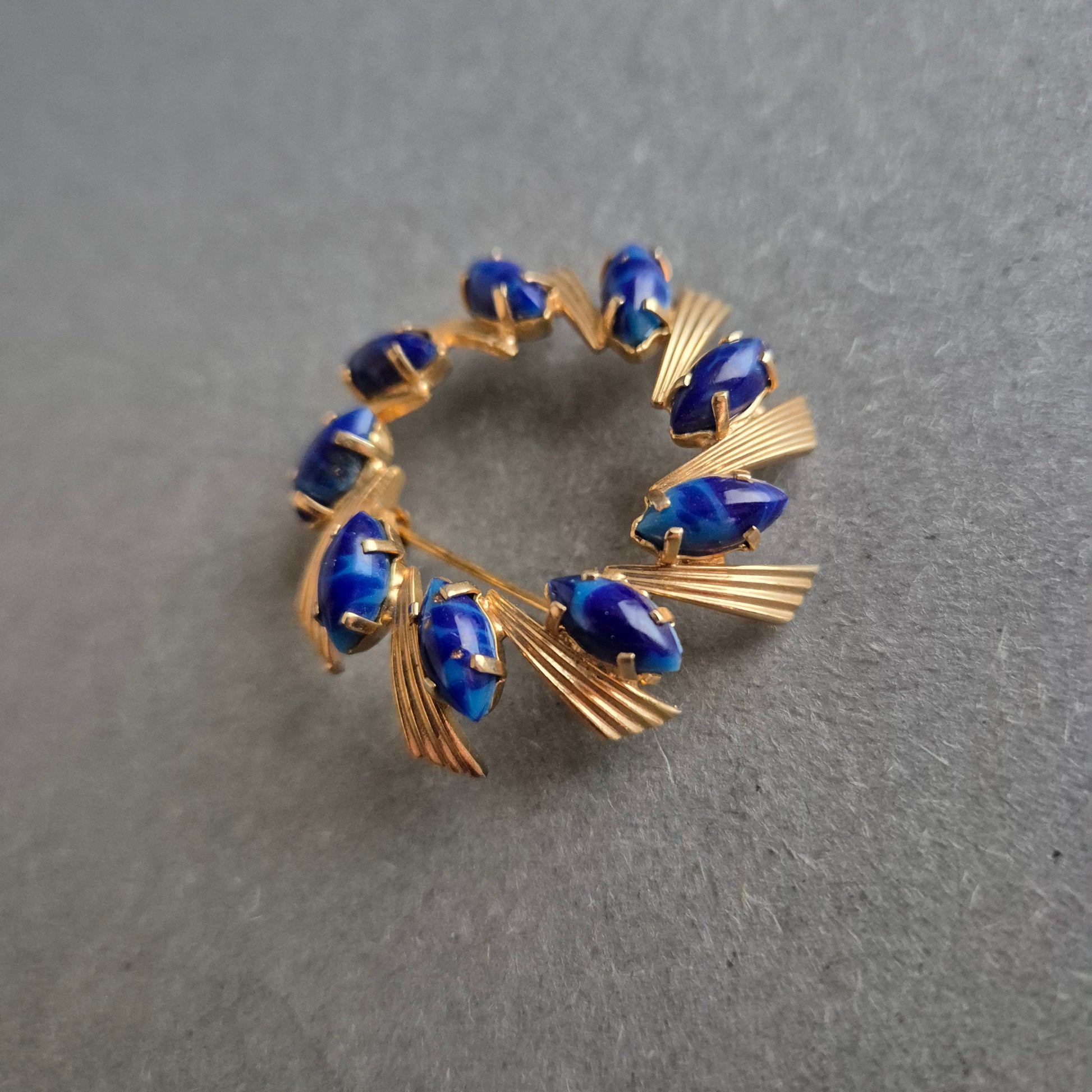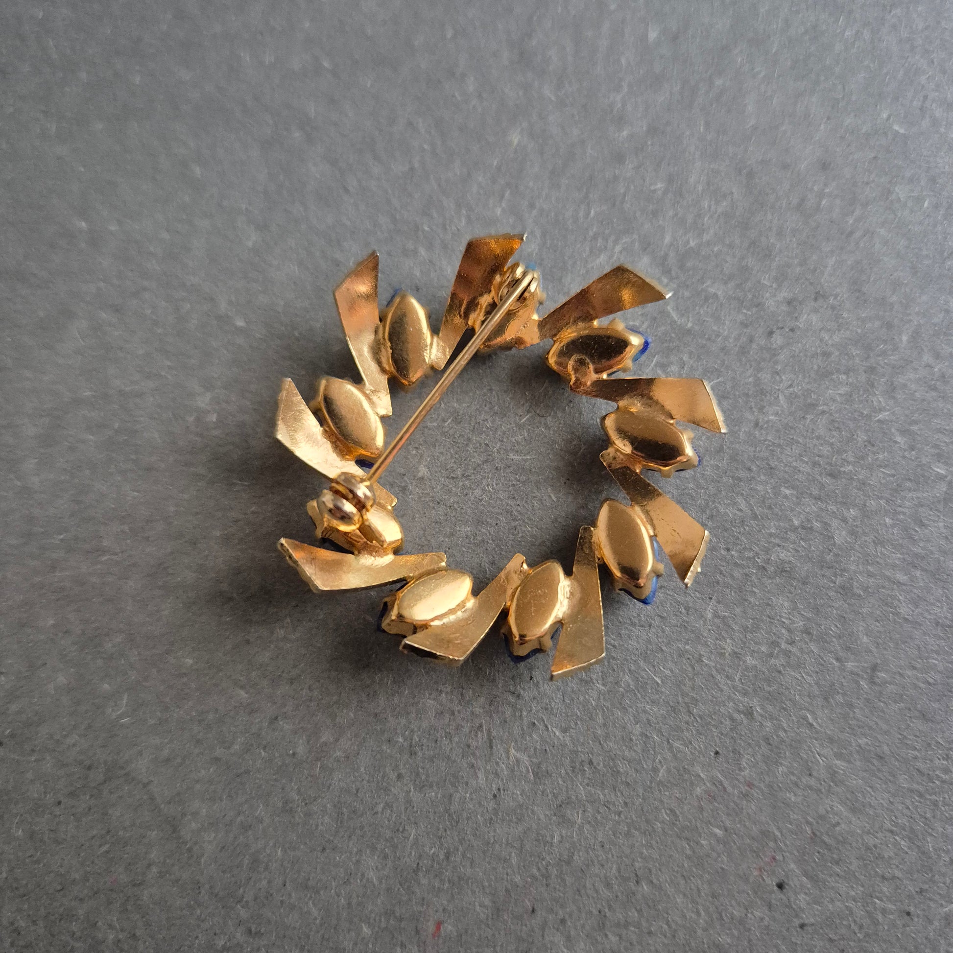 Diese elegante Vintage-Brosche im runden Design überzeugt durch ihre tiefblauen Schmucksteine in Navette-Form, die von vergoldeten Metallflügeln gehalten werden. Das Arrangement erinnert an ein stilisiertes Blumen- oder Sonnenmotiv und verleiht jedem Outfit einen Hauch von Glamour und Nostalgie. Ideal als stilvoller Akzent an Bluse, Jacke oder Kleid – ein echtes Statement-Piece für Liebhaberinnen von Retro-Schmuck.