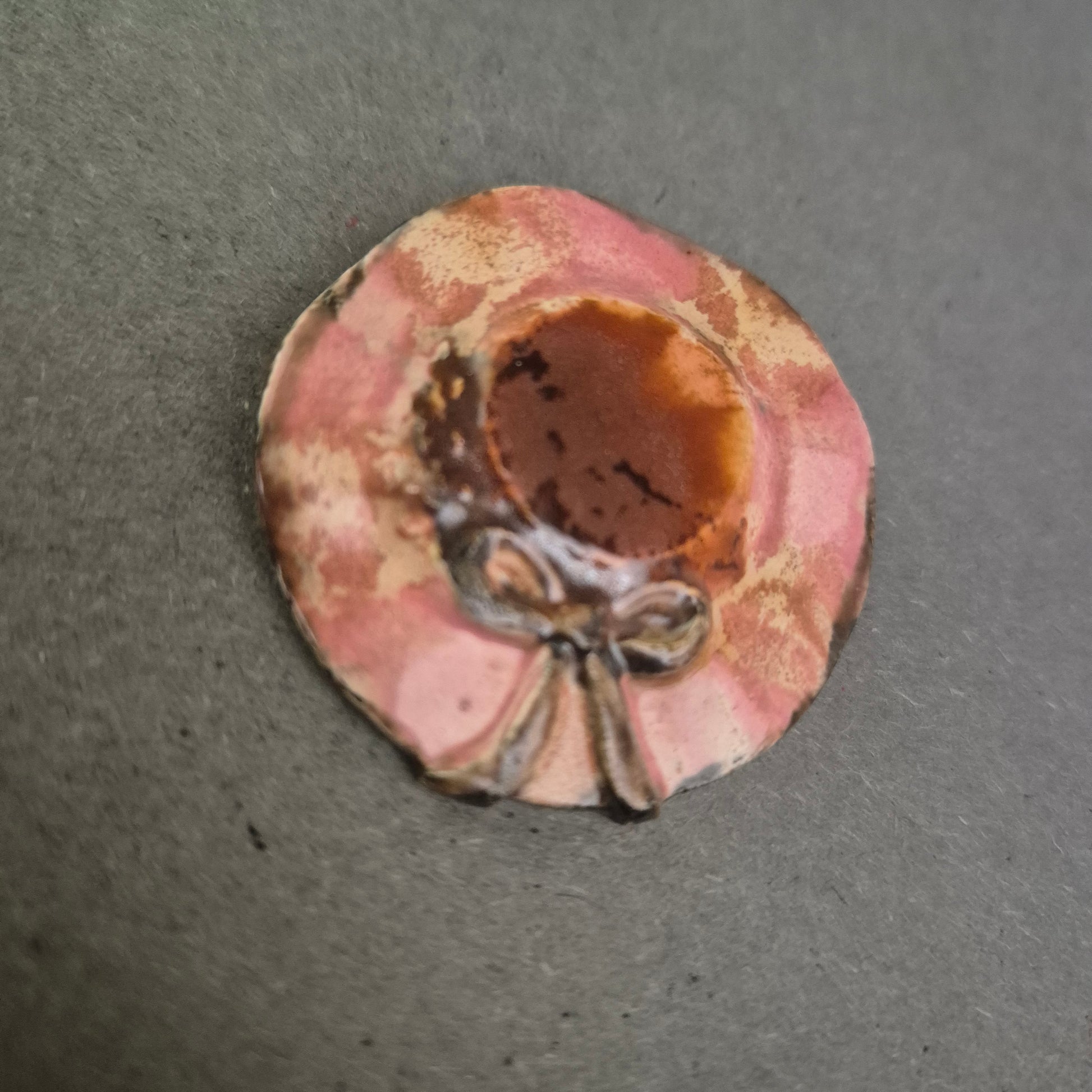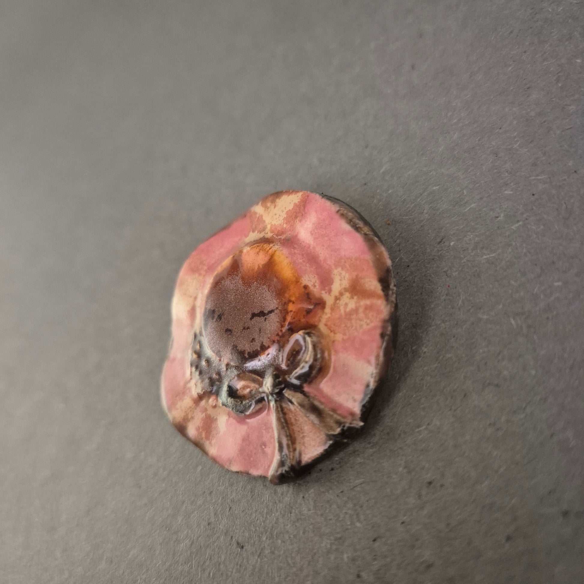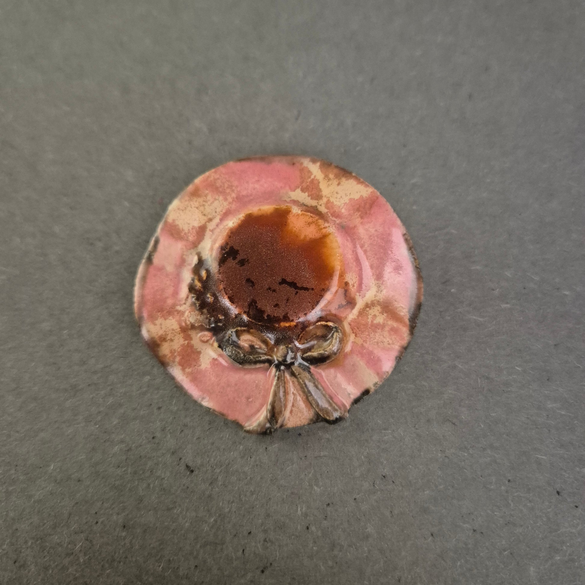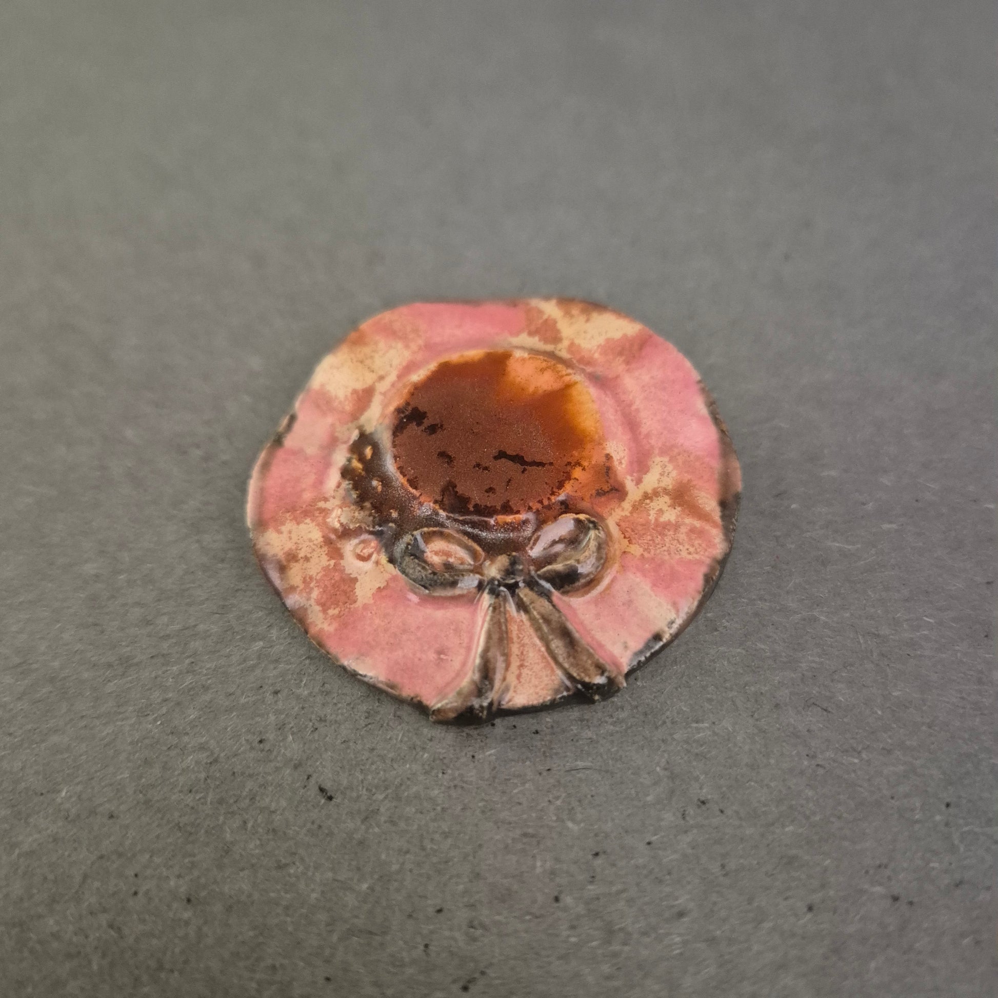Diese charmante Vintage-Brosche im floralen Design zeigt eine detailreiche Handbemalung in Rosé- und Brauntönen, die an eine natürliche Blütenform erinnert. Die Rückseite ist mit einer klassischen Sicherheitsnadel ausgestattet. Aufgrund der liebevoll gestalteten Oberfläche eignet sich dieses Schmuckstück perfekt als nostalgisches Accessoire für Jacken, Blusen oder Taschen.