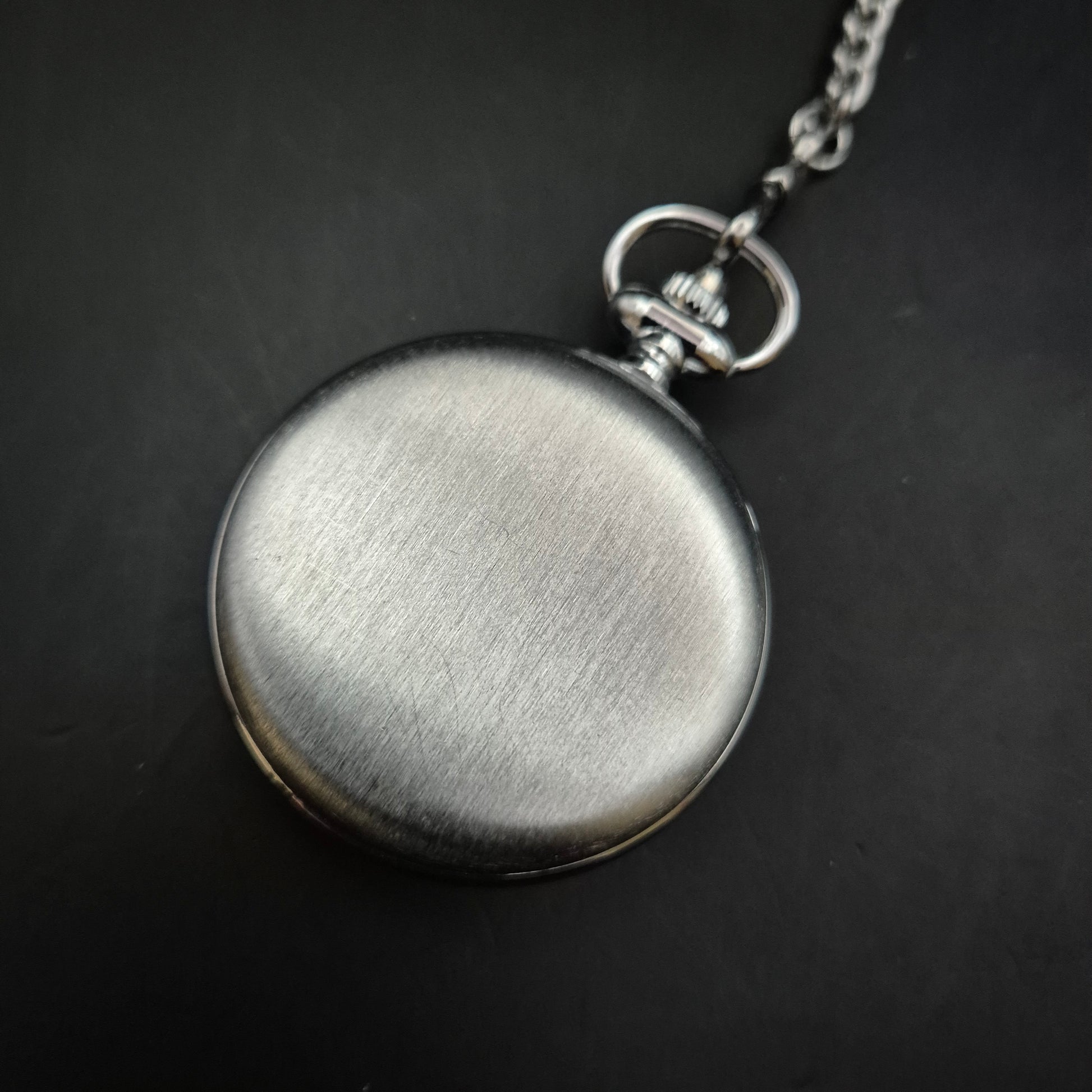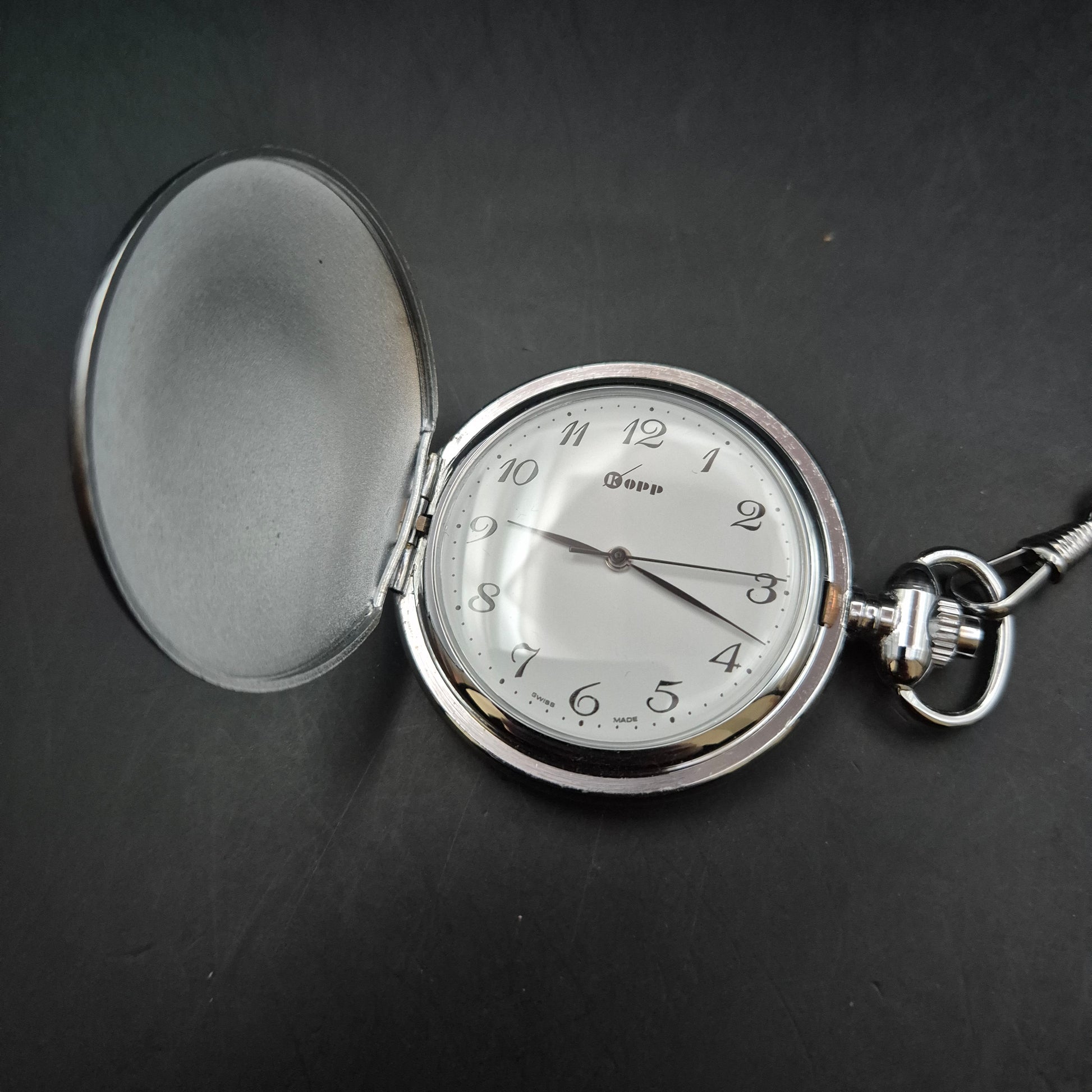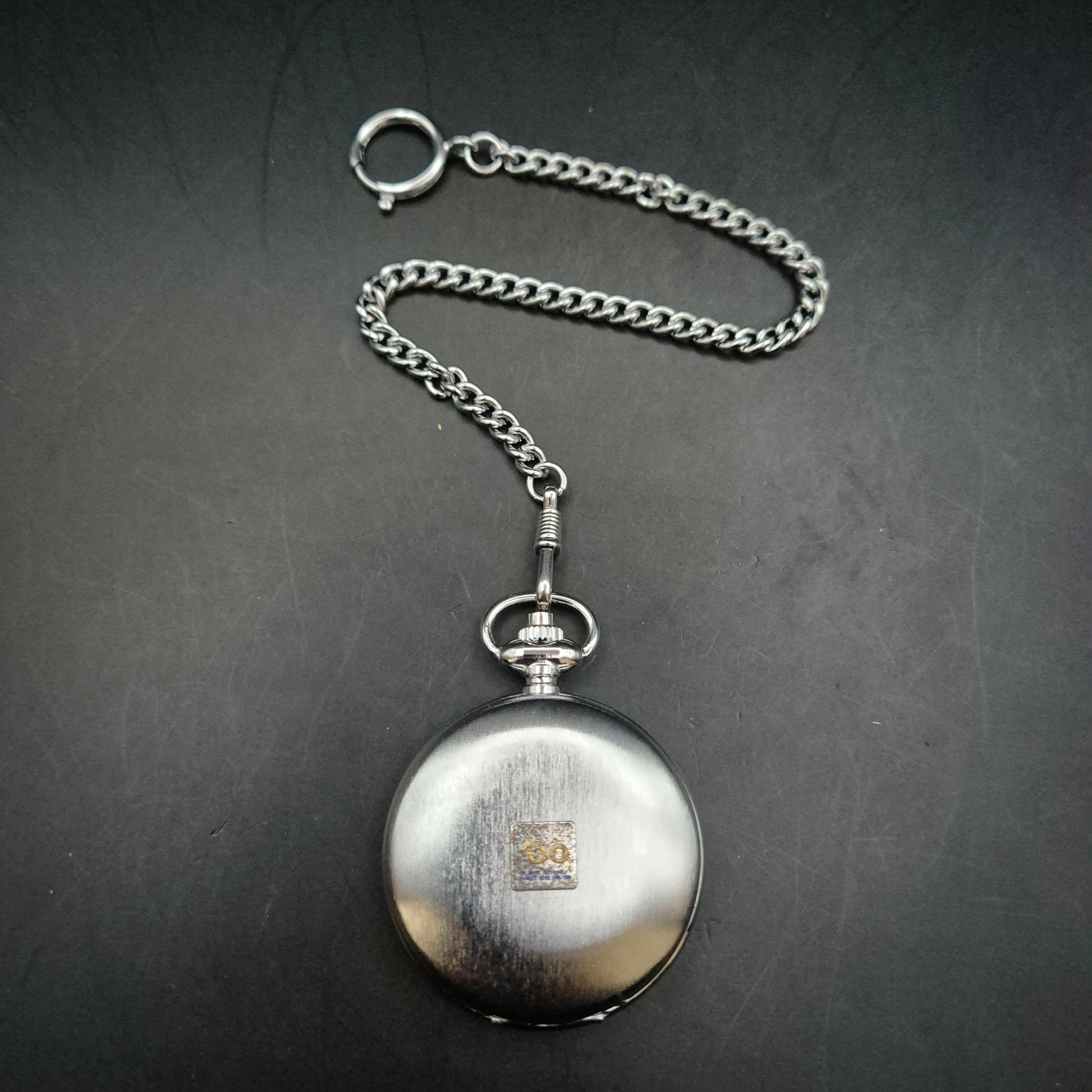 Diese klassische Herren Taschen Uhr der Marke DOXA verkörpert zeitlose Eleganz und traditionellen Stil. Das runde, silberfarbene Gehäuse hat eine glatte, polierte Oberfläche und öffnet sich, um ein klares Zifferblatt mit arabischen Ziffern und schlanken Zeigern freizugeben. Ein kleines Abzeichen mit der Zahl "50" auf der Rückseite deutet möglicherweise auf ein Jubiläum oder eine besondere Ausgabe hin. Die Uhr wird von einer robusten Gliederkette ergänzt, mit der sie sicher befestigt werden kann. Ein ideales Accessoire für den stilbewussten Herrn, der Vintage-Charme schätzt. Details: