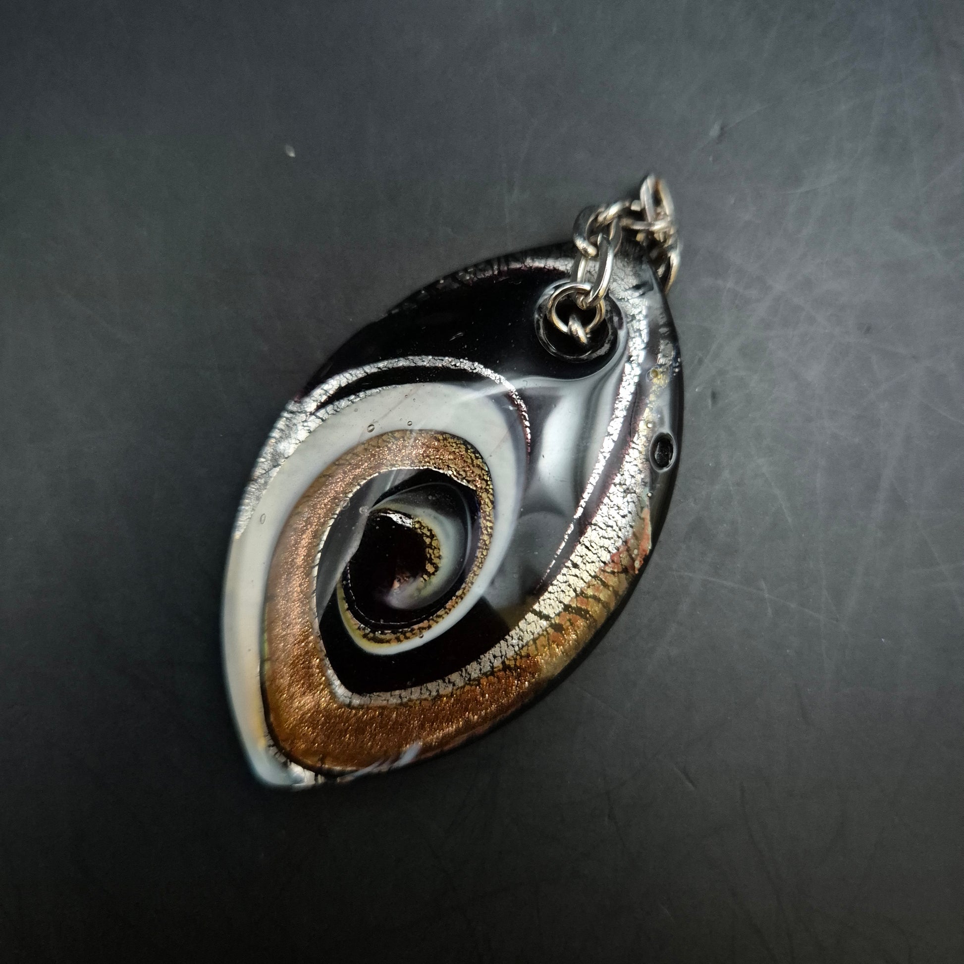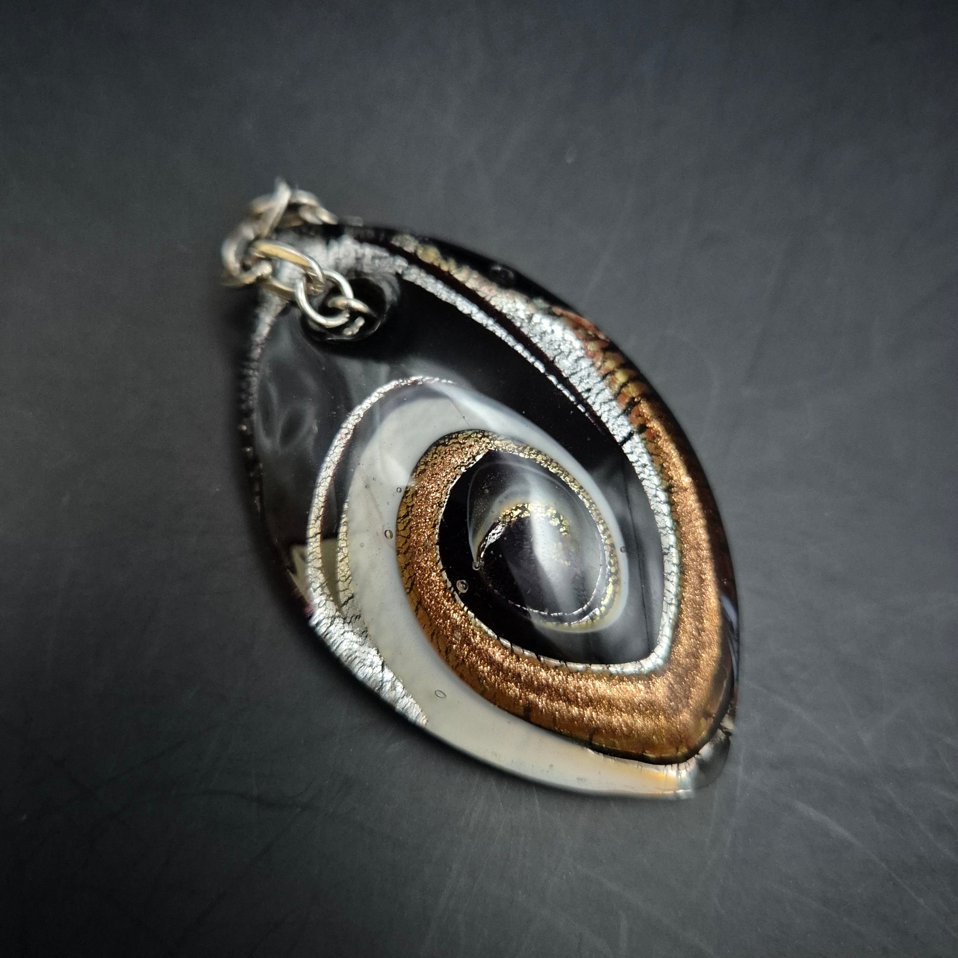 Dieser kunstvolle Glasanhänger besticht durch sein einzigartiges, abstraktes Design. Im Inneren des tiefschwarzen Glases wirbelt eine Spirale aus schimmernden Gold- und Silbertönen, die bei Lichteinfall faszinierend funkelt. Die hochwertige Verarbeitung im Stil von Muranoglas macht das Schmuckstück zu einem kleinen Kunstwerk. Perfekt als extravaganter Blickfang an einer schlichten Kette oder als besonderes Geschenk für Liebhaber von individuellem Schmuck.