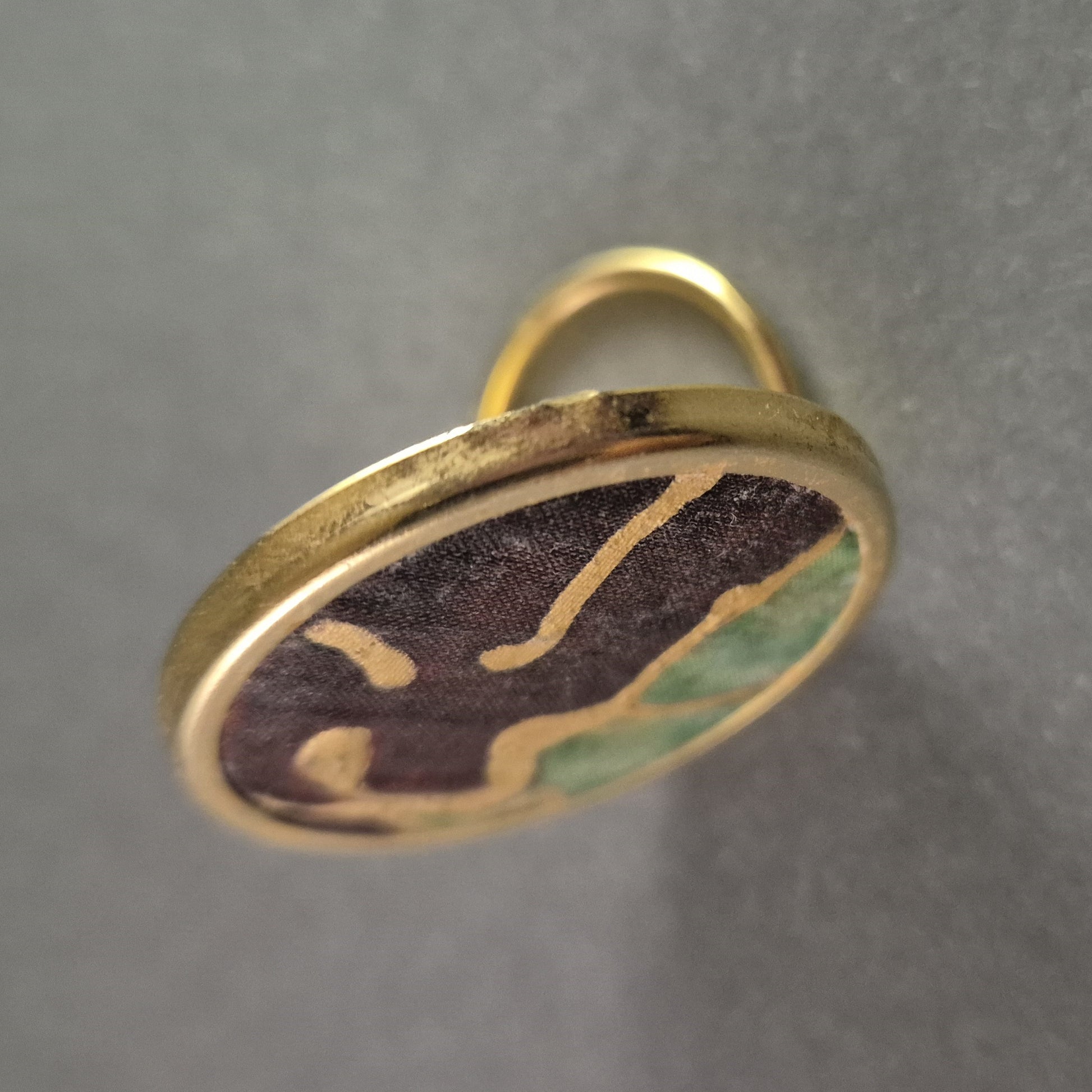 Dieser außergewöhnliche Vintage-Goldclip besticht durch sein kunstvolles, abstraktes Stoffmuster in Grün- und Brauntönen mit goldfarbenen Akzenten. Die runde Form und die vergoldete Metallfassung verleihen diesem Schmuckstück eine besondere Eleganz. Die Rückseite verfügt über eine praktische Clip-Vorrichtung mit einem Ring, der vielseitige Tragemöglichkeiten ermöglicht. Ein einzigartiges Accessoire für Liebhaber besonderer Vintage-Schmuckstücke.