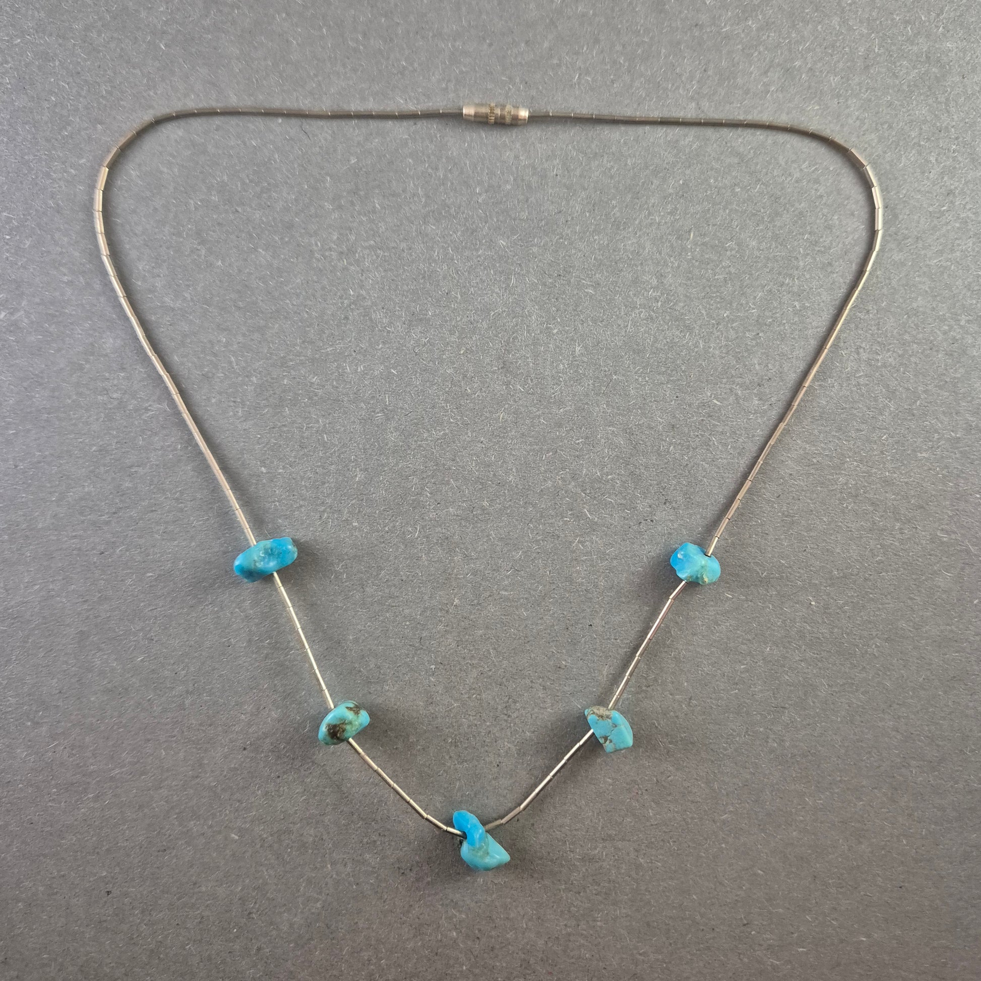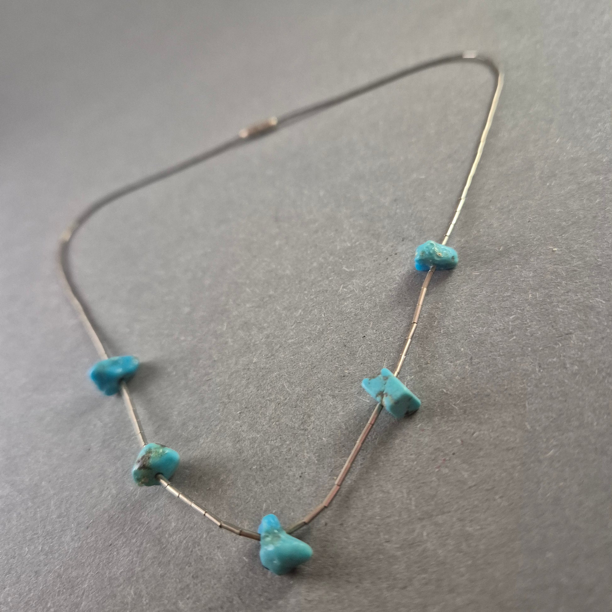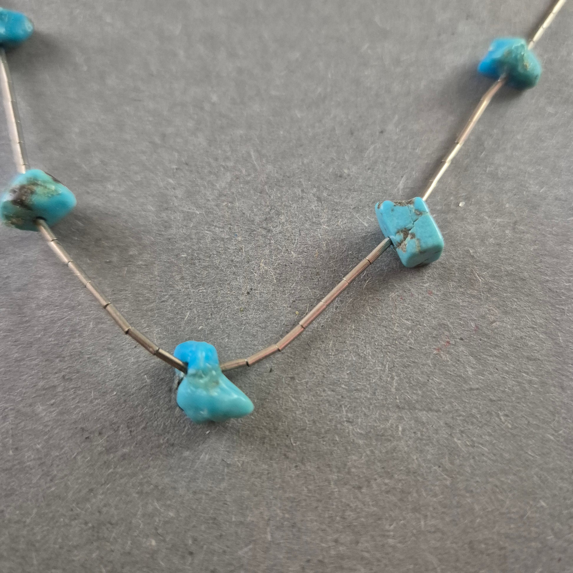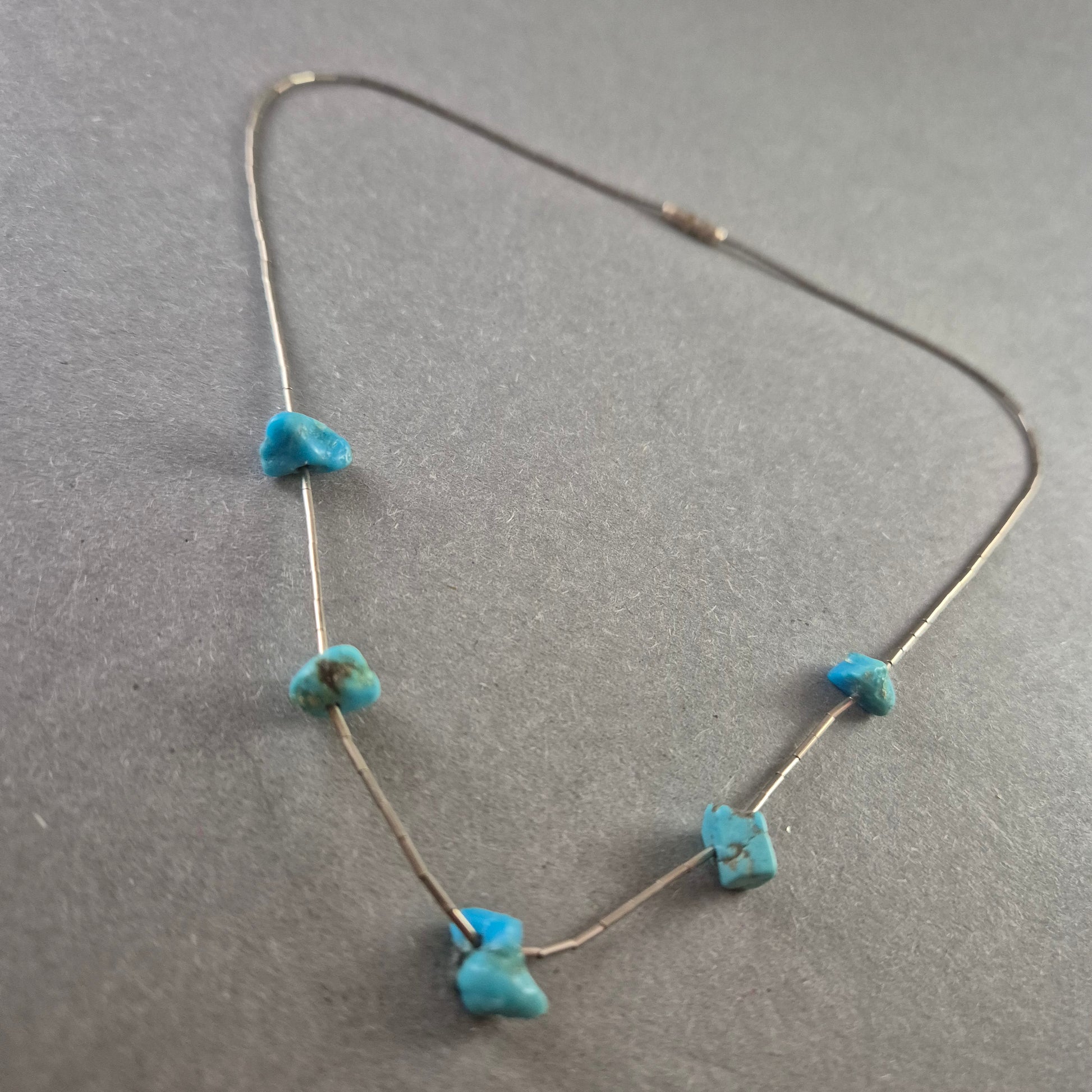 Diese charmante Vintage-Halskette vereint feine Metallröhrchen mit rohen Türkissteinchen zu einem natürlichen und gleichzeitig edlen Look. Die unregelmäßigen Formen der Steine verleihen dem Schmuckstück eine organische, individuelle Note – perfekt für Liebhaber von Boho- und Ethno-Stilen. Ideal als Einzelstück oder zum Layern mit anderen Ketten.