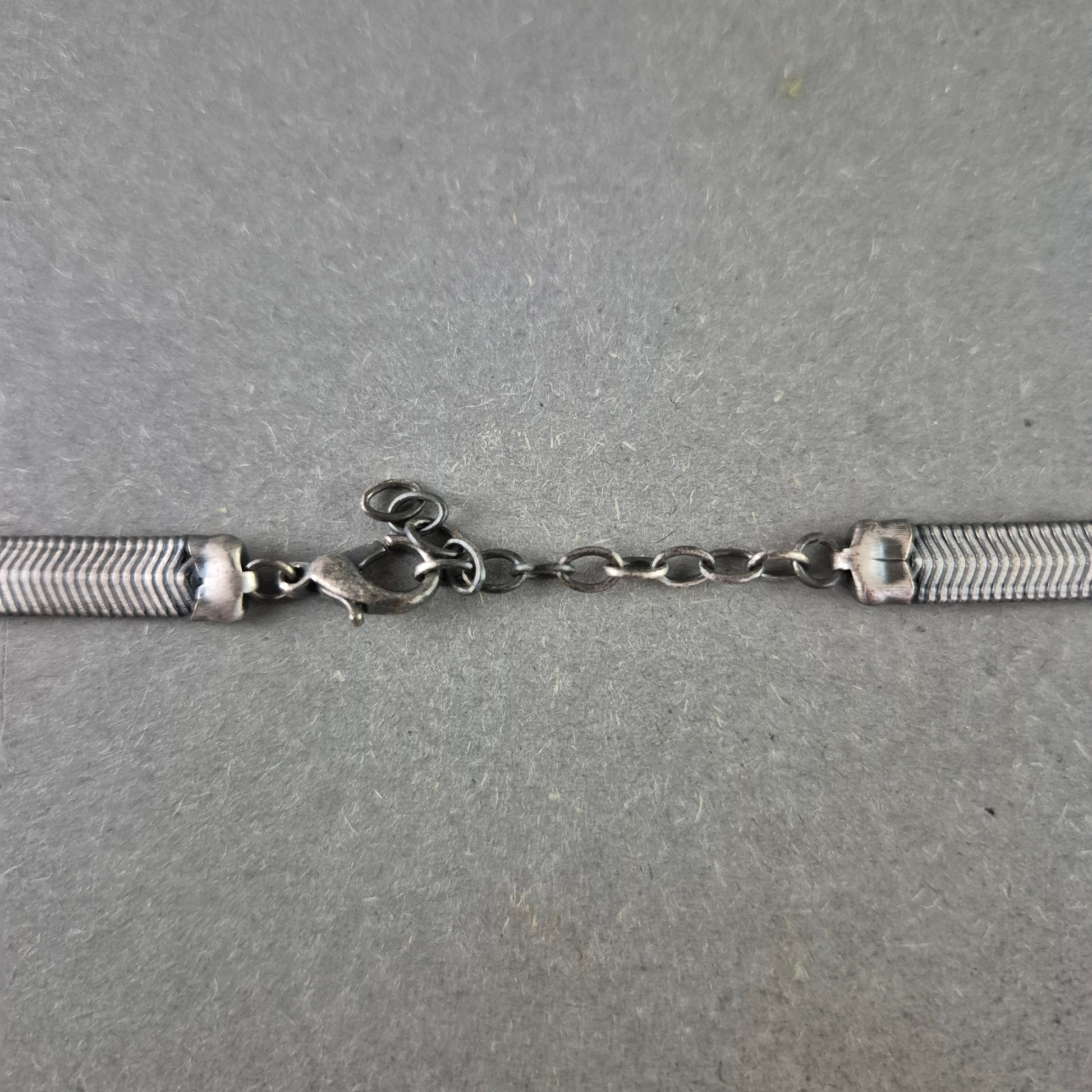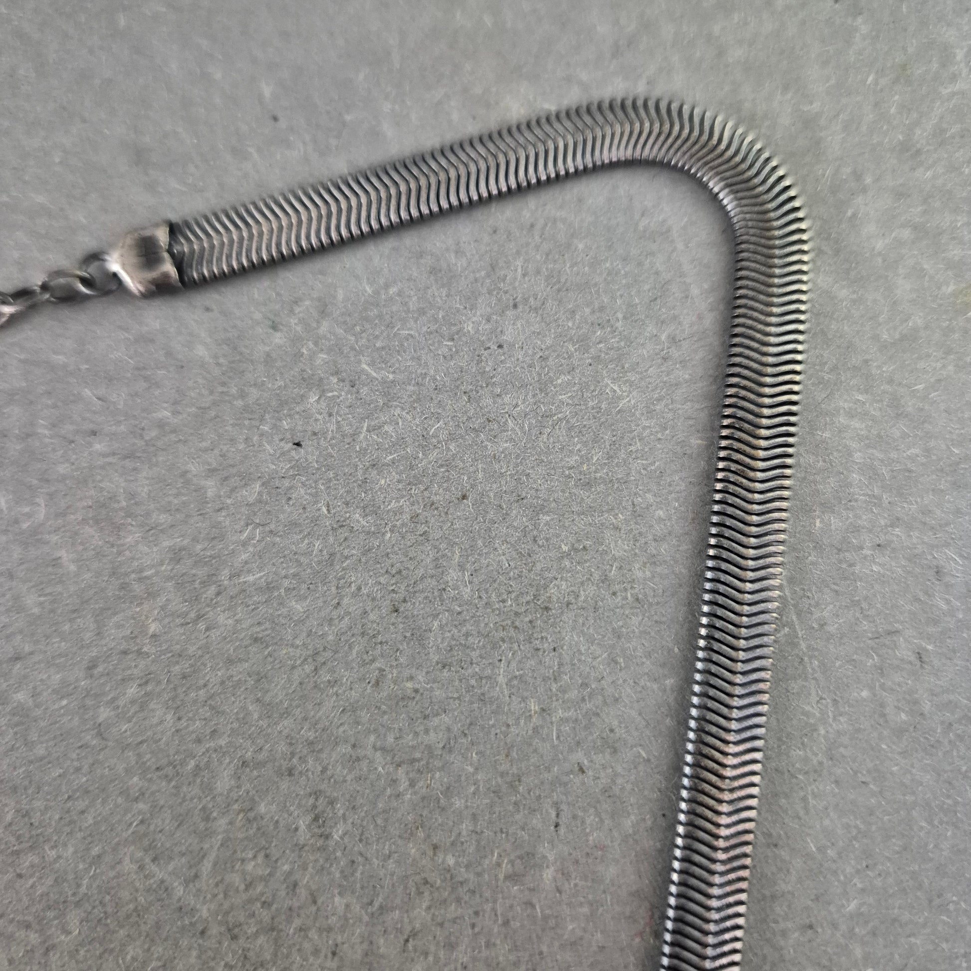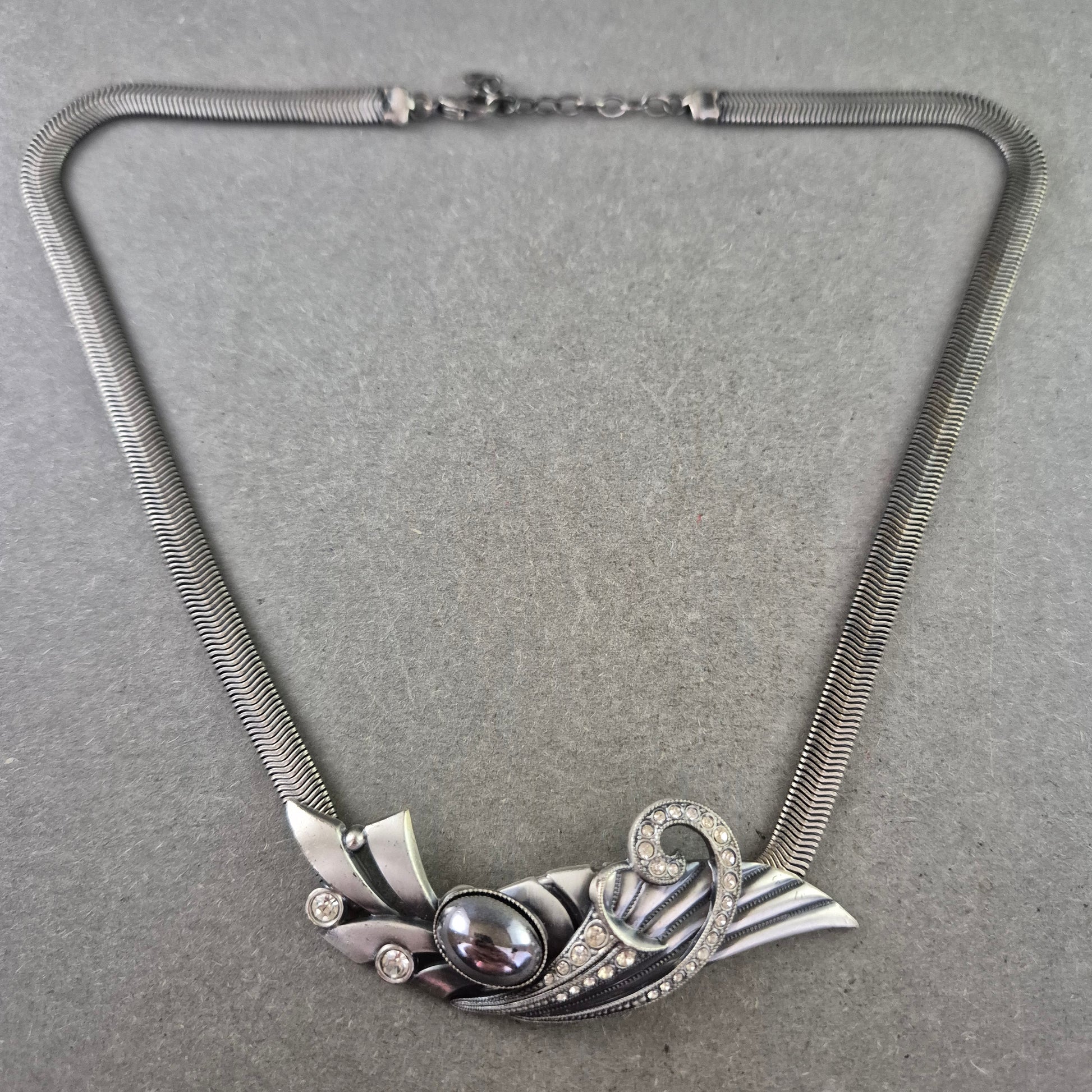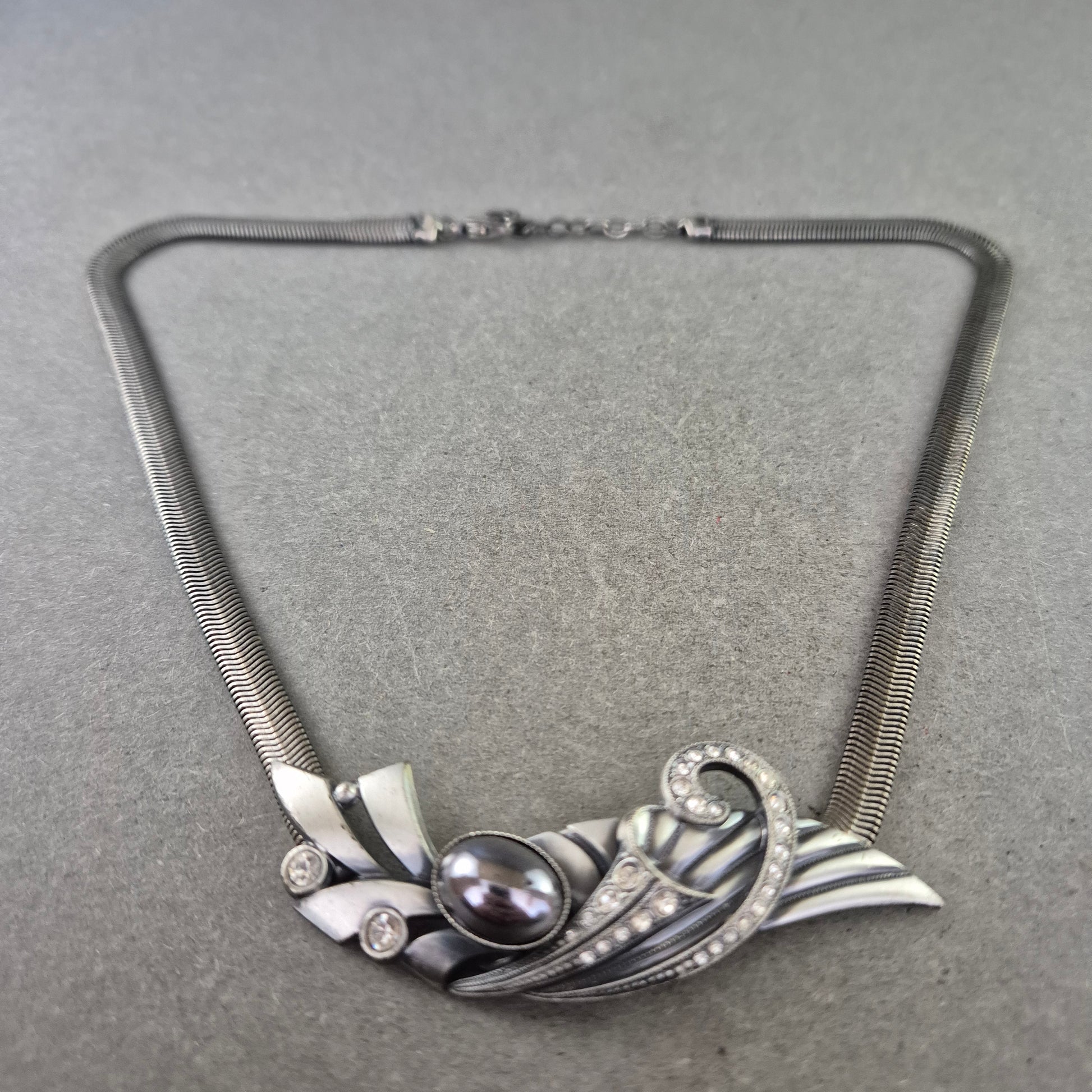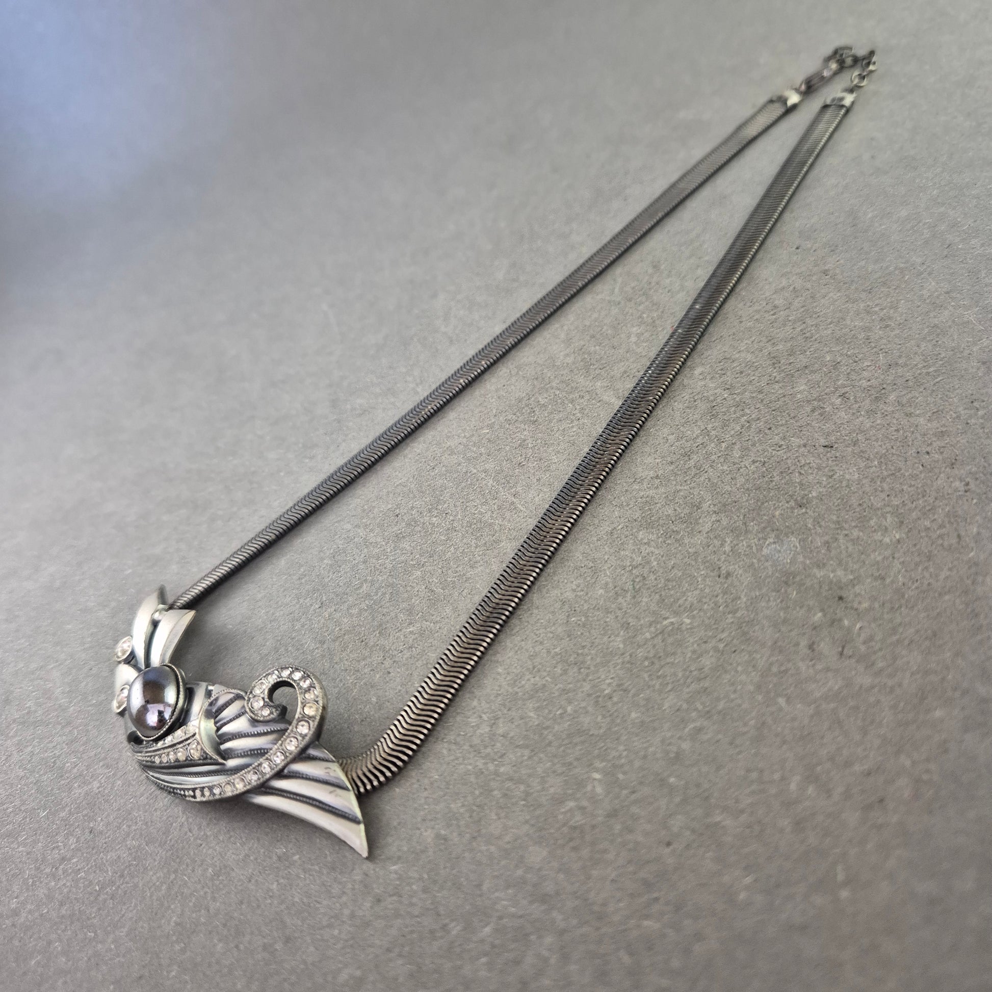 Diese besondere Vintage-Halskette kombiniert ein auffälliges, kunstvoll gestaltetes Mittelstück mit einer dunklen Perle und kleinen Glitzersteinen. Das wellenartige Design aus silberfarbenem Metall wird durch die geschwungene Linienführung und die schimmernde Perle stilvoll in Szene gesetzt. Die flache Schlangenkettenstruktur verleiht der Kette einen eleganten, hochwertigen Look – ideal für den Abend oder besondere Anlässe.