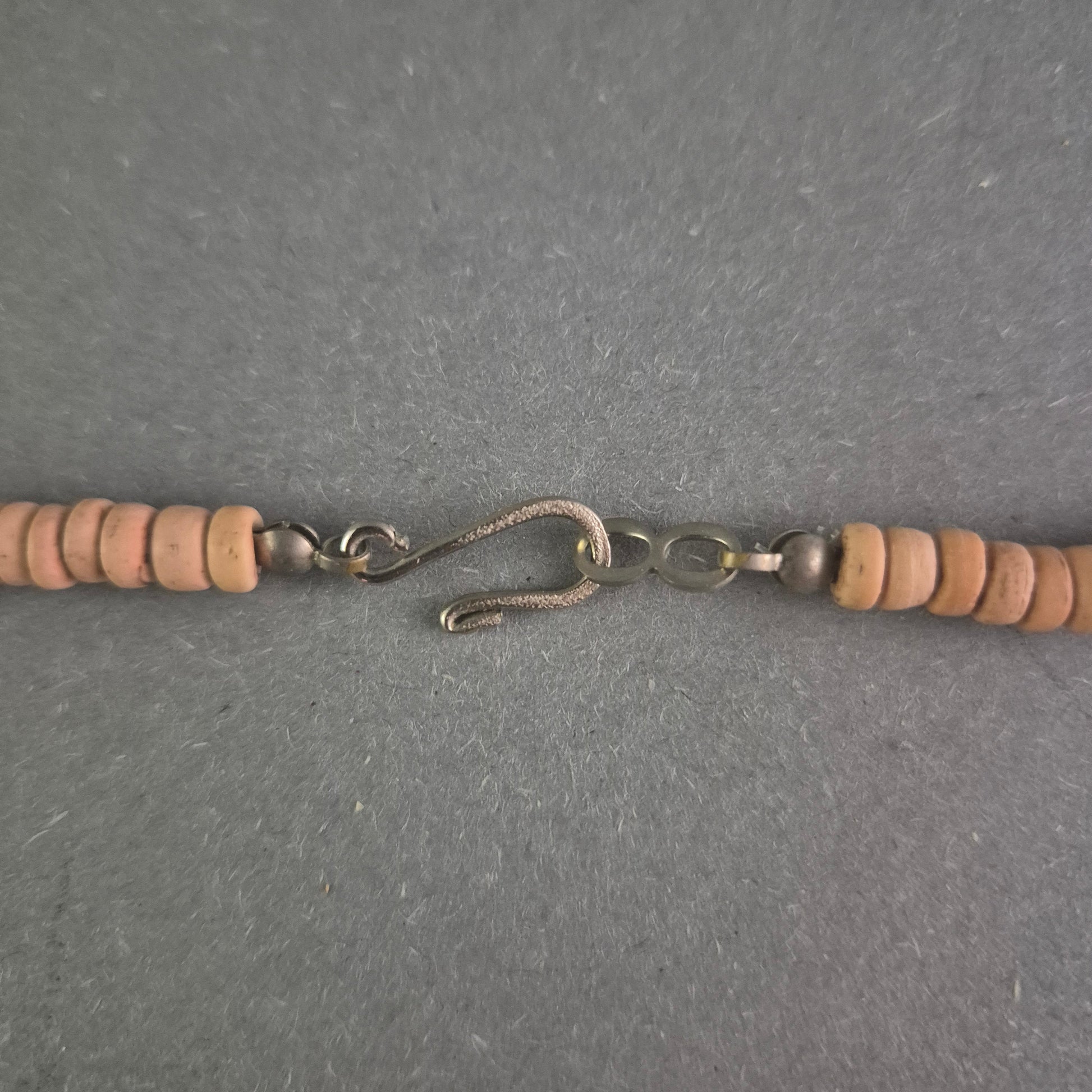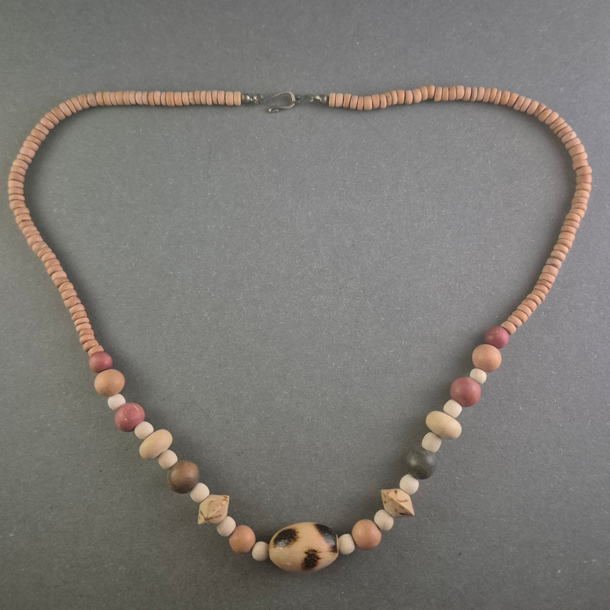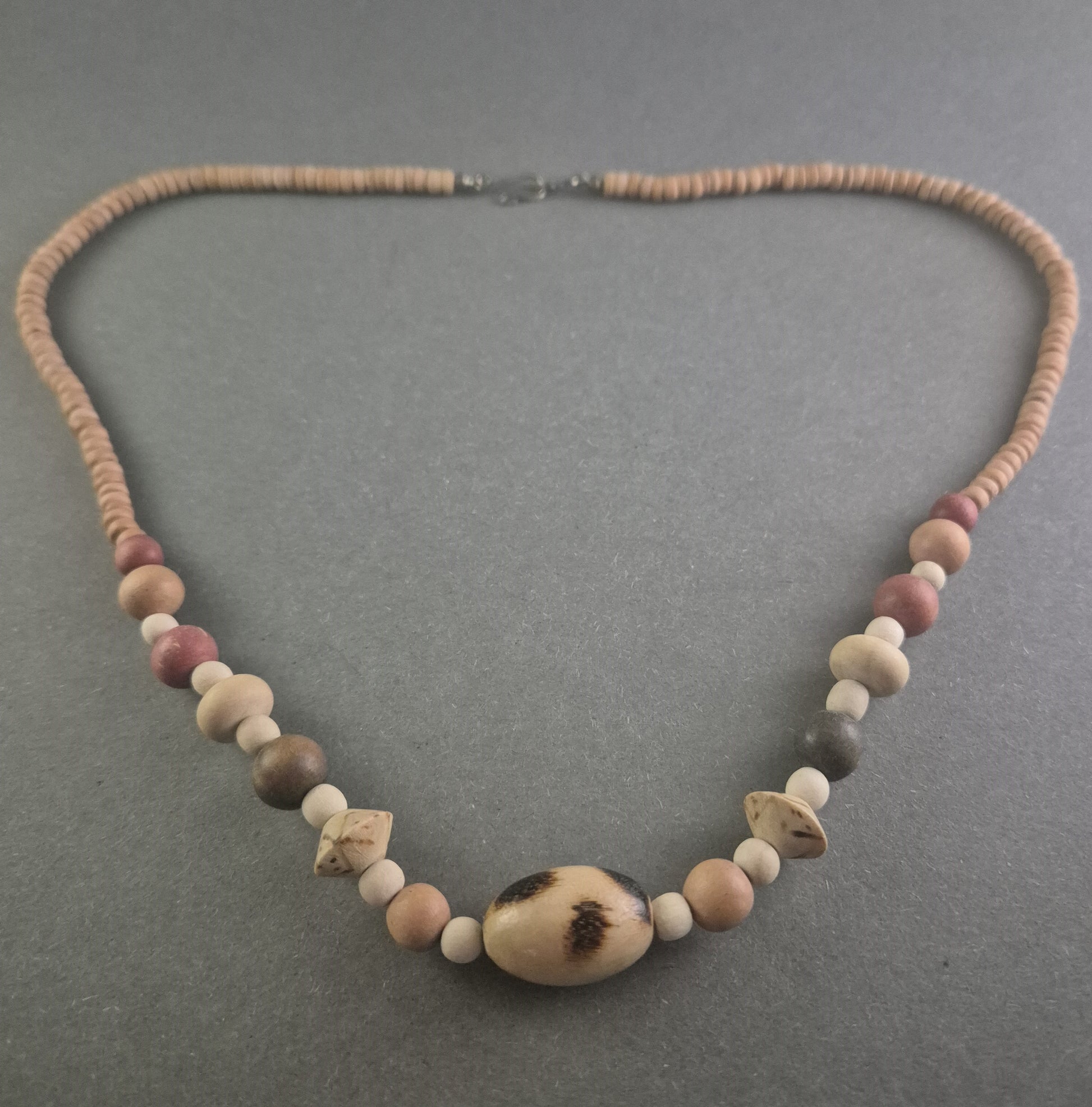 Diese einzigartige Vintage-Halskette besticht durch ihre handgefertigten Holzperlen in warmen Erdtönen. Die harmonische Kombination aus beigen, braunen und rötlichen Nuancen verleiht der Kette einen rustikalen und naturverbundenen Charme. Das leichte und angenehme Tragegefühl macht sie zum idealen Accessoire für lässige und boho-inspirierte Outfits. Der traditionelle Hakenverschluss rundet das Design im authentischen Vintage-Stil ab.