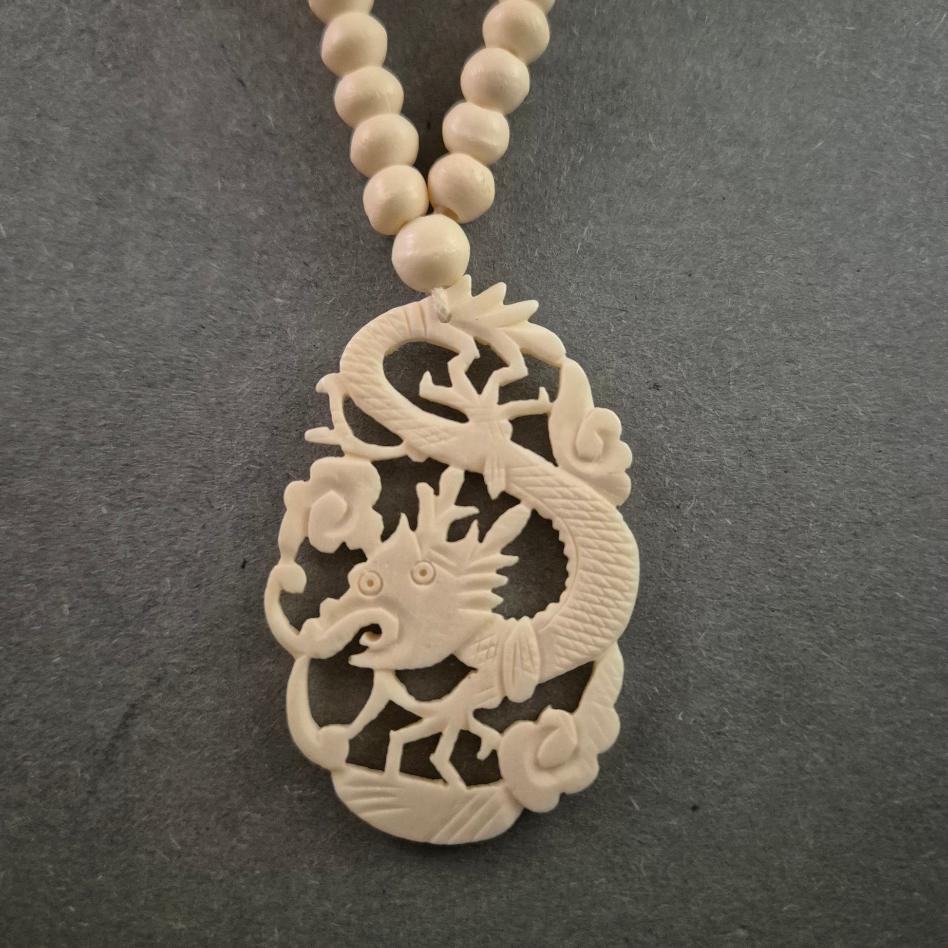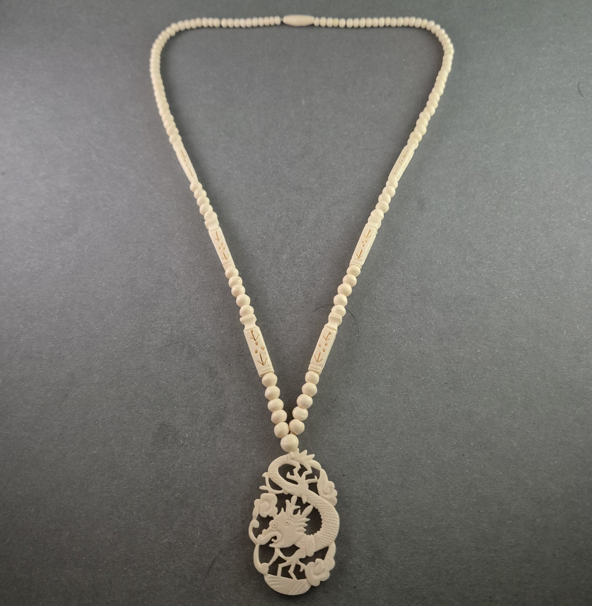Diese beeindruckende Vintage-Kette besticht durch ihren detailreich gearbeiteten Drachenanhänger, der asiatische Symbolik mit kunstvoller Handarbeit vereint. Die sorgfältig gestalteten Perlen und gravierten Zwischenelemente runden das Design ab und verleihen der Kette eine harmonische Balance. Ein einzigartiges Schmuckstück für Liebhaber exotischer Designs und traditioneller Kunst.