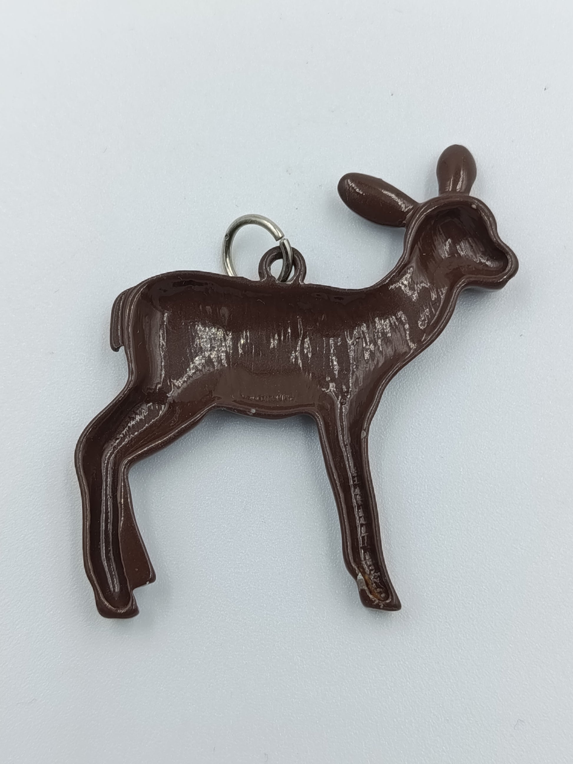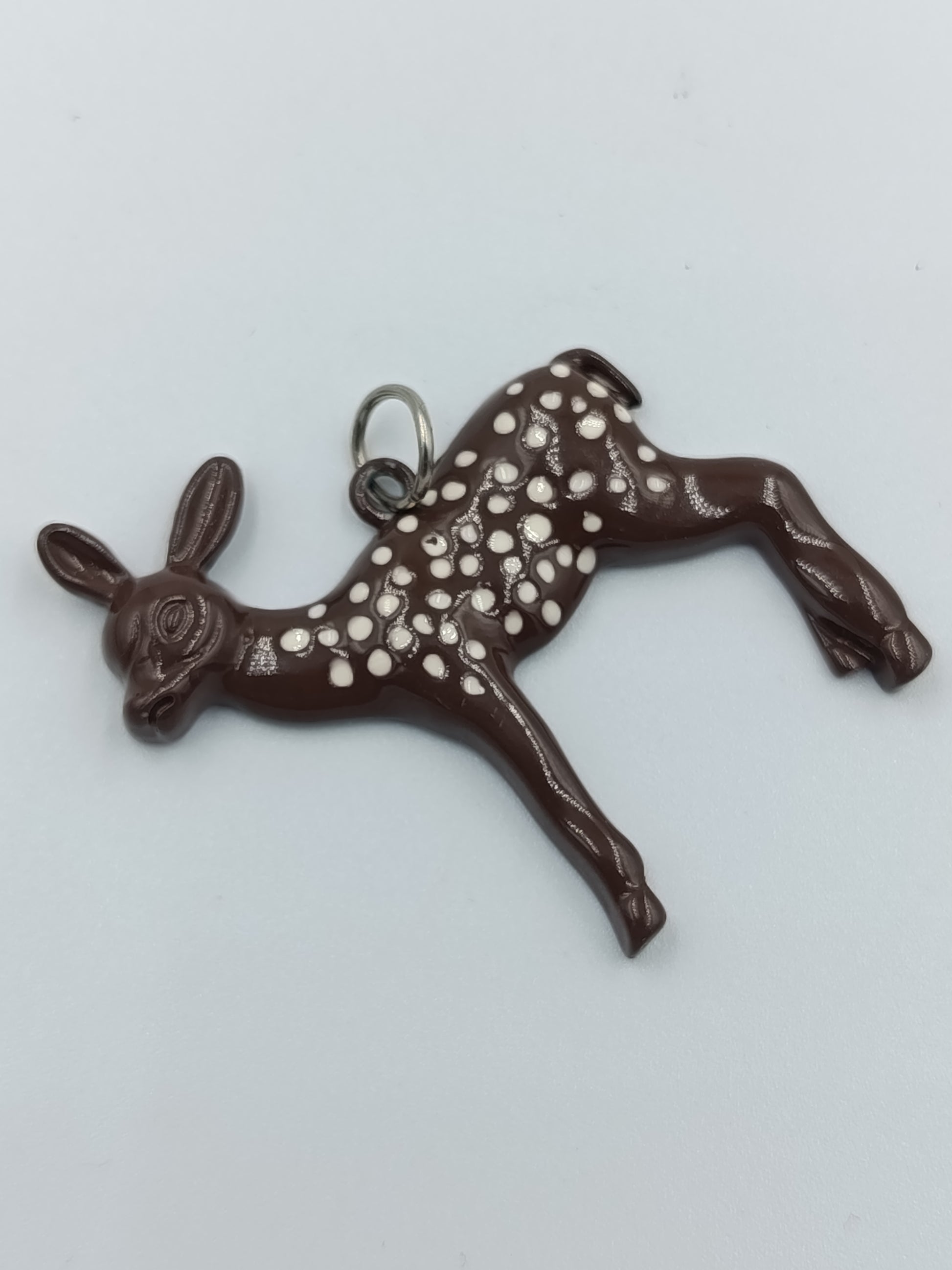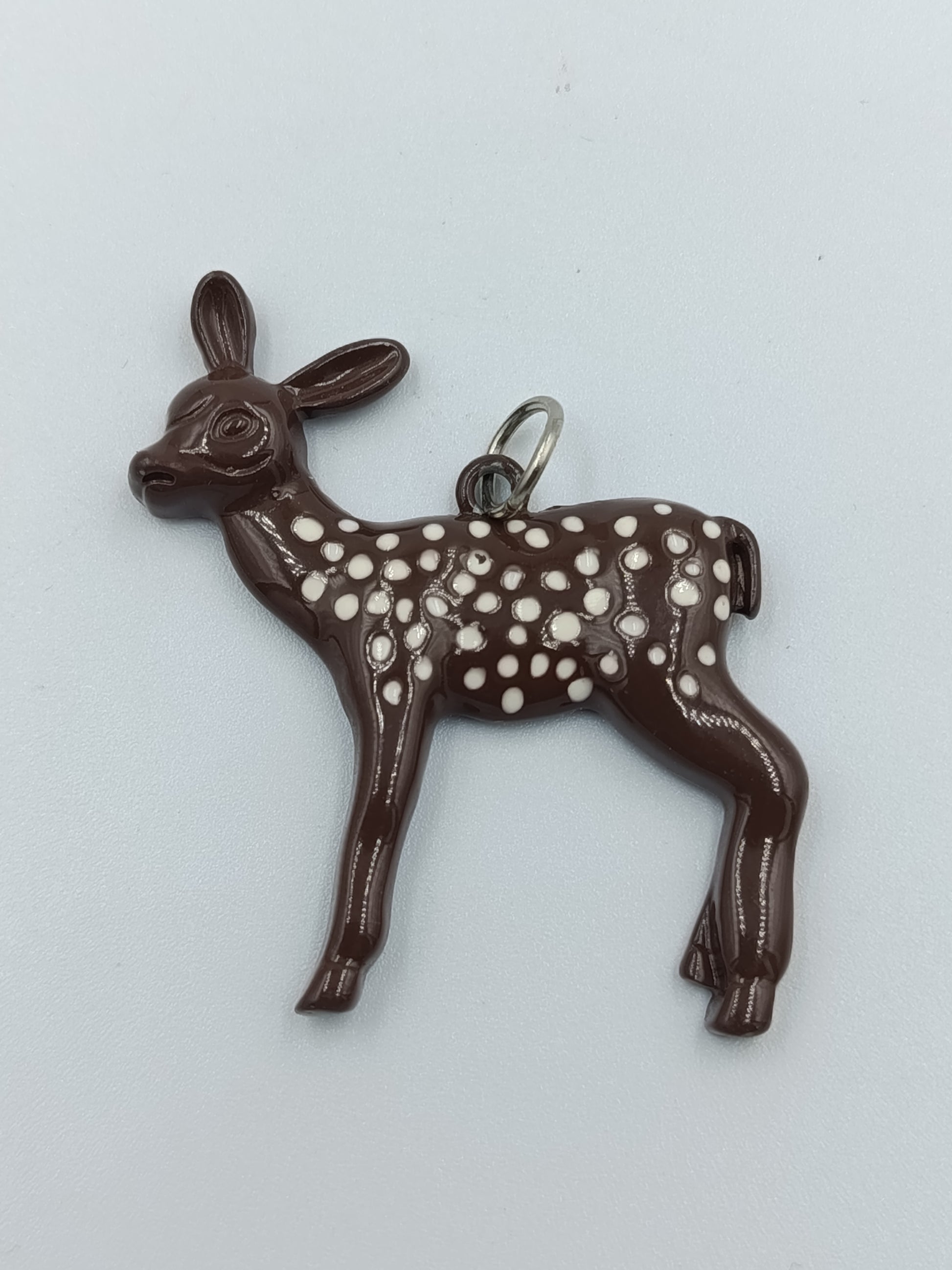 Niedlicher brauner Anhänger in Form eines Rehkitzes mit weißen Punkten. Aus glänzendem Kunststoff gefertigt, beidseitig detailliert gearbeitet. Perfekt als charmantes Accessoire oder Sammlerstück.