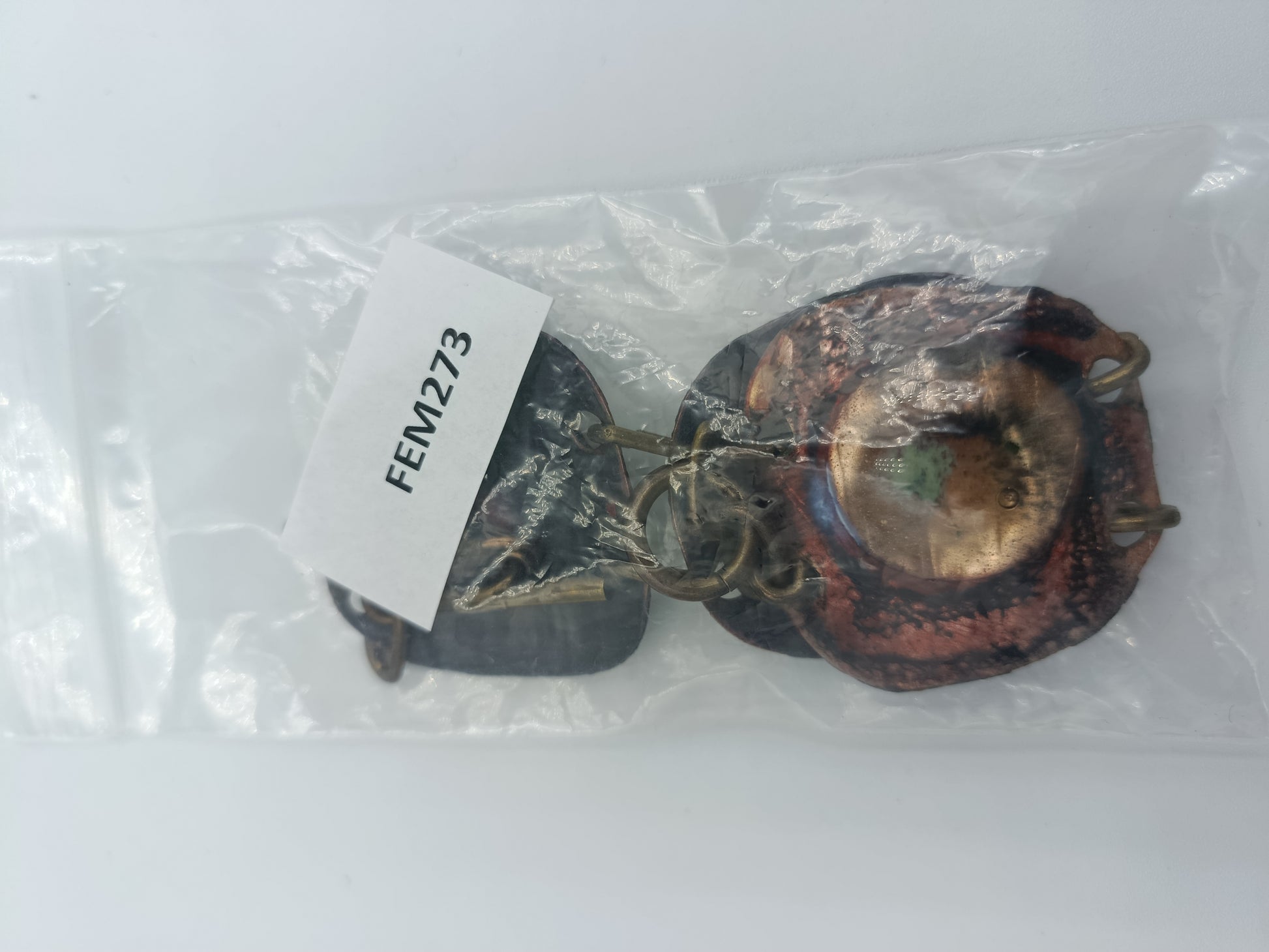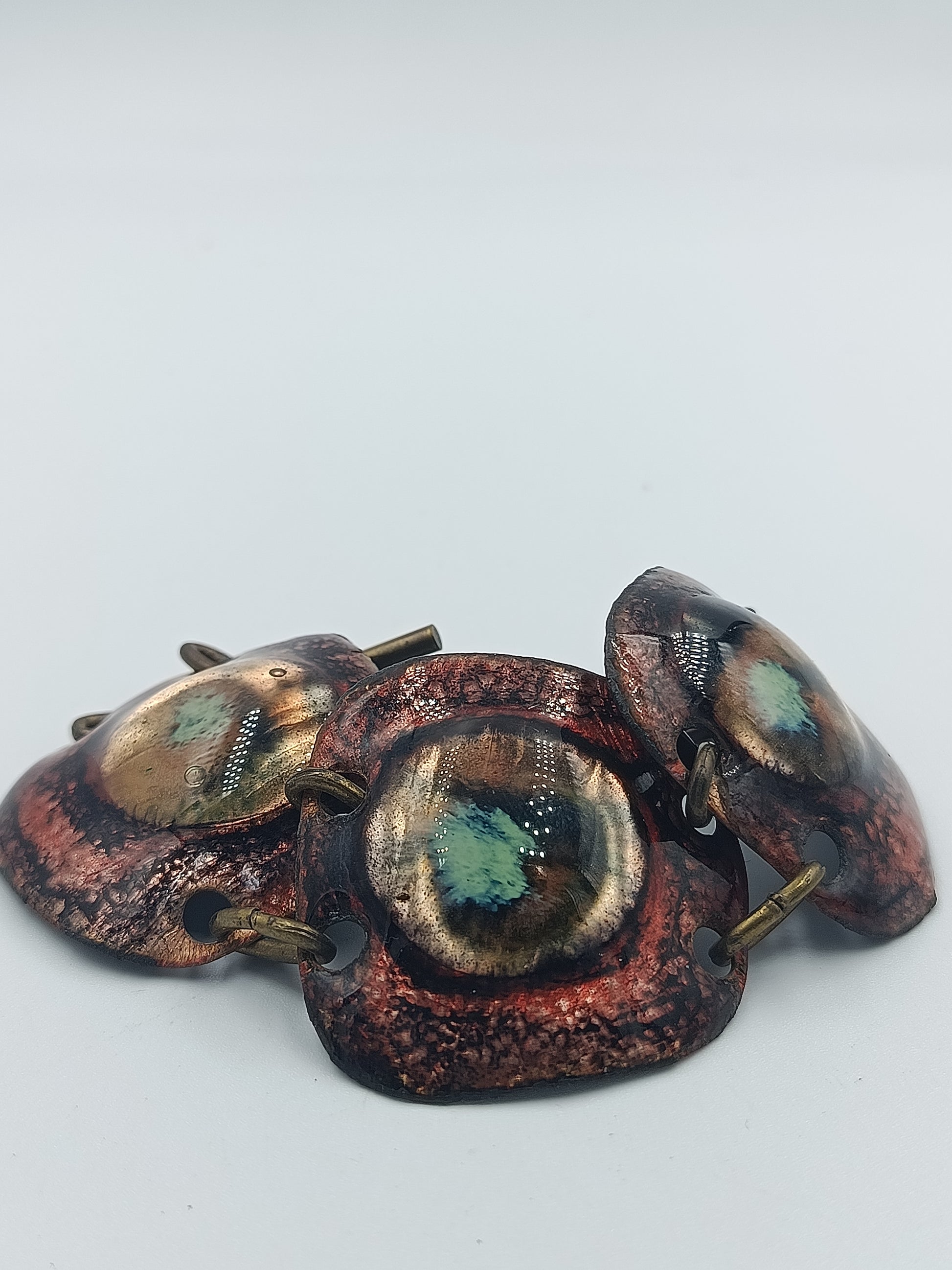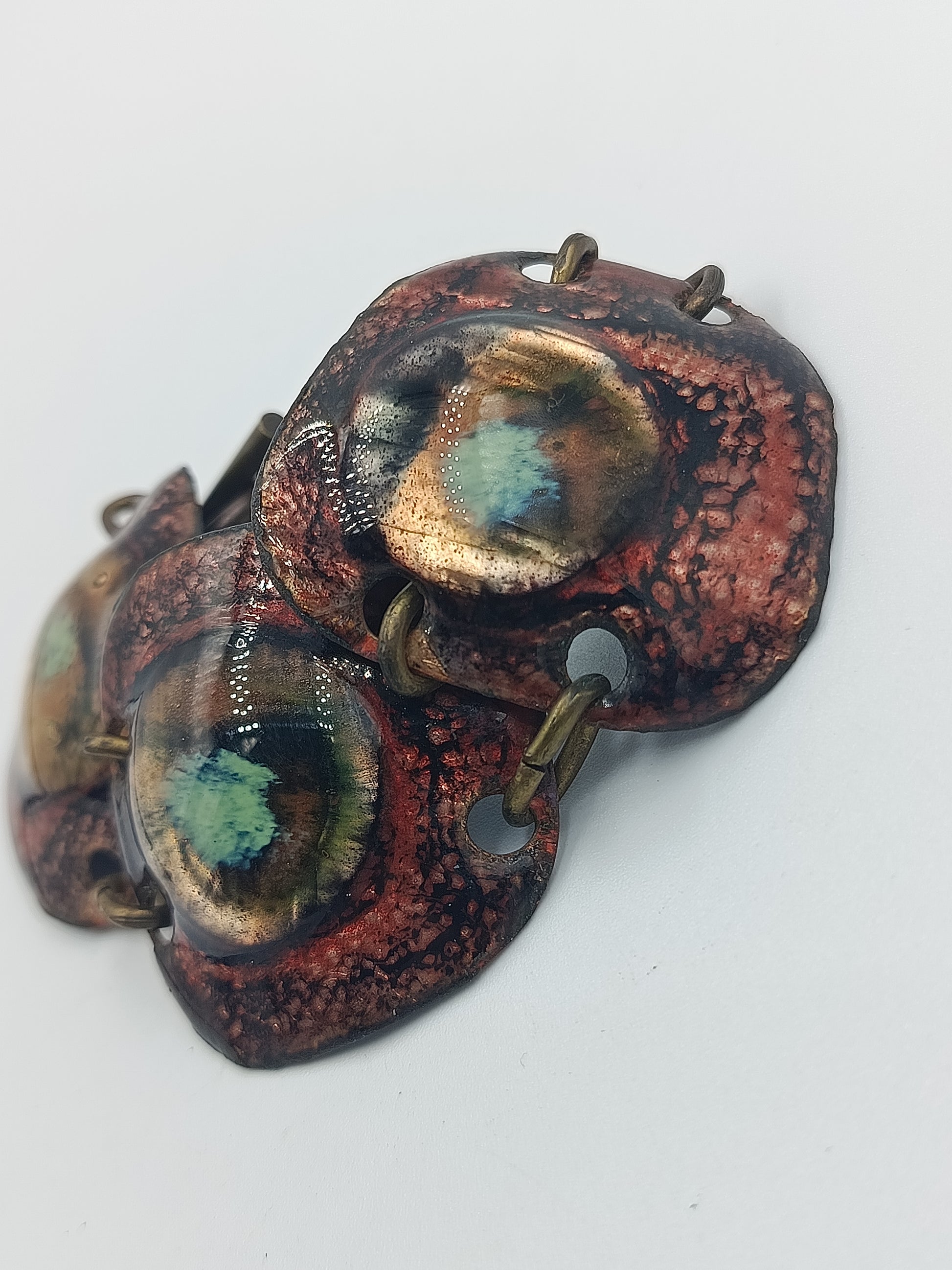 Auffälliges Vintage-Armband aus drei großen, handgearbeiteten Kupferelementen mit emaillierten Einlagen in Grün- und Blautönen. Die Struktur der Elemente ist bewusst rustikal gehalten, was dem Schmuckstück einen einzigartigen, künstlerischen Look verleiht. Verbunden sind die Elemente mit massiven Gliedern in Antikmessing-Optik.