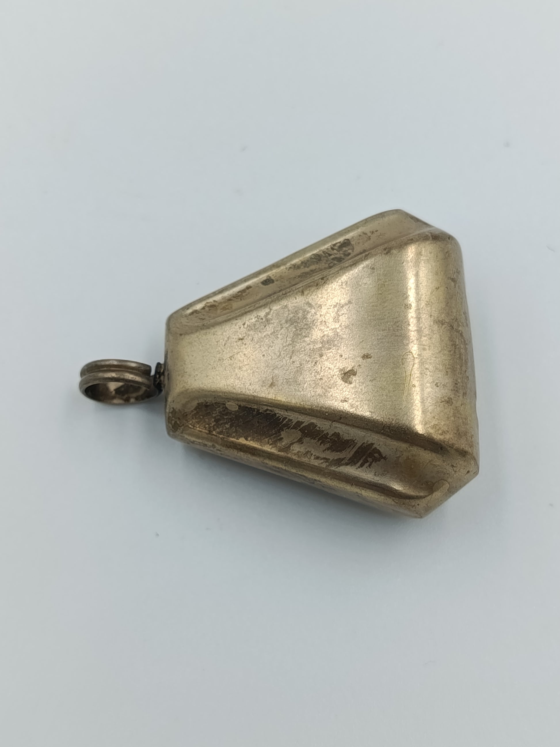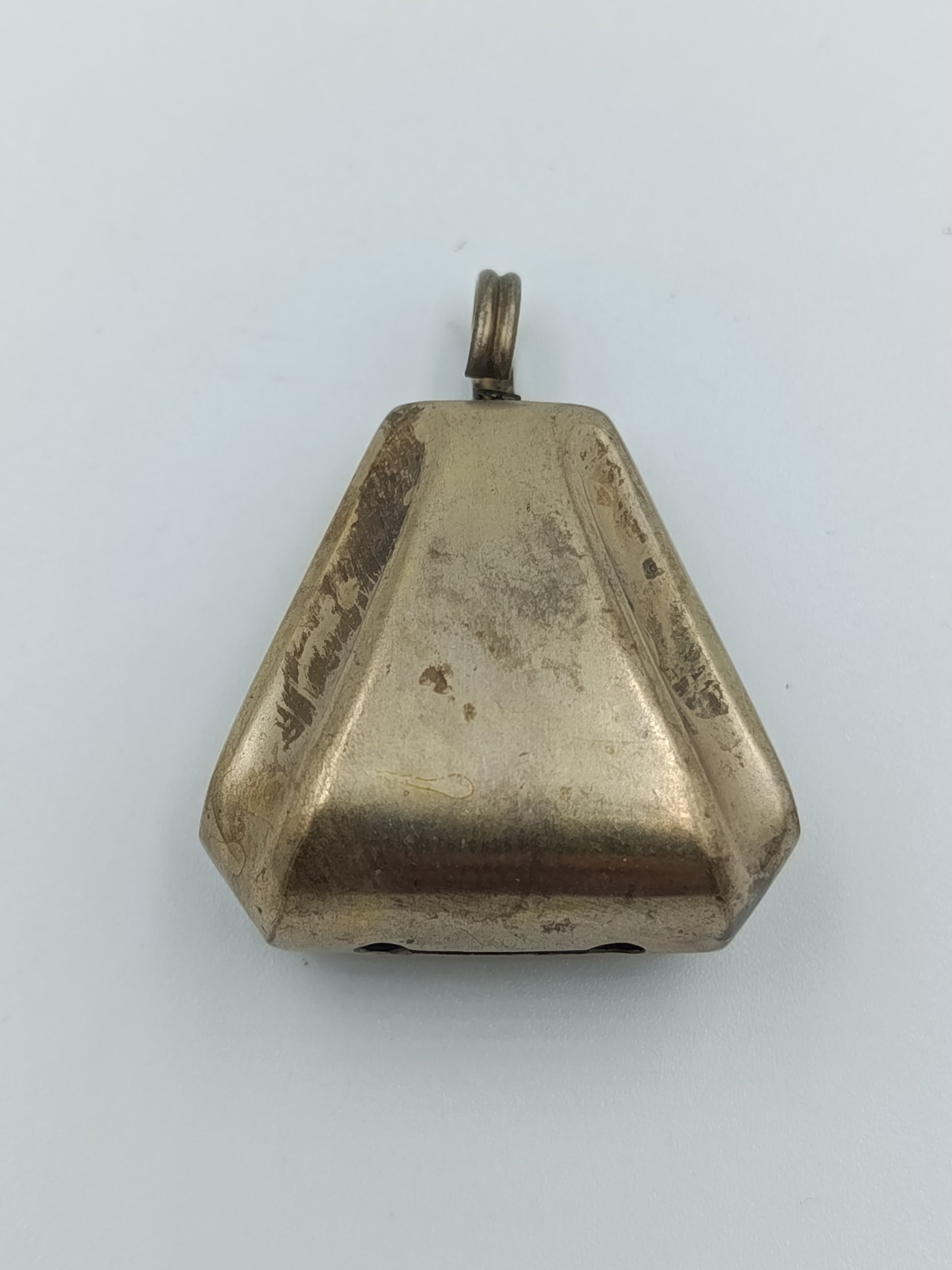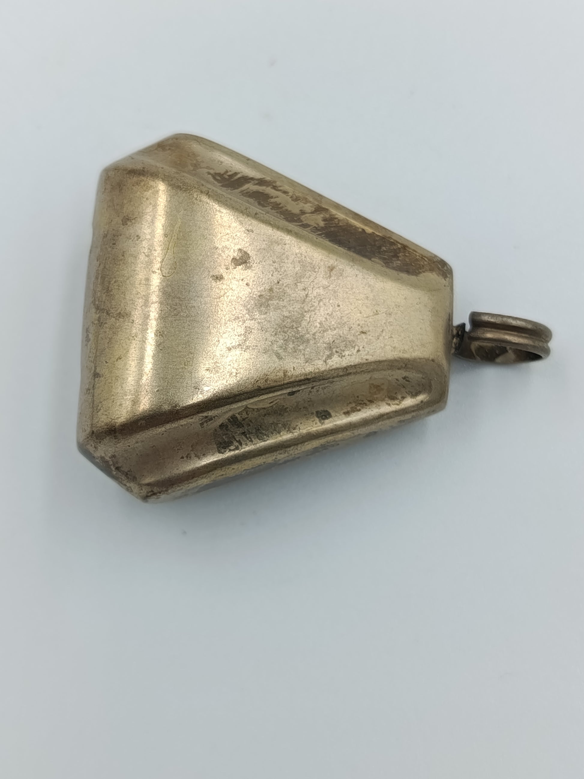 Charmanter, kleiner Glockenanhänger aus Metall, der einen sanften Klang erzeugt. Die Oberfläche zeigt eine schöne, natürliche Patina, die dem Stück einen rustikalen, authentischen Charakter verleiht. Ideal als Sammlerstück oder dekorativer Anhänger.