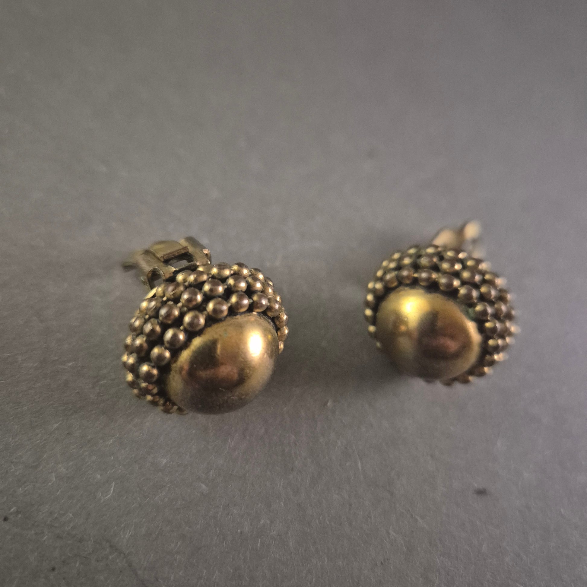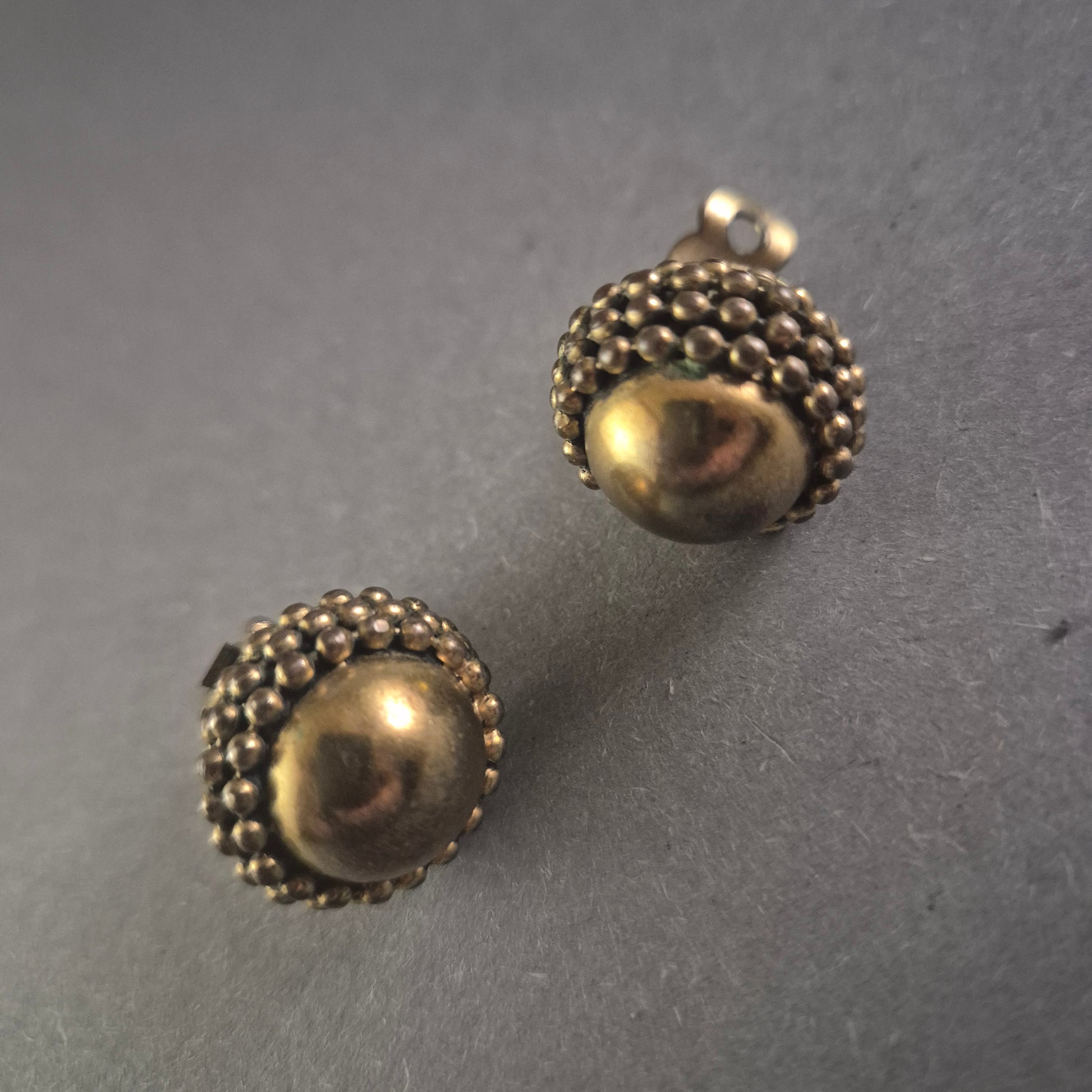 Diese stilvollen Vintage-Ohrclips beeindrucken durch ihr charmantes, kugelbesetztes Design in Messingoptik. Die runde, gewölbte Form mit detailreicher Noppenstruktur verleiht den Clips einen antiken Charakter. Dank der stabilen Clipverschlüsse sitzen sie angenehm und sicher am Ohr – perfekt für Liebhaber von Retro-Schmuckstücken.
