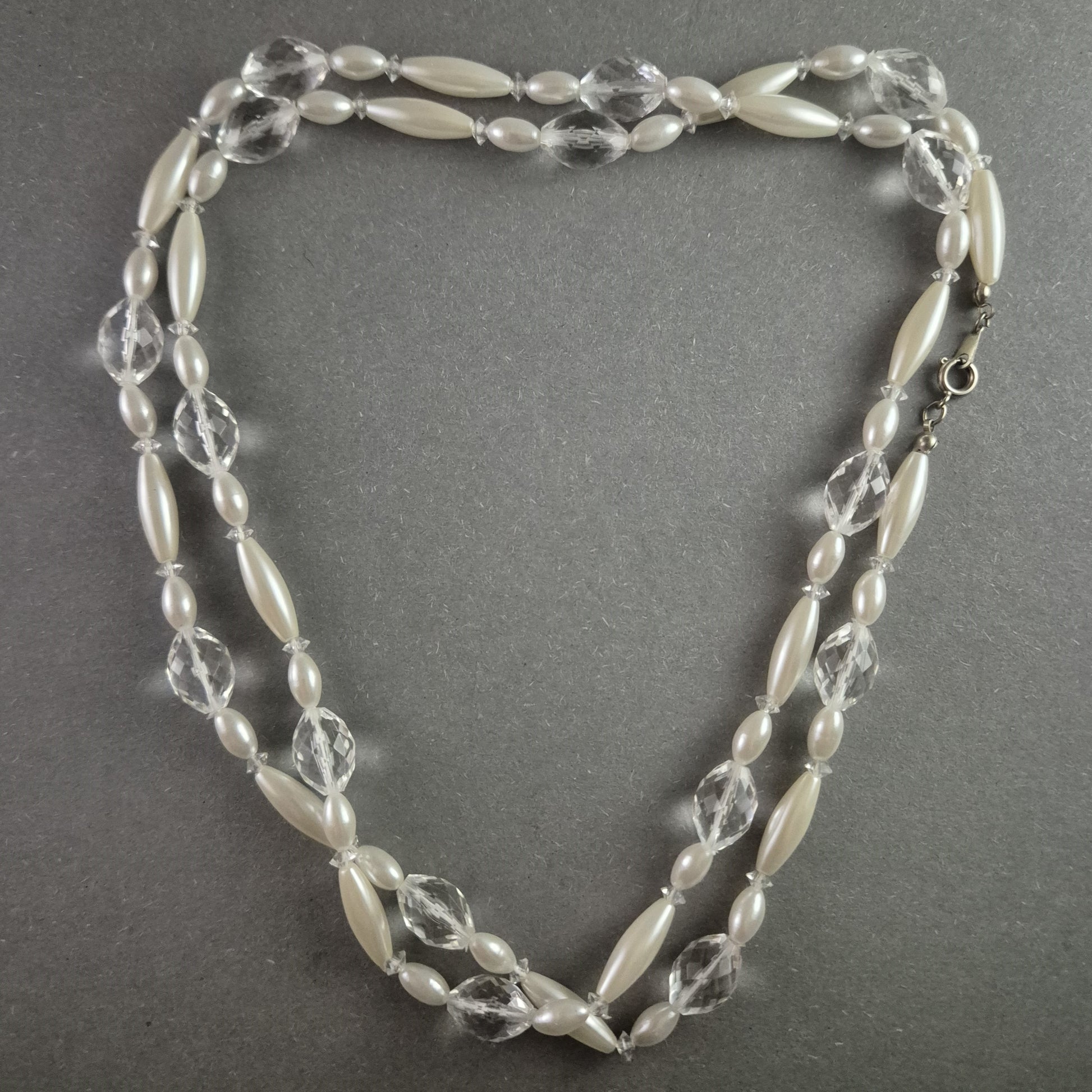 Diese wunderschöne vintage Perlenkette besticht durch ihr edles Design und eine harmonische Kombination aus cremefarbenen Kunstperlen und facettierten Kristallperlen. Die zweireihige Anordnung verleiht ihr eine besondere Eleganz, während der klassische Federringverschluss für sicheren Halt sorgt. Ein stilvolles Accessoire für besondere Anlässe oder als zeitlose Ergänzung zu jedem Outfit.
