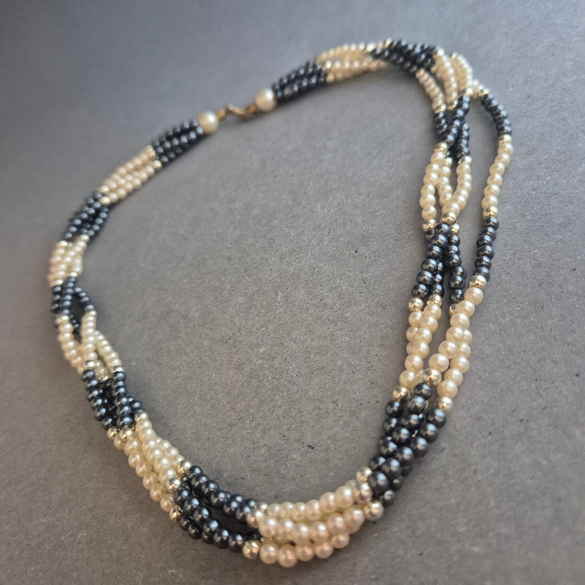 Vintage Perlenkette in Schwarz-Crème – Gedrehte Mehrstrangoptik