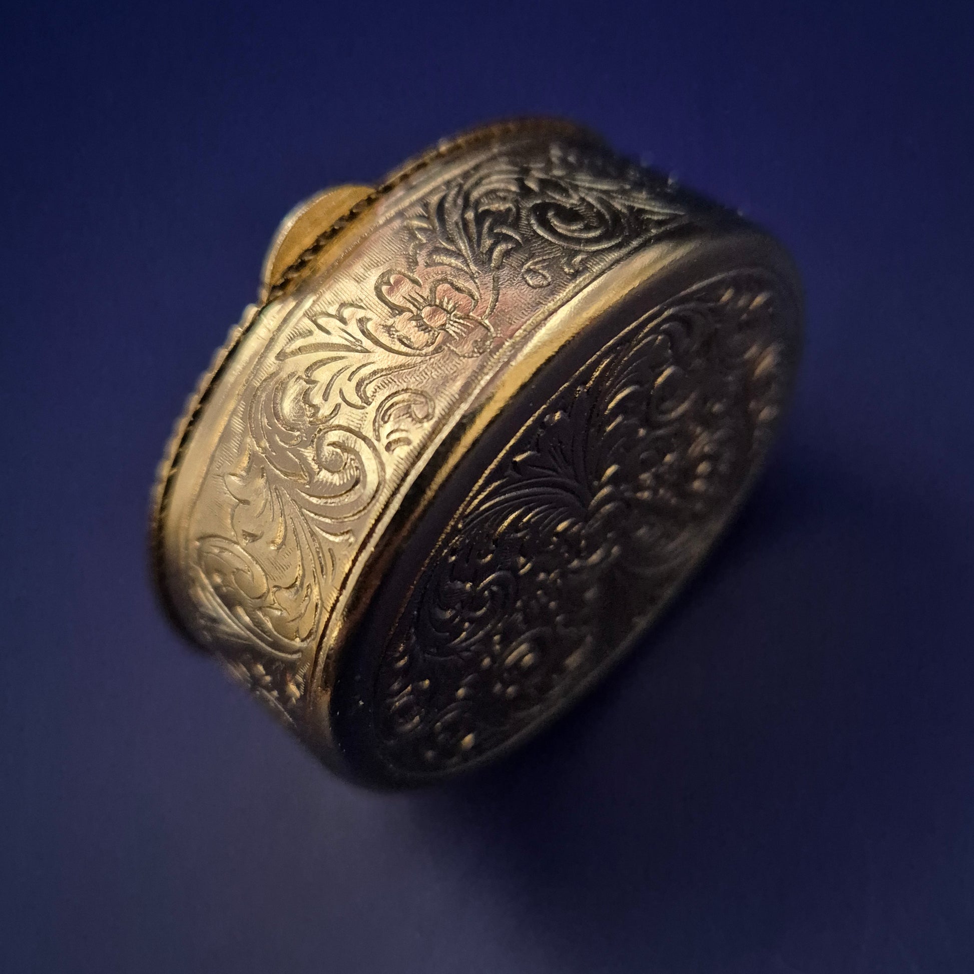 Diese elegante, ovale Pillendose im Vintage-Stil vereint romantische Rokoko-Malerei mit kunstvollen Gravuren. Der Deckel ist mit einer charmanten Szene aus dem 18. Jahrhundert verziert, während die Rückseite und Seitenflächen ein aufwendig geprägtes florales Muster zeigen. Die Dose eignet sich ideal als dekoratives Sammlerstück oder als originelles Geschenk.