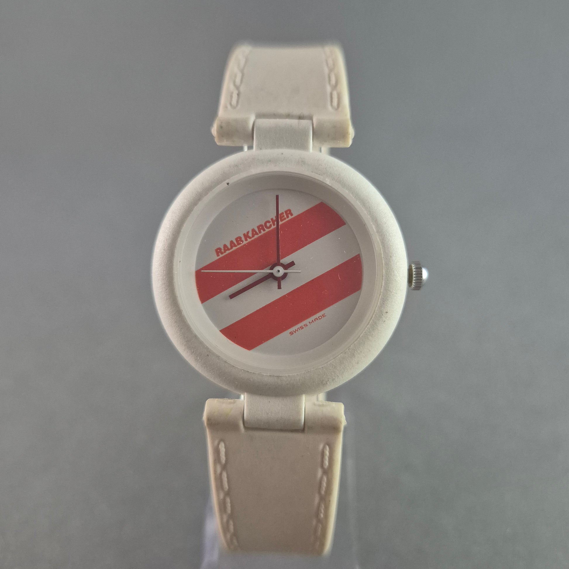 Diese Vintage-Armbanduhr von Raab Karcher besticht durch ihr auffälliges Retro-Design mit rot-weißen Streifen auf dem Zifferblatt. Hergestellt in der Schweiz, vereint sie präzise Handwerkskunst mit einem einzigartigen, markanten Look. Das weiße Kunststoffgehäuse und das passende Armband verleihen der Uhr einen sportlichen und gleichzeitig klassischen Stil, der ideal für Sammler und Liebhaber außergewöhnlicher Zeitmesser ist.