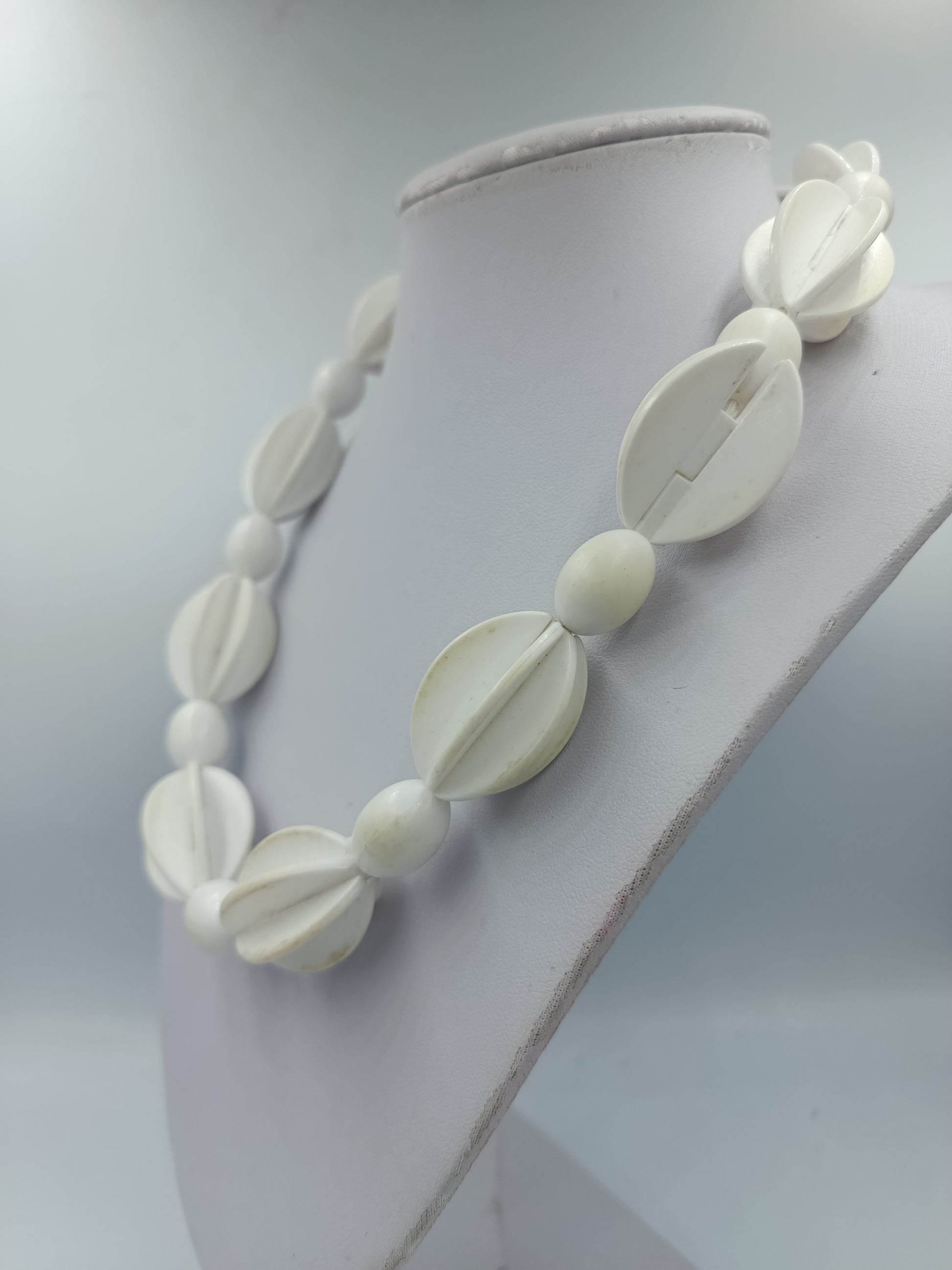 Schöne Vintage-Halskette aus großen weißen Kunststoffperlen in verschiedenen geometrischen Formen. Der puristische Stil erinnert an Retro-Designs der 70er/80er Jahre und lässt sich vielseitig kombinieren – ideal zu sommerlicher Kleidung oder minimalistischen Outfits.