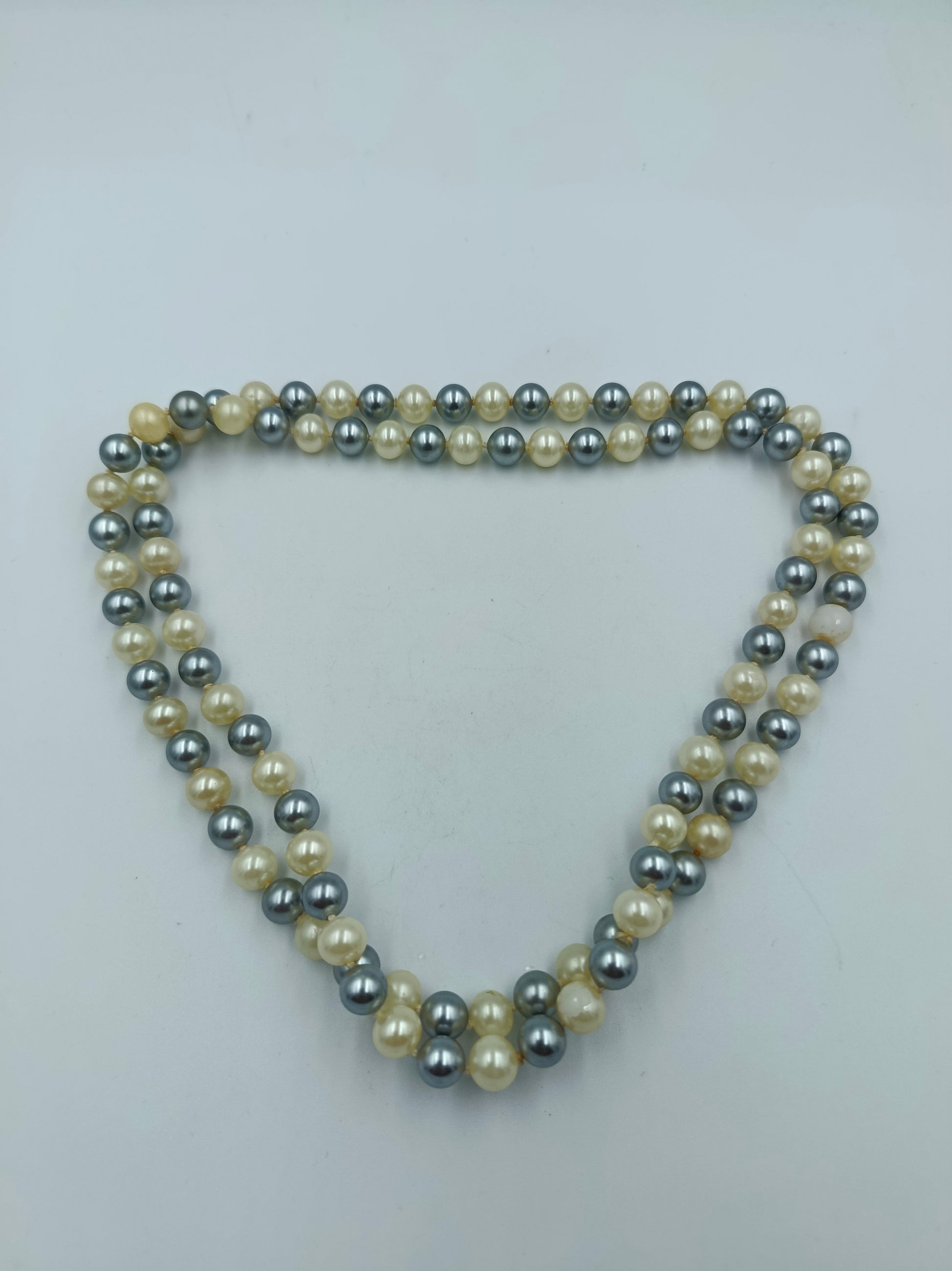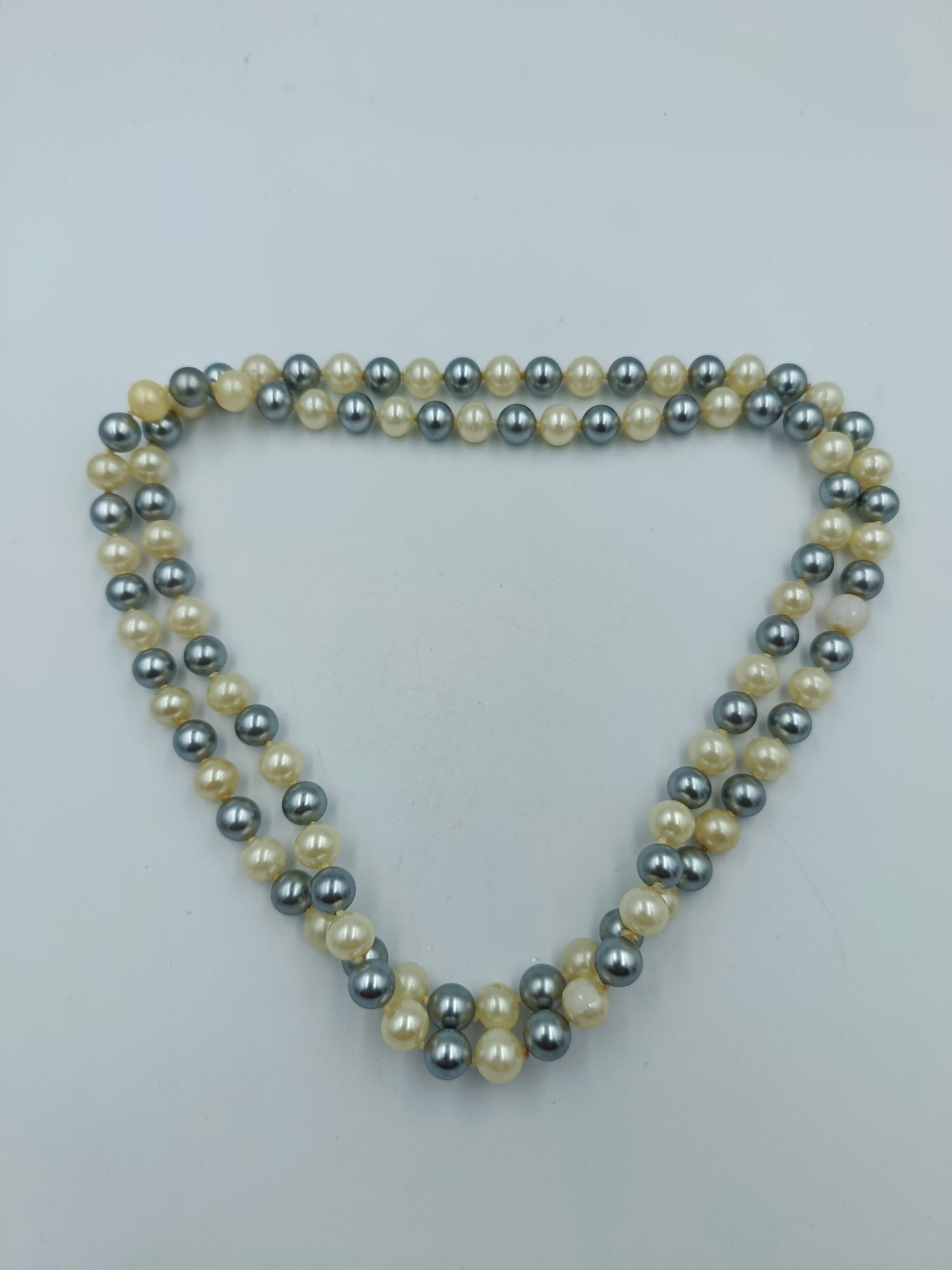 Elegante, zweireihige Halskette aus cremefarbenen und grauen Imitationsperlen. Das harmonische Farbspiel verleiht der Kette eine klassische und zugleich moderne Note. Perfekt geeignet für festliche Anlässe oder als stilvolles Accessoire zum Business-Outfit.
