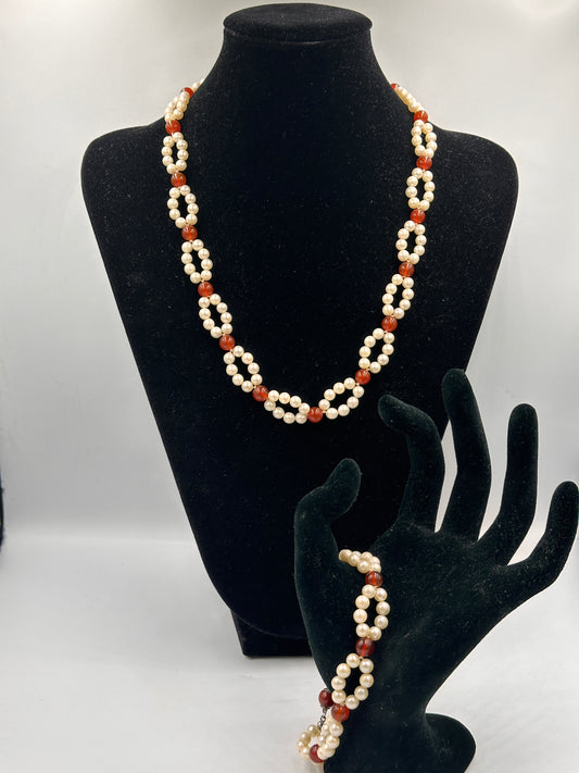 2-Strang Perlenkette Weiß mit Rot-Orangen Akzenten inklusive Armband