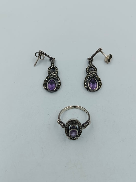 925 Silber Schmuckset mit Amethyst und Markasiten Ring und Ohrringe Vintage Design