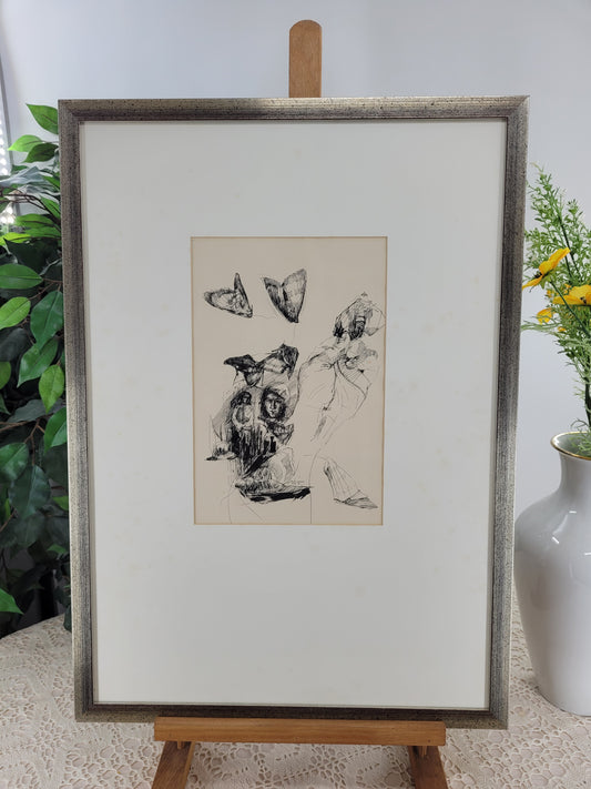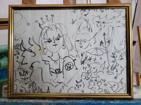Expressive Zeichnung mit 2 gekrönten Frauen und abstrakten Motiven