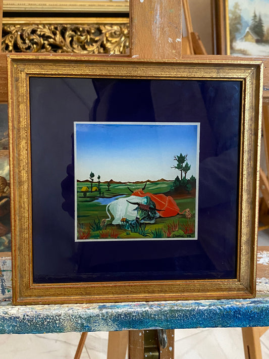 Dodic (XX) Gemälde Naiv Surreale Szene Landschaft mit Stieren 22x22cm
